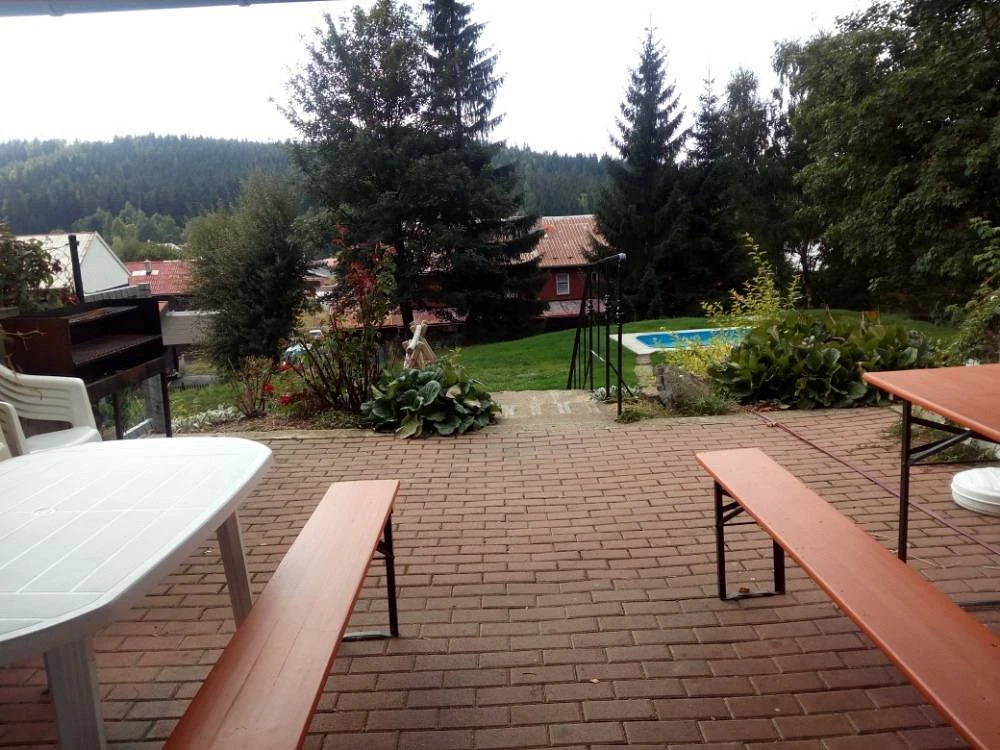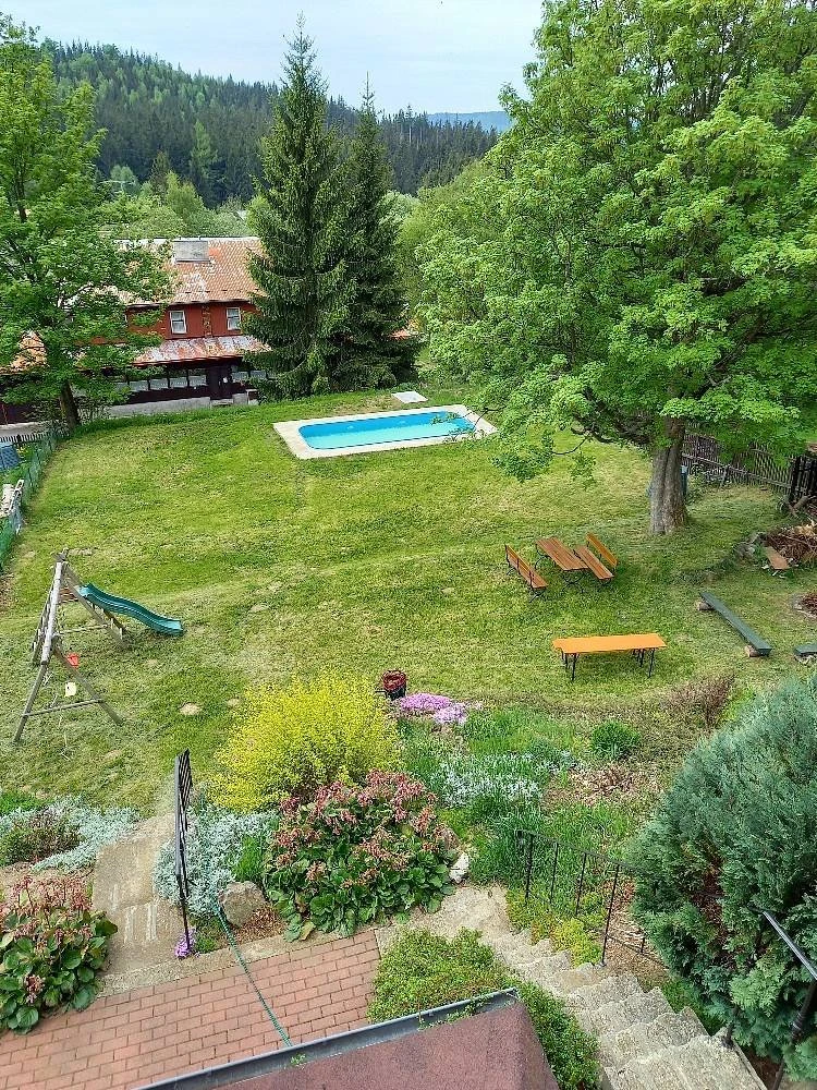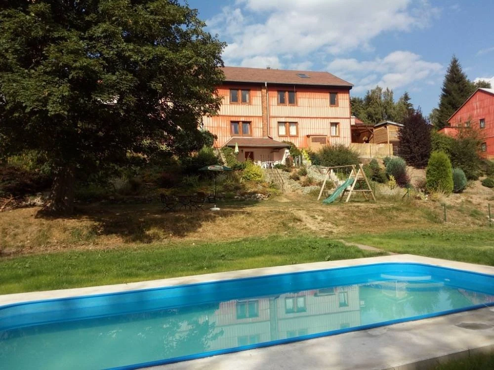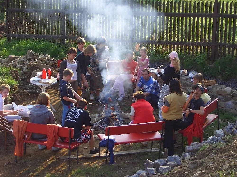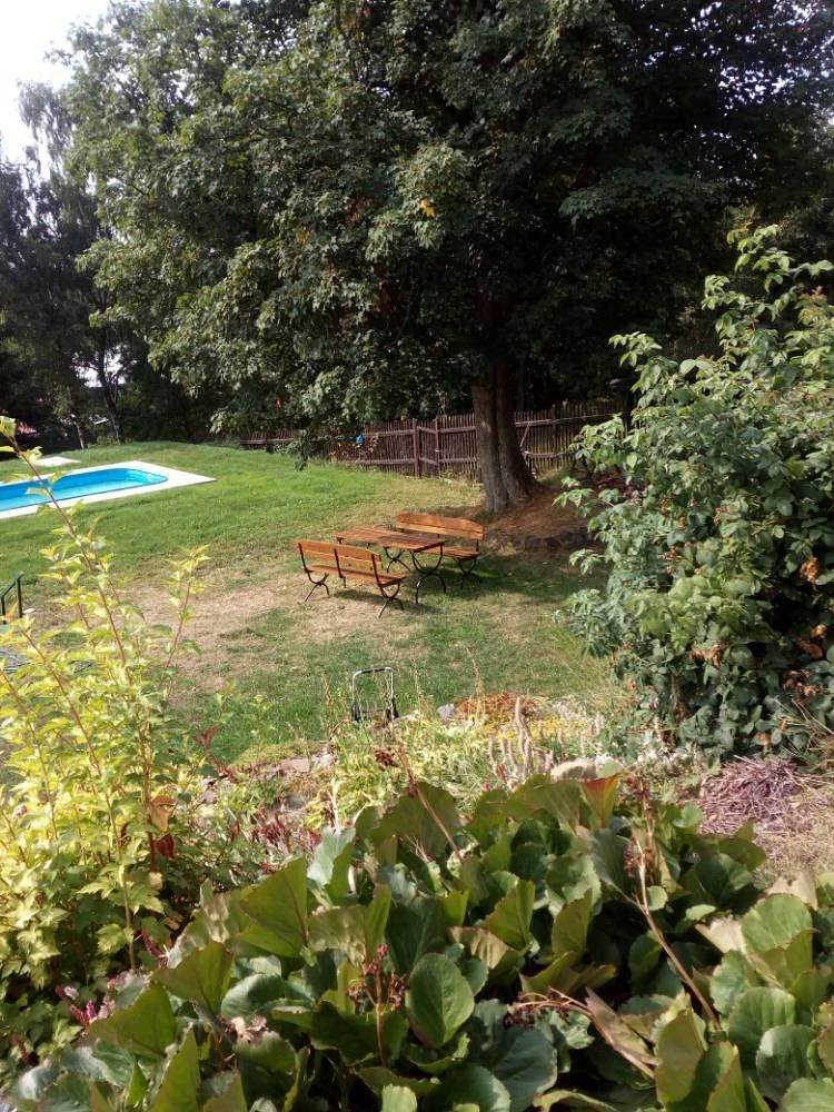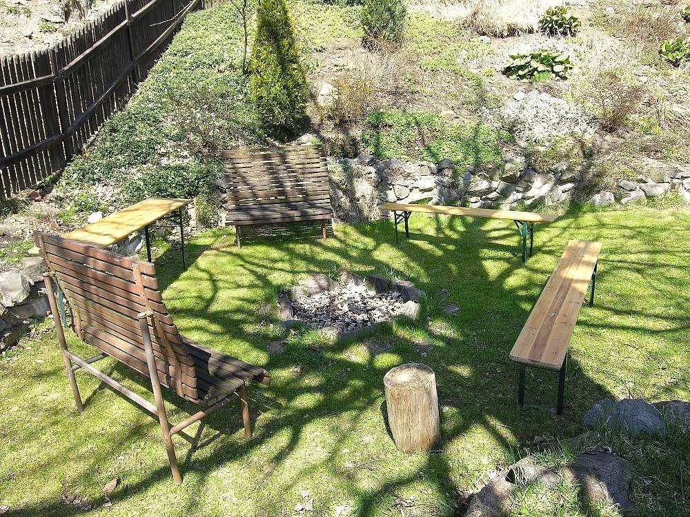 Venkovní vybavení: terasa, bazén, zahradní nábytek, ohniště, gril, houpačka a jiné dětské hry.