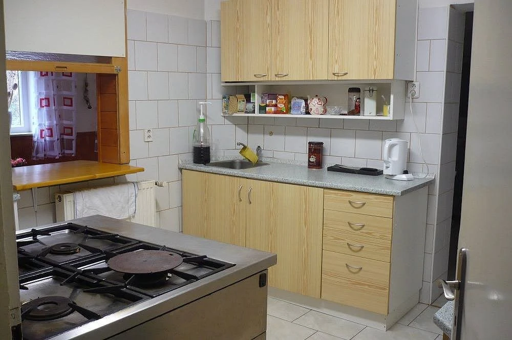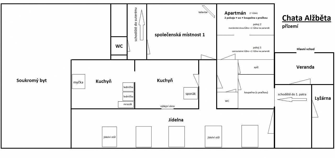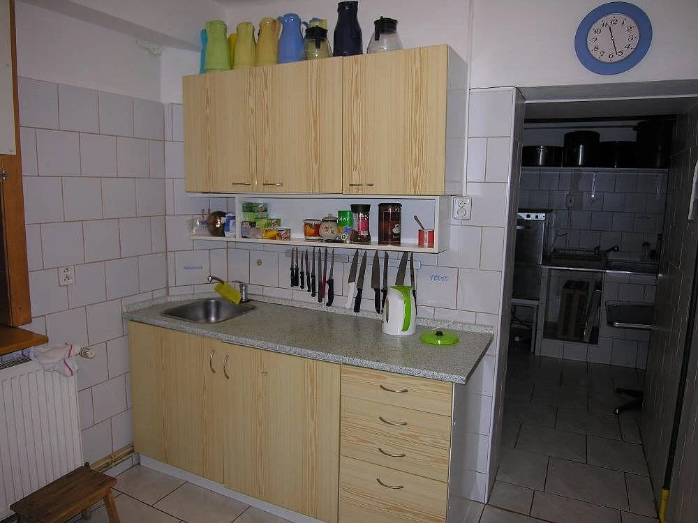 Chata je vybavena plně vybavenou kuchyní, která zahrnuje plynový sporák s elektrickou troubou, mikrovlnnou troubu, varnou konvici, kávovar, mixér, topinkovač, toastovač, lednici, mrazák a profesionální myčku nádobí s cyklem cca 2 minuty. Kuchyně disponuje veškerým nádobím pro kapacitu cca 40 osob.
