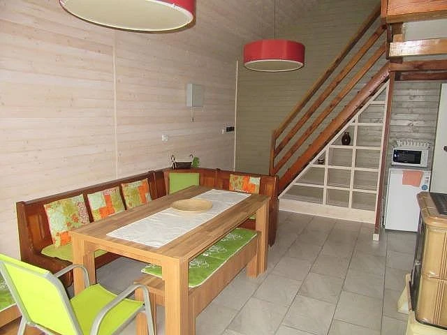 Součástí chaty je společenská místnost s jídelním posezením a vnitřním krbem, která slouží jako hlavní obytný prostor. K dispozici je vybavená kuchyňka určená k vaření i stravování. Po vstupu do objektu se nachází předsíň, ze které je samostatný vstup do koupelny a oddělené toalety.