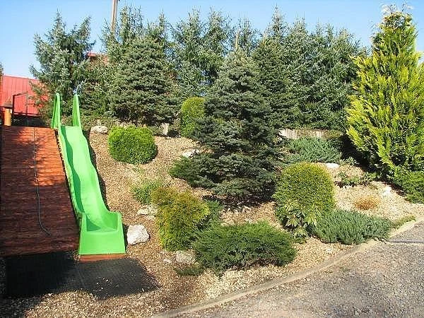 Vybavení areálu a exteriéru: Celý areál o rozloze 2500 m² je oplocen a k dispozici je pouze pro ubytované hosty. K dispozici je víceúčelové hřiště s umělou trávou pro tenis, fotbal, nohejbal, volejbal, házenou, badminton a soft tenis. Dále zahrnuje svahovou skluzavku (4,4 m), zahradní bowling, prolézací vlak, venkovní stolní tenis, dvě houpací sítě, skákací trampolínu (průměr 305 cm), minigolf, houpačky a pískoviště. Pro dospělé a společenské aktivity je k dispozici biliard, petanque, šipky a stylová krbovna. Součástí areálu je také zahradní pergola s grilem a posezením pro 12 osob.