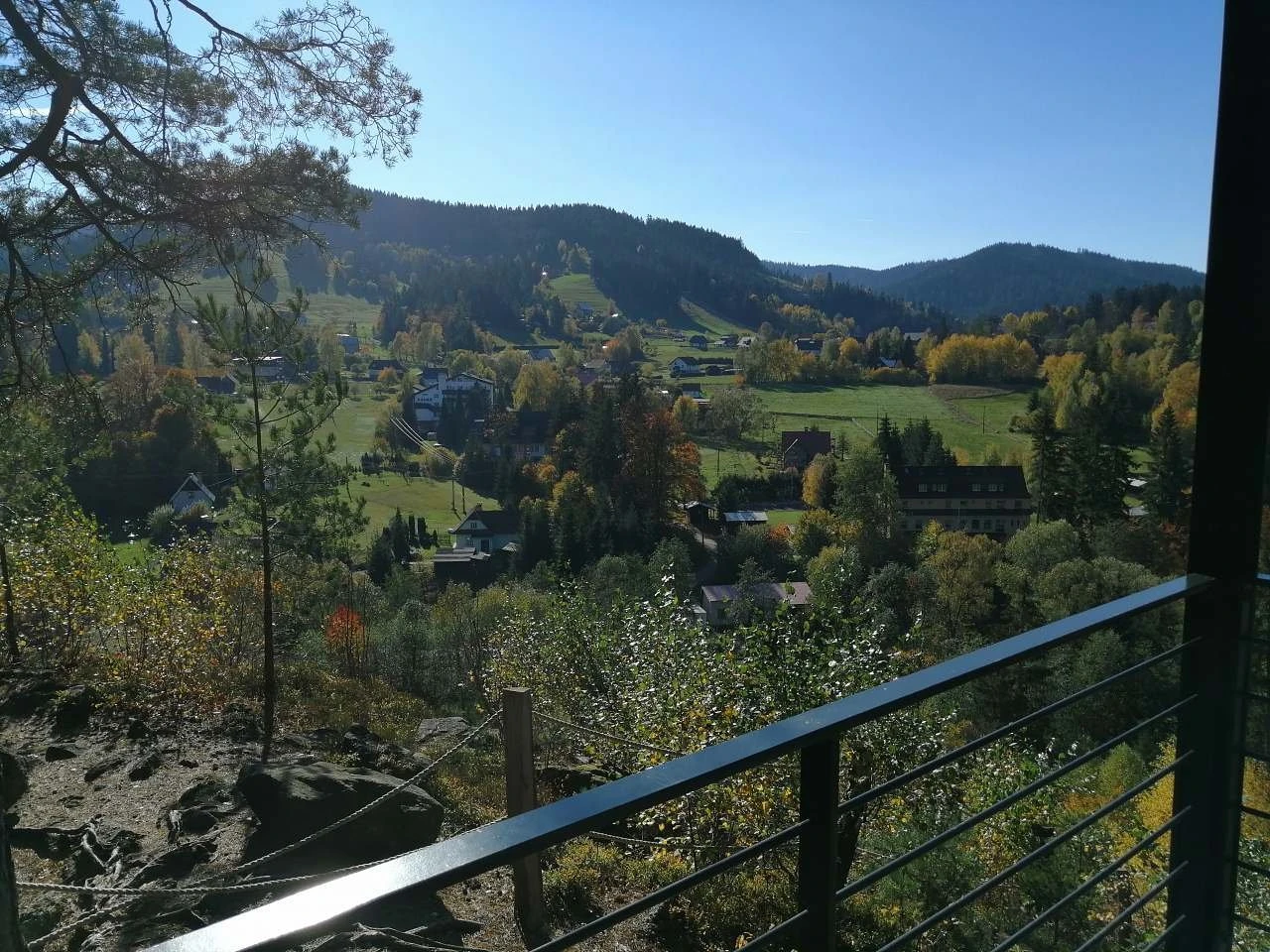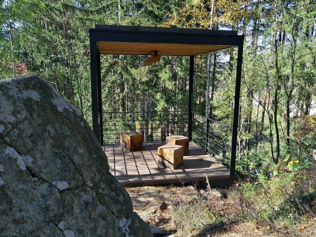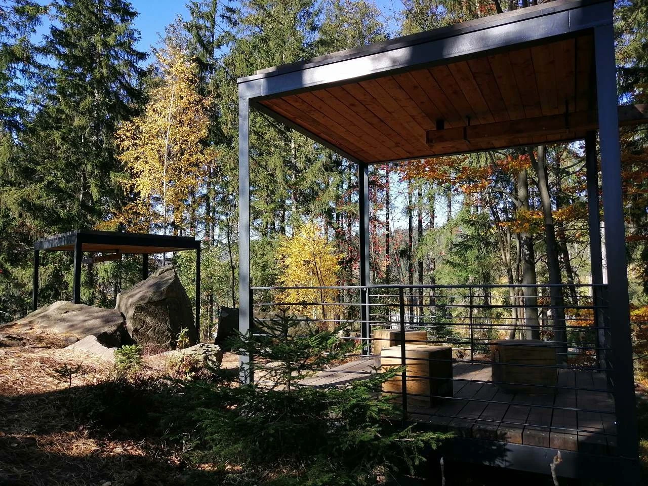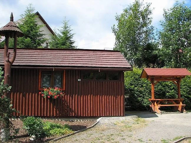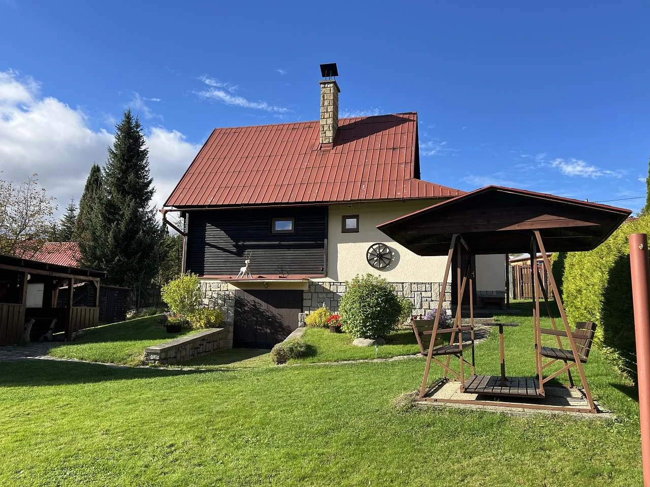 Exteriérové vybavení a okolí: Chata disponuje terasou, zahradním nábytkem a grilem, travnatou plochou, přístupem k potoku a lesu, oploceným prostorem a možností parkování.