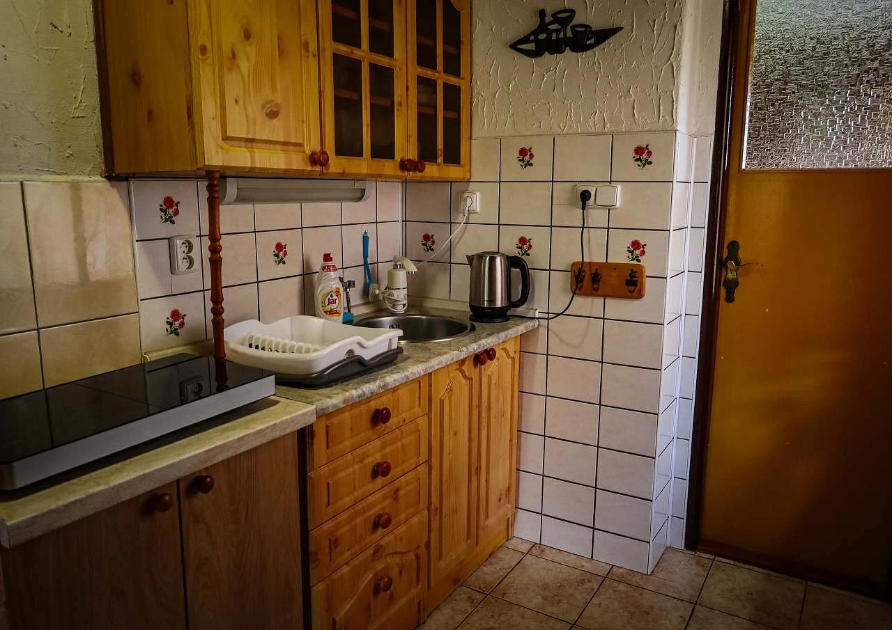 V přízemí se nachází plně vybavená kuchyň s mikrovlnnou troubou, dvouplotýnkovým indukčním vařičem a toastovačem, dále jídelna, společenská místnost s krbem a sociální zařízení, které zahrnuje sprchový kout a samostatné WC. Ohřev vody zajišťují průtokové ohřívače.