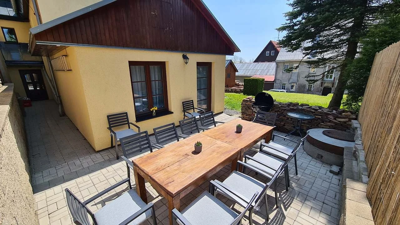 Chata Iva se nachází v centru obce Boží Dar v Krušných horách, nadmořská výška 1028 m. Objekt má kapacitu 17 osob, nabízí 5 samostatných ložnic a je vhodný pro rodiny i skupiny. Ubytování je po rekonstrukci, interiér je moderně a funkčně vybavený s důrazem na pohodlí a praktičnost. Součástí chaty je prostorná společenská místnost s vnitřním krbem, plně vybavené zázemí pro pobyt větší skupiny a oplocený pozemek.