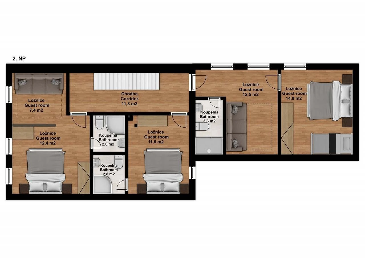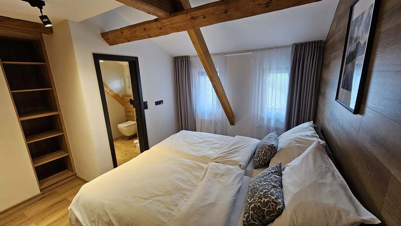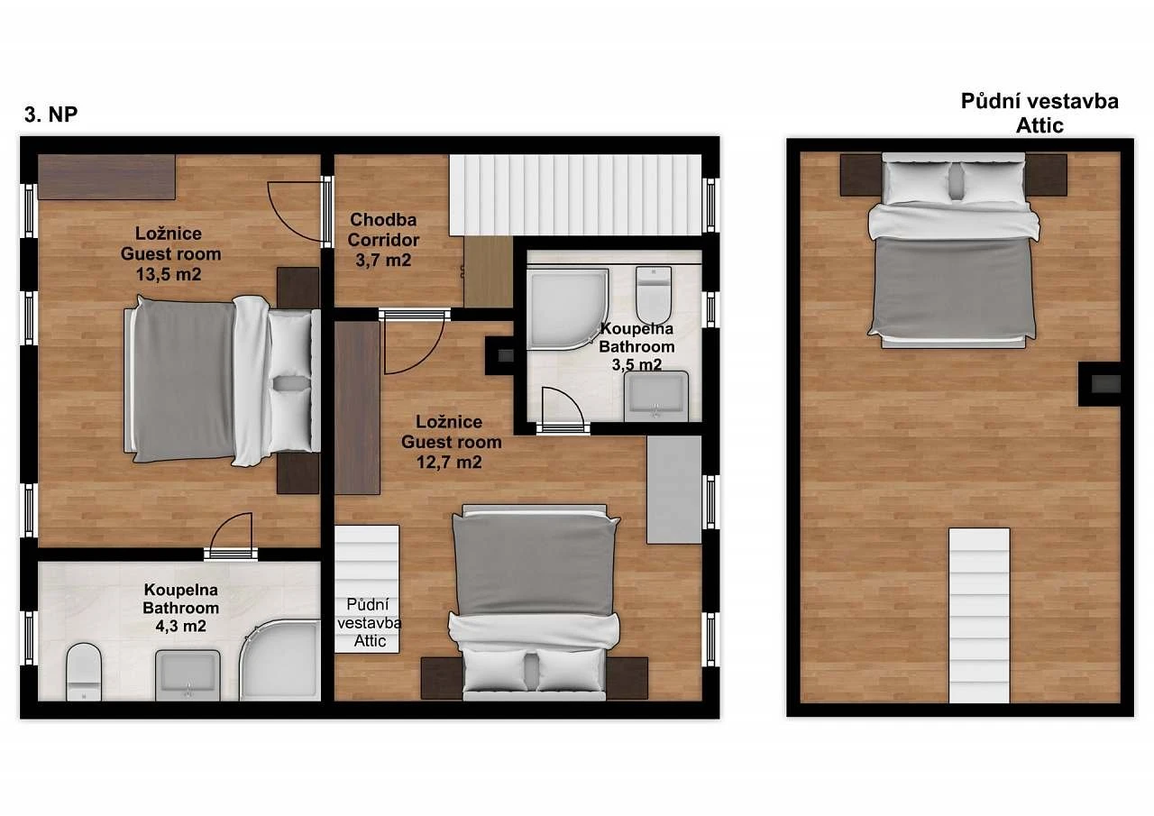 - 4lůžkový pokoj (dvojlůžko + dvě lůžka v podkroví)