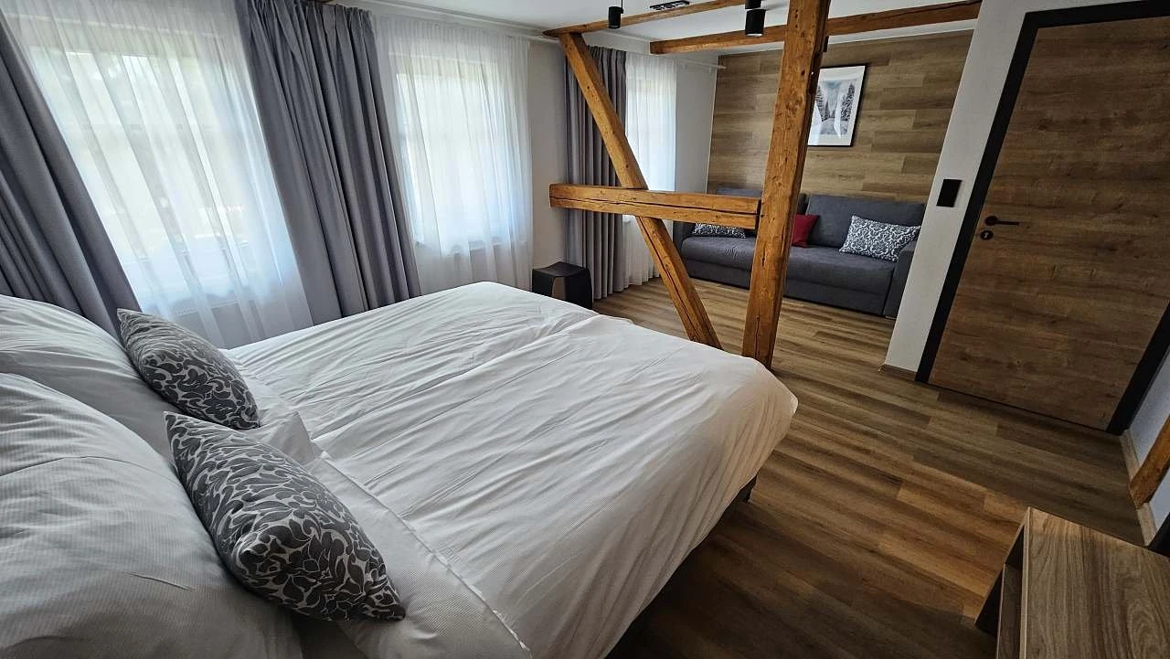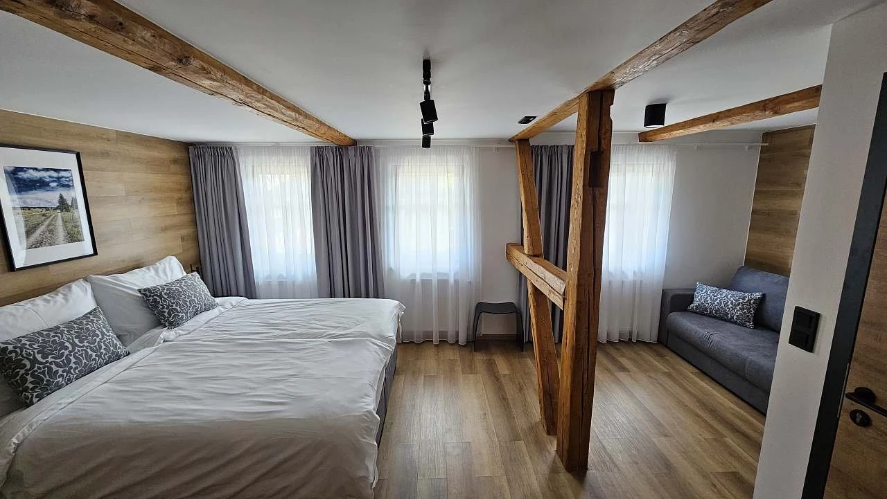 - 5lůžkový pokoj (dvojlůžko + samostatné lůžko + rozkládací dvojgauč)