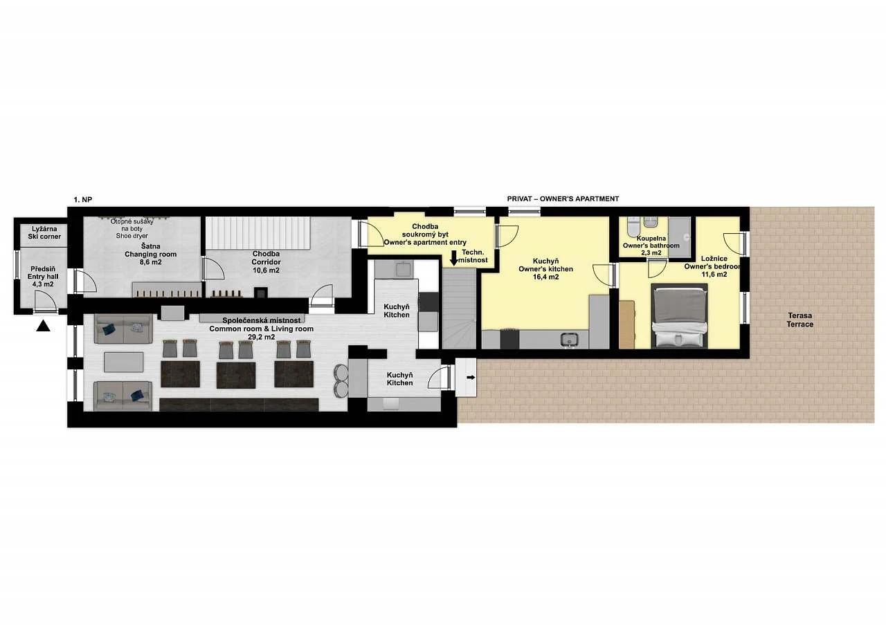 - Součástí objektu je byt majitele, který je příležitostně využíván, ale je kompletně oddělený pro zachování soukromí.