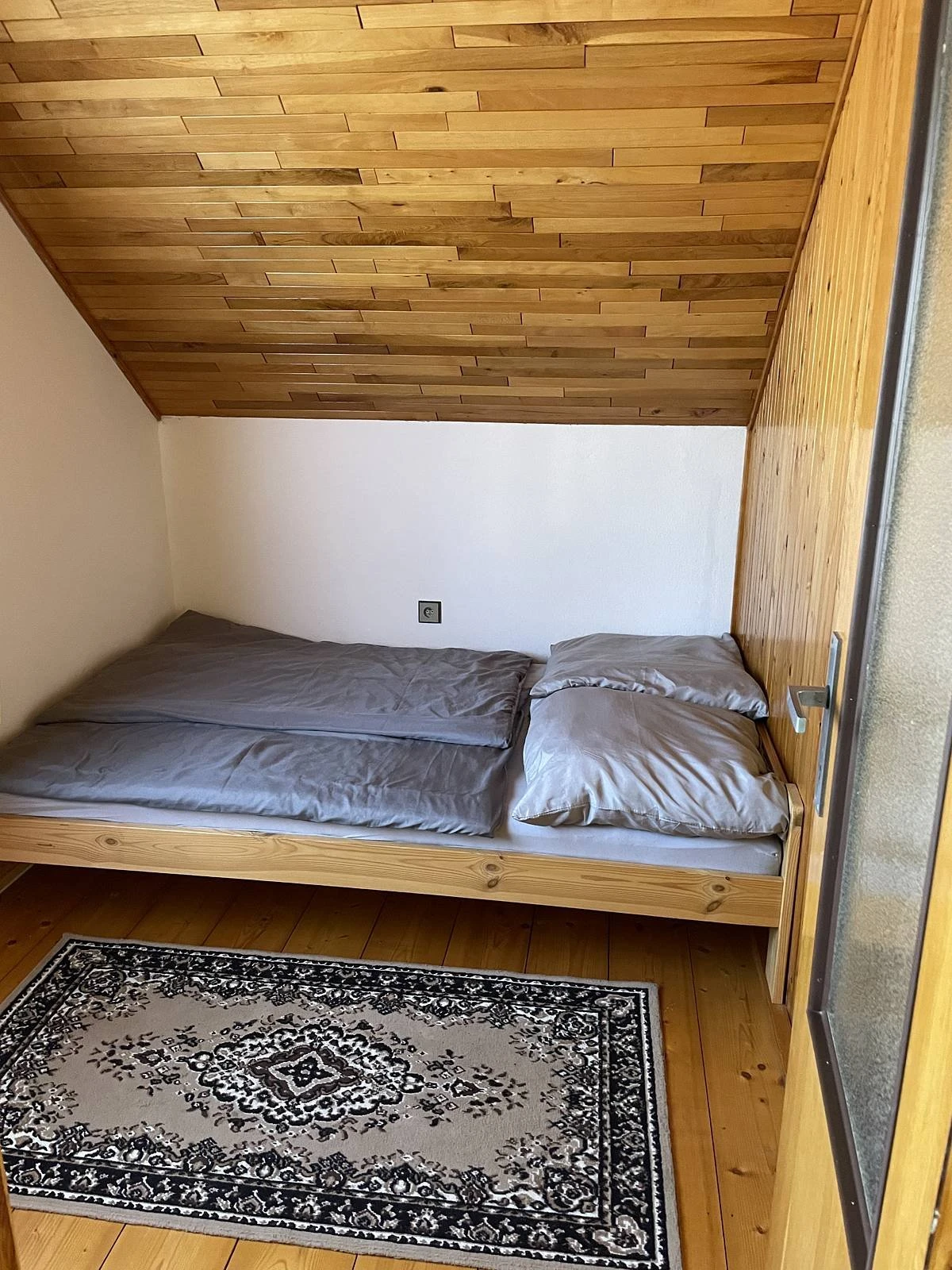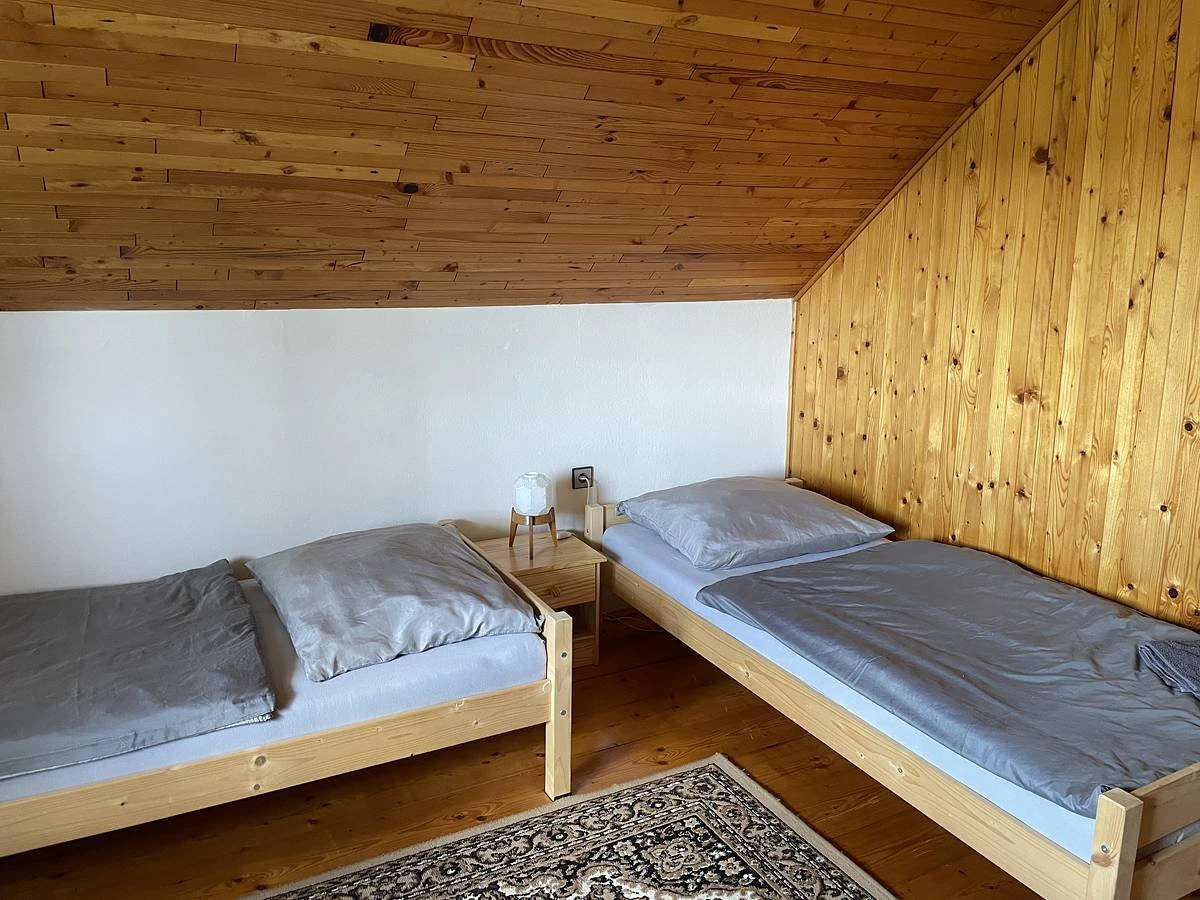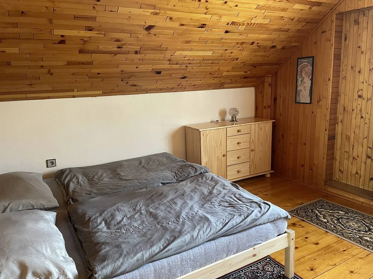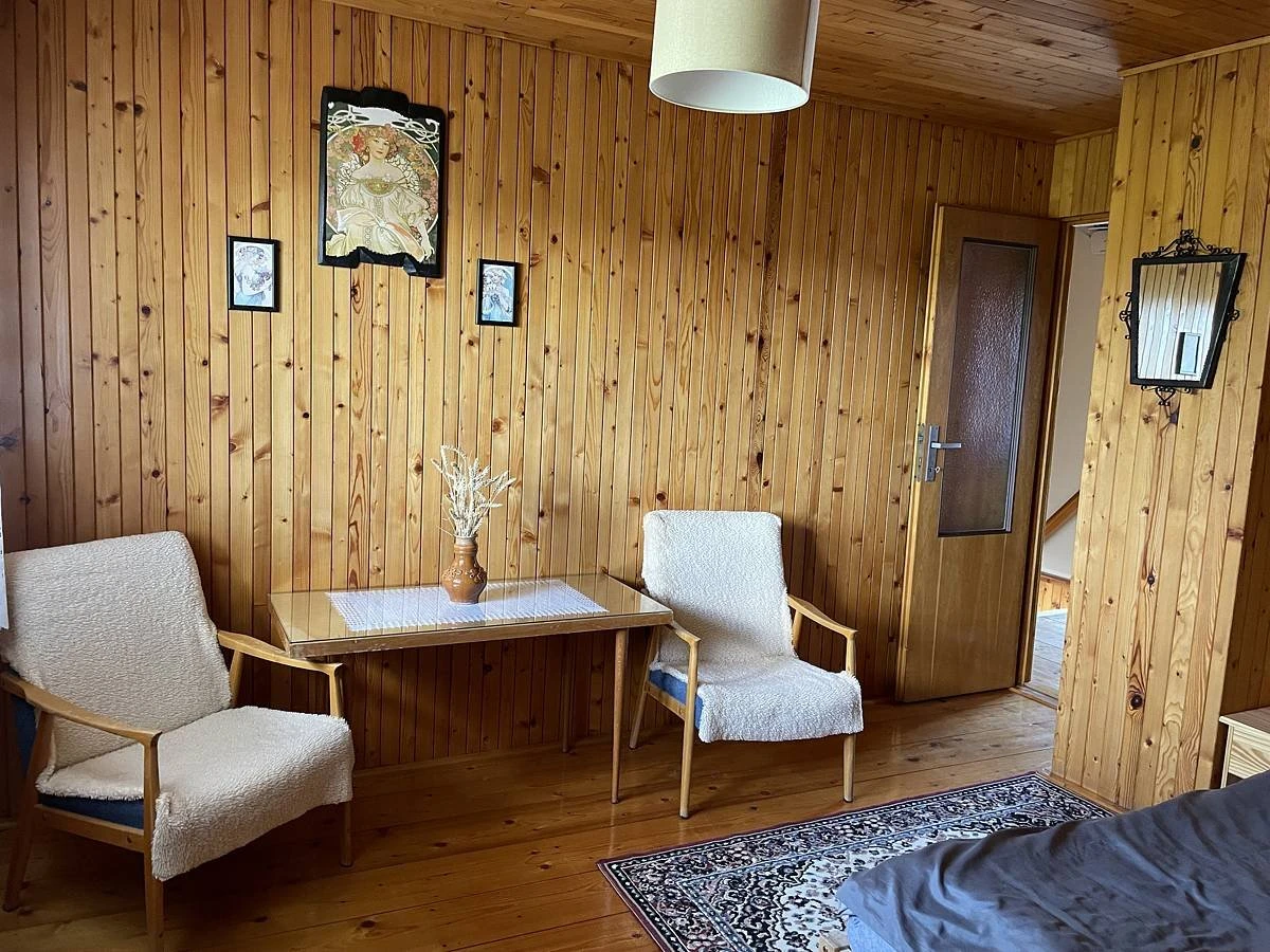 V patře jsou 3 samostatné neprůchozí pokoje. Dva pokoje jsou dvoulůžkové a mají přístup na společný balkón. Třetí pokoj je menší, s 1,5lůžkem (šířka 120 cm). V objektu je možné využít 2 přistýlky (rozkládací matrace). Součástí zázemí je garáž pro uskladnění kol, zahradní nábytek pro 6–8 osob a venkovní gril.