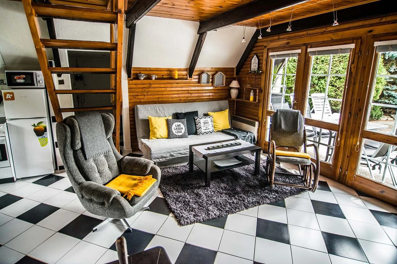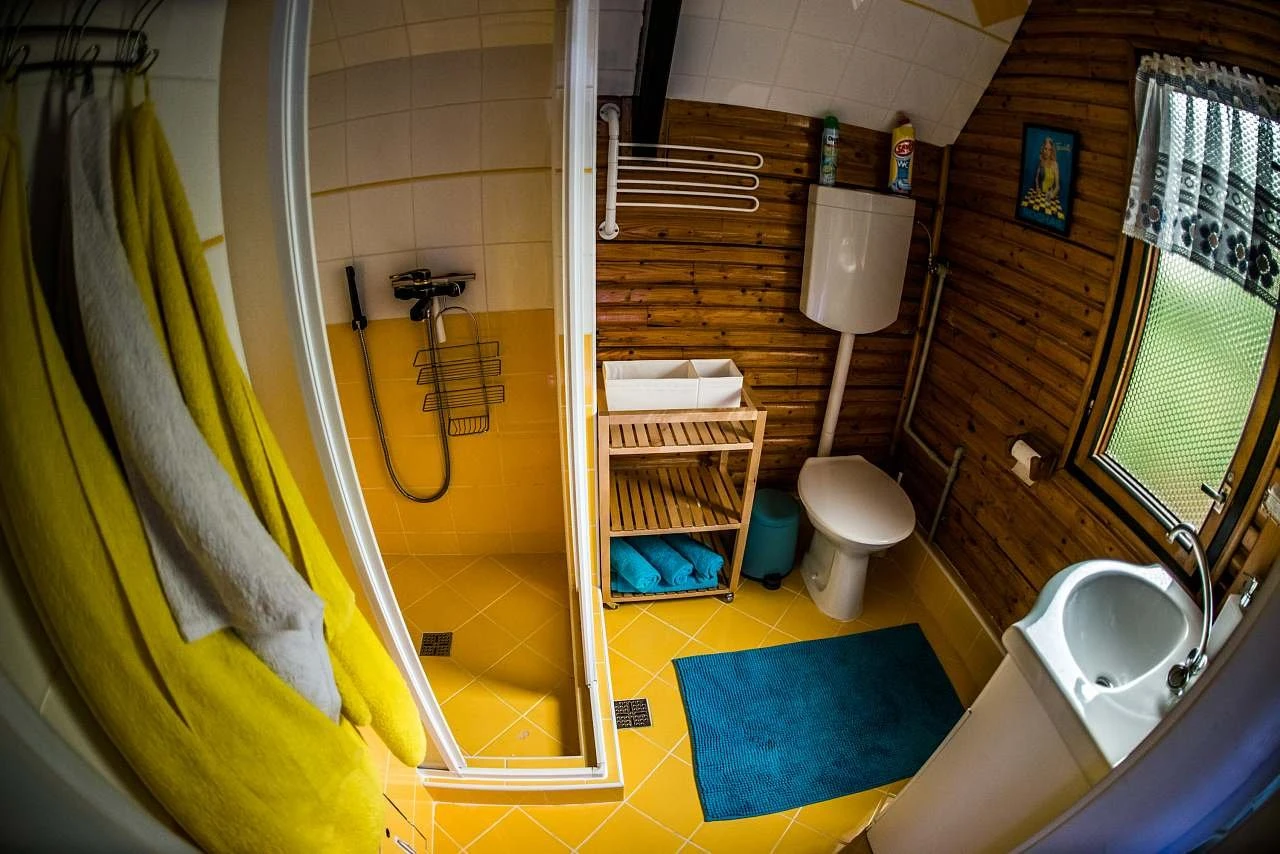 V přízemí je velká obývací místnost se 2 rozkládacími pohovkami a TV se satelitem. Obývací část doplňují kamna pro vytápění objektu. Dále zde najdete plně vybavený kuchyňský kout, oddělenou jídelnu pro 5 osob a koupelnu se sprchovým koutem a toaletou.