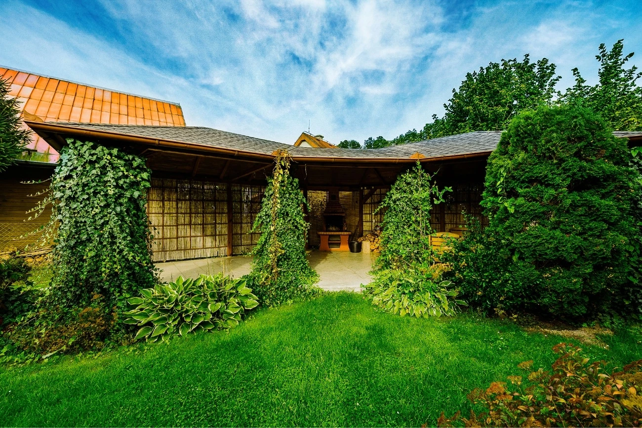 - Zastřešené posezení pro 8 osob se zděným krbem
