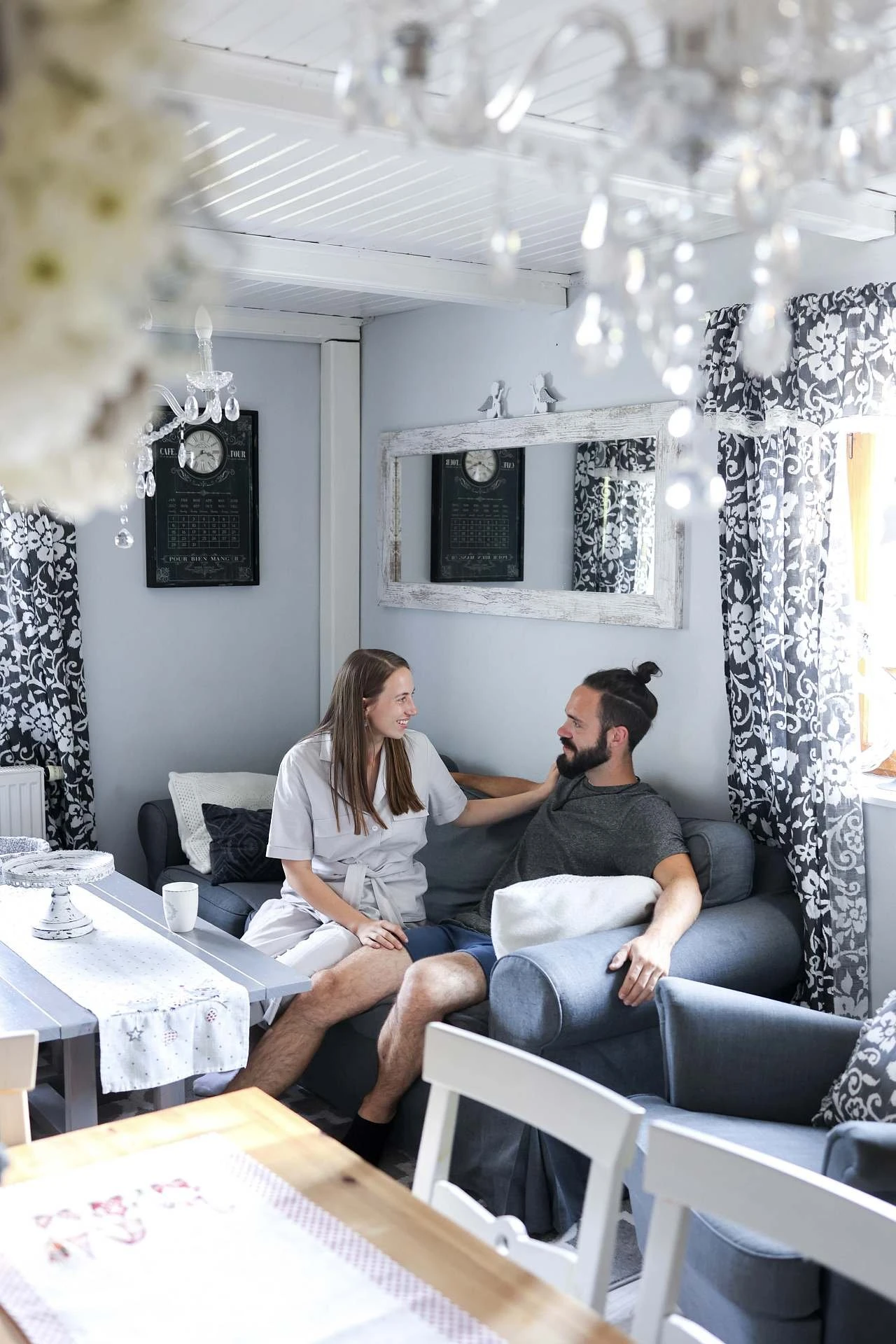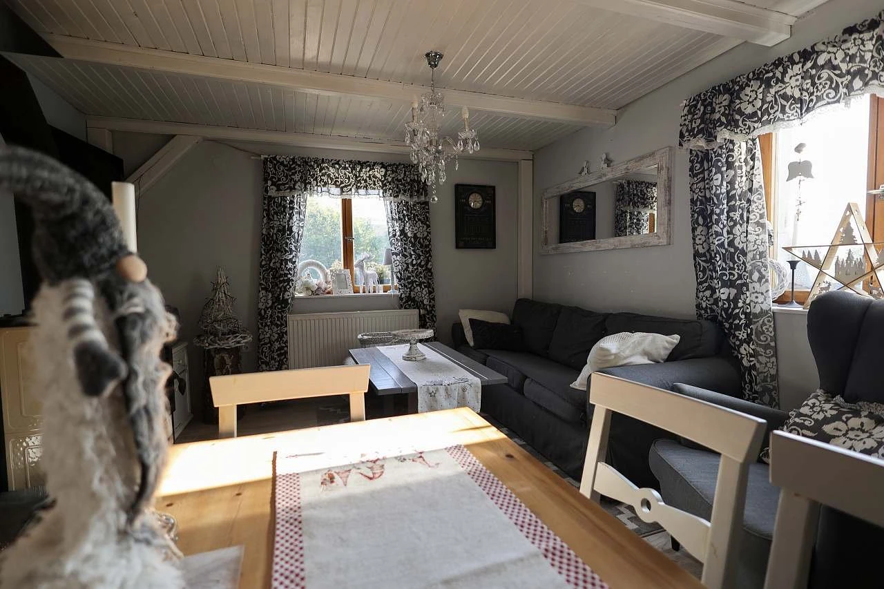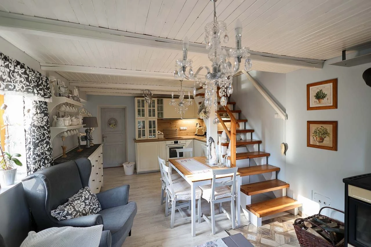 Obývací prostor je vybaven jídelním koutem, krbovými kamny, LCD TV a Wi-Fi. Součástí je také nová terasa. Kuchyň je kompletně vybavená: sporák se sklokeramickou deskou, elektrická trouba, myčka, lednice s mrazákem, mikrovlnka a varná konvice.