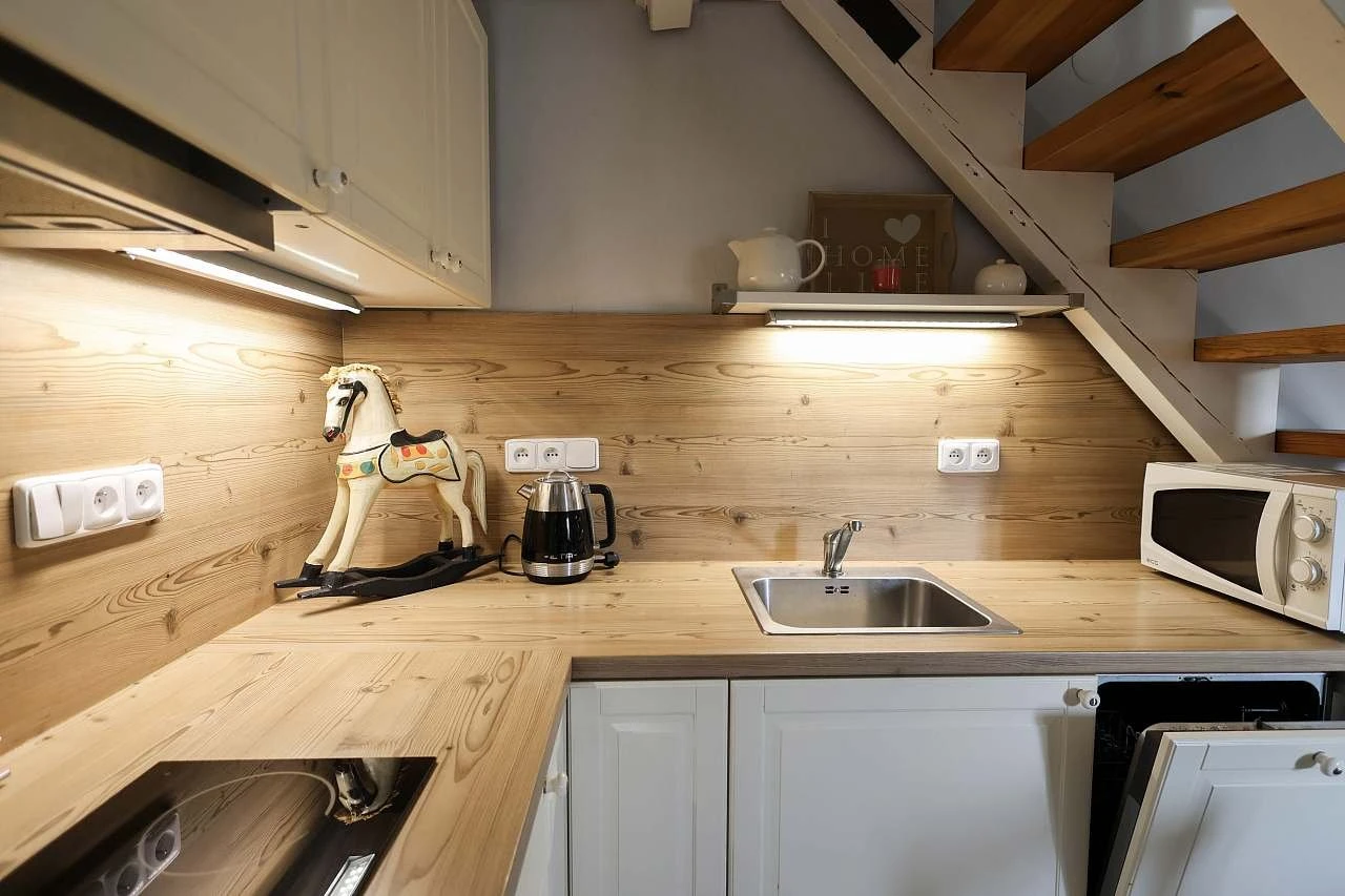 Kuchyň: sporák se sklokeramickou deskou, elektrická trouba, myčka, lednice s mrazákem, mikrovlnka, varná konvice, další základní vybavení.