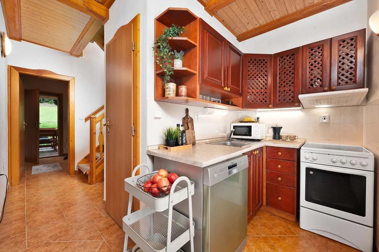 - Kuchyňský kout: myčka nádobí, elektrický sporák s troubou, mikrovlnná trouba, rychlovarná konvice, kávovar, nádobí