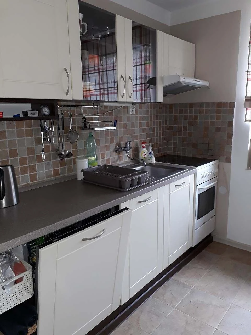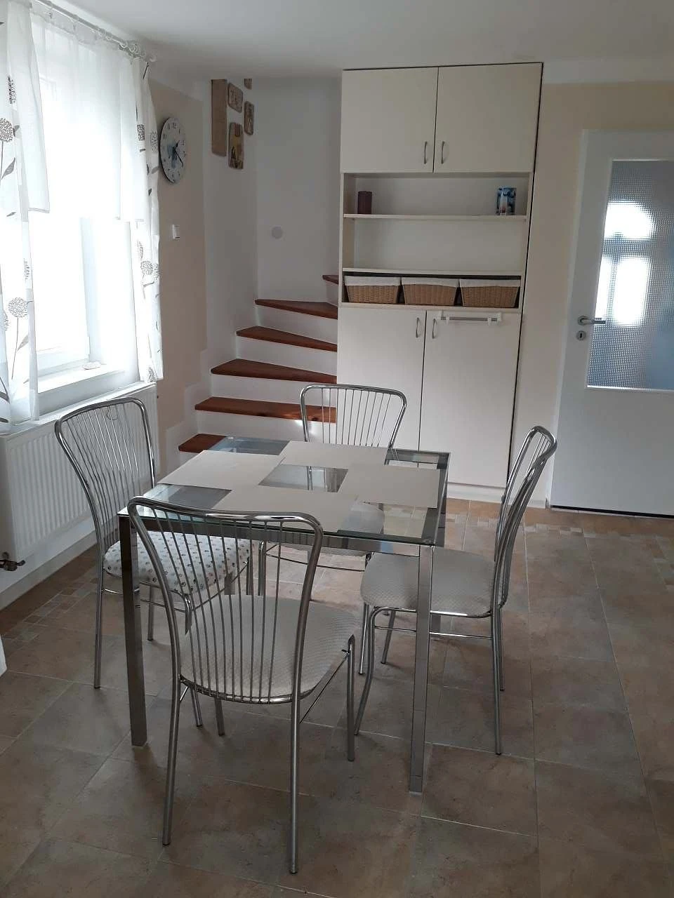 Chata je vybavena průchozí jídelnou v přízemí s jídelním stolem pro 4 osoby, židlemi a dětskou jídelní židličkou. Na jídelnu navazuje obývací pokoj, kuchyň a schodiště do podkroví. Kuchyň je plně vybavená a zahrnuje elektrický sporák se sklokeramickou deskou (4 plotýnky), troubu a gril, lednici s mrazákem, myčku nádobí, mikrovlnnou troubu, rychlovarnou konvici, toustovač/vaflovač, topinkovač, tyčový mixér a šlehač. Součástí je pultový stůl se dvěma barovými židlemi a úložný prostor na potraviny.