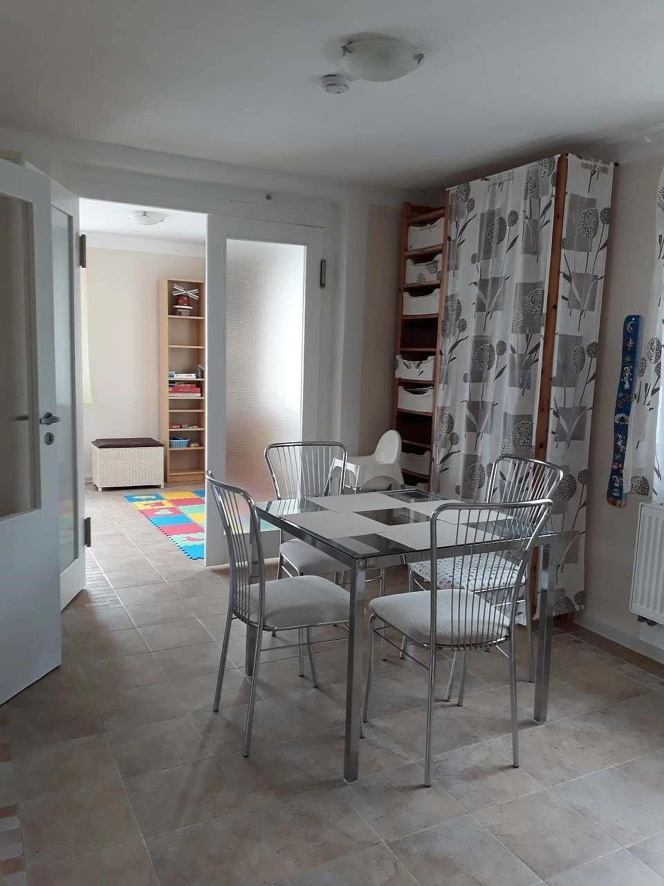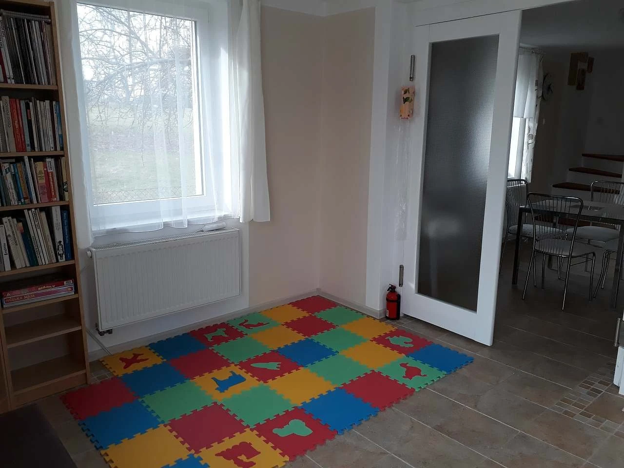 V obývacím pokoji se nachází rozkládací rohová sedací souprava sloužící jako přistýlka (dvoulůžko), konferenční stolek, TV, televizní stolek, knihovna a dětský hrací koutek (dětský stolek se židličkami, pěnové puzzle, hry, hračky, stavebnice). Z obývacího pokoje je přímý vstup na terasu orientovanou na jihovýchod, vybavenou zahradním stolem, šesti židlemi a slunečníkem.