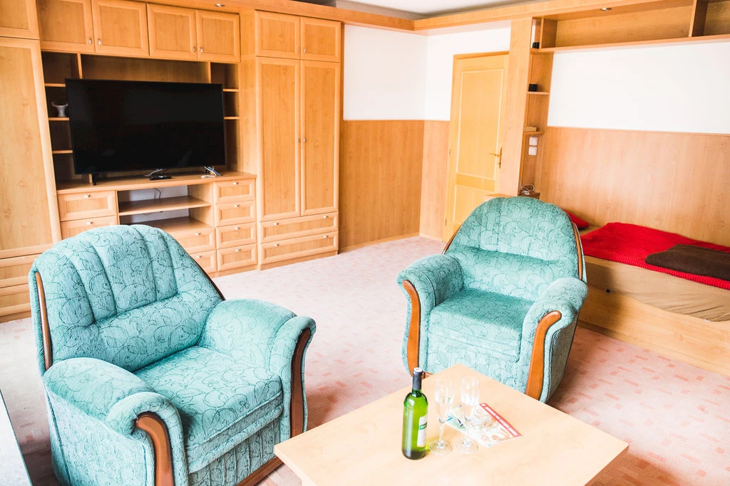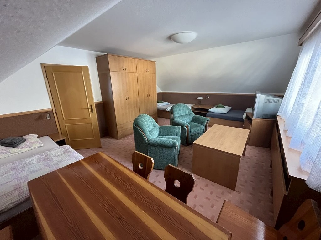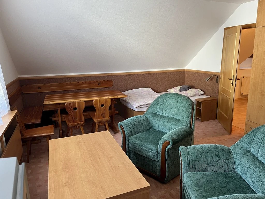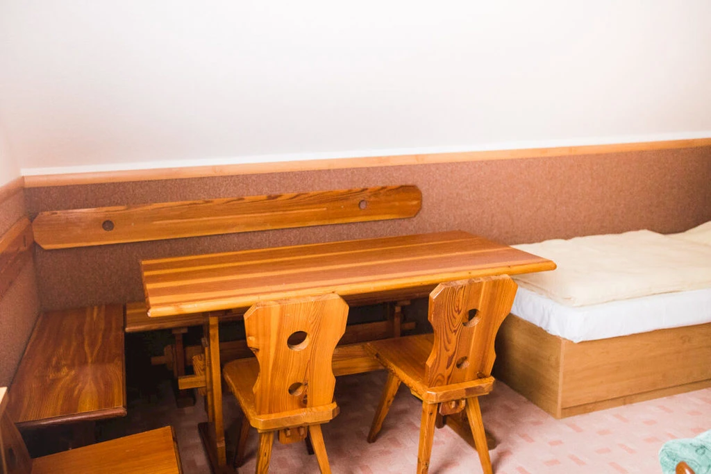 | Podkroví | Pokoj 1 (selský): 3× postel + noční stolek, rozkládací gauč, 2× křeslo, konferenční stolek, jídelní stůl + 3 židle a lavice, TV + set-top box, velká skříň s nástavcem, stolní lampička Pokoj 2: 4× postel + noční stolek, konferenční stolek, velká skříň s nástavcem, stolní lampičky |