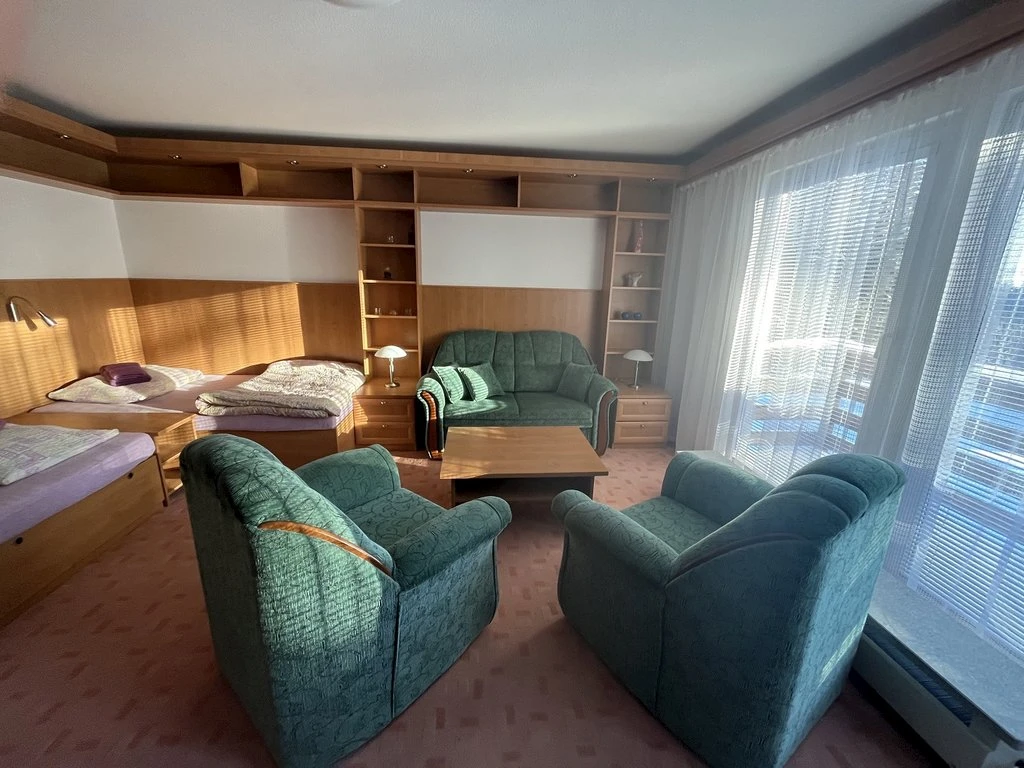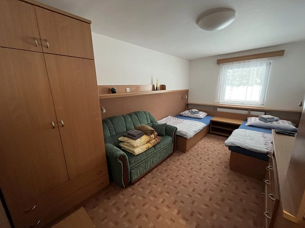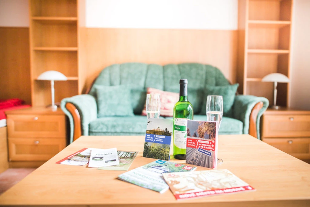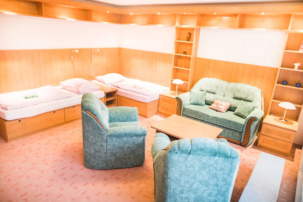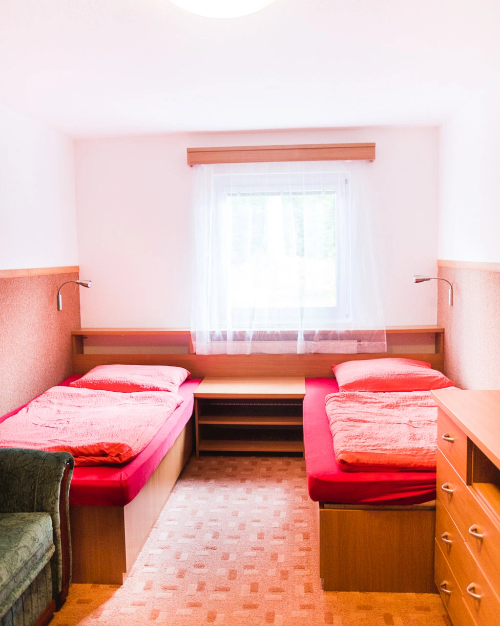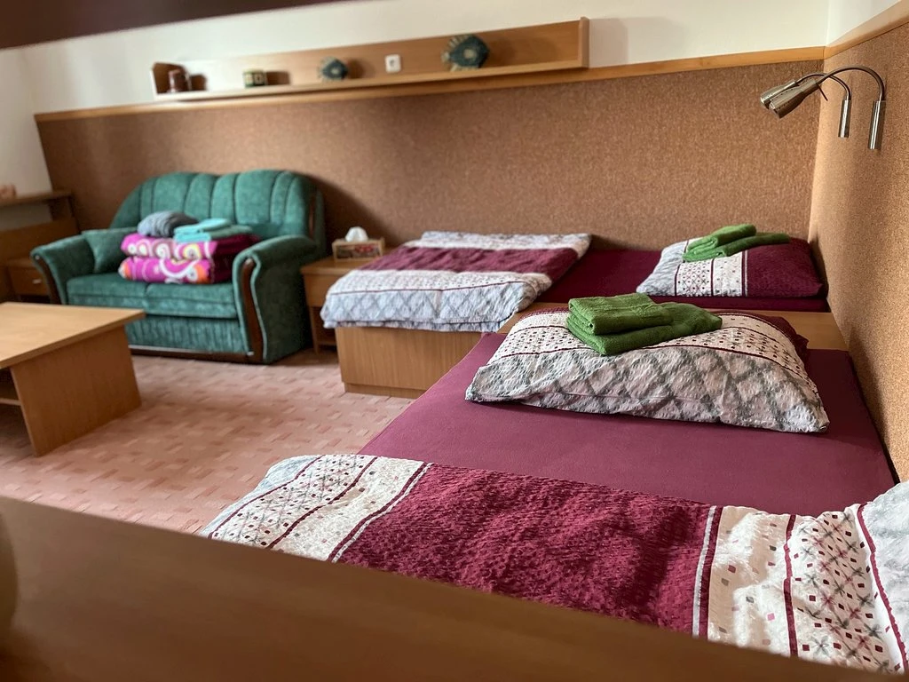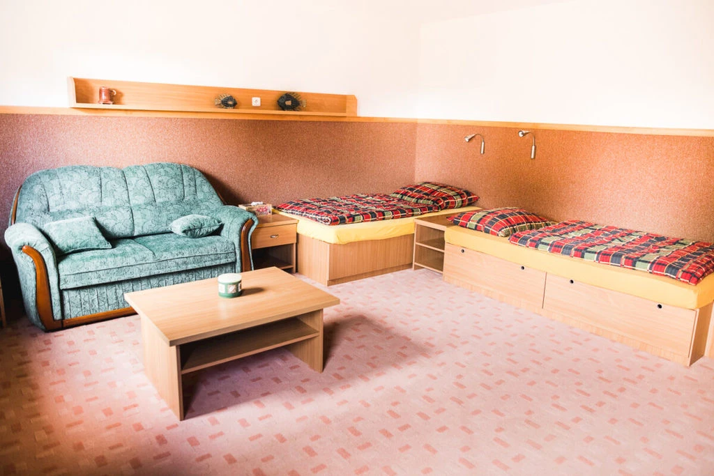| Pokoje – rozdělení a kapacita | Pokoj 1: 2 lůžka + 1 přistýlka (2× jednolůžková postel, 1× rozkládací) Pokoj 2: 2 lůžka + 1 přistýlka (2× jednolůžková postel, 1× rozkládací) Pokoj 3: 2 lůžka + 1 přistýlka (2× jednolůžková postel, 1× rozkládací) Pokoj 4: 3 lůžka (3× jednolůžková postel) Pokoj 5: 4 lůžka (4× jednolůžková postel) |