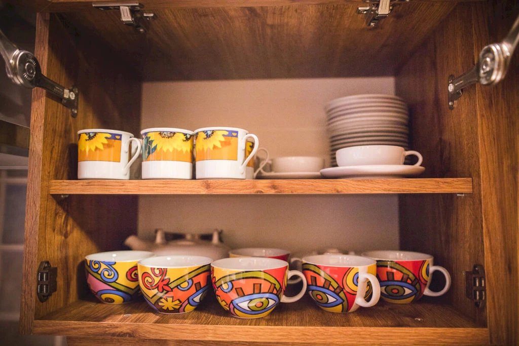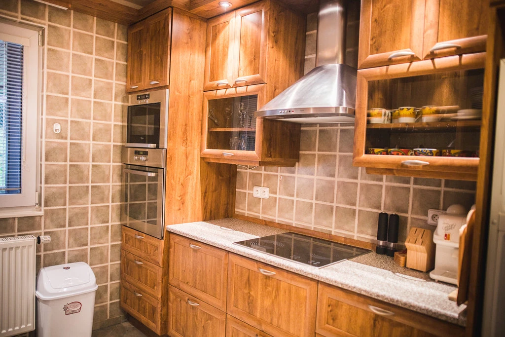 - Spotřebiče: mikrovlnná trouba, horkovzdušná trouba, myčka, lednice s mrazákem, sklokeramická varná deska