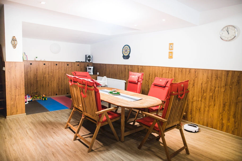 | Společenská místnost (přízemí) | 70 m², krb, TV Samsung 65", Hi-Fi věž, šipky, dětský koutek, 2× gauč, 4× křeslo, konferenční stolky, kulatý stůl + 6 židlí, oválný stůl (teak) + 6 židlí s podsedáky, přímý vstup na venkovní terasu |