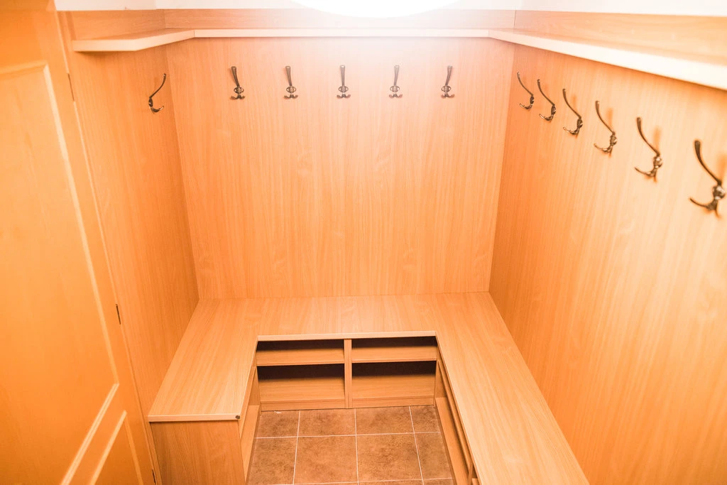 | Zádveří / technické prostory | Věšáková stěna, vestavěný botník, kolárna / lyžárna, vysoušeč bot |