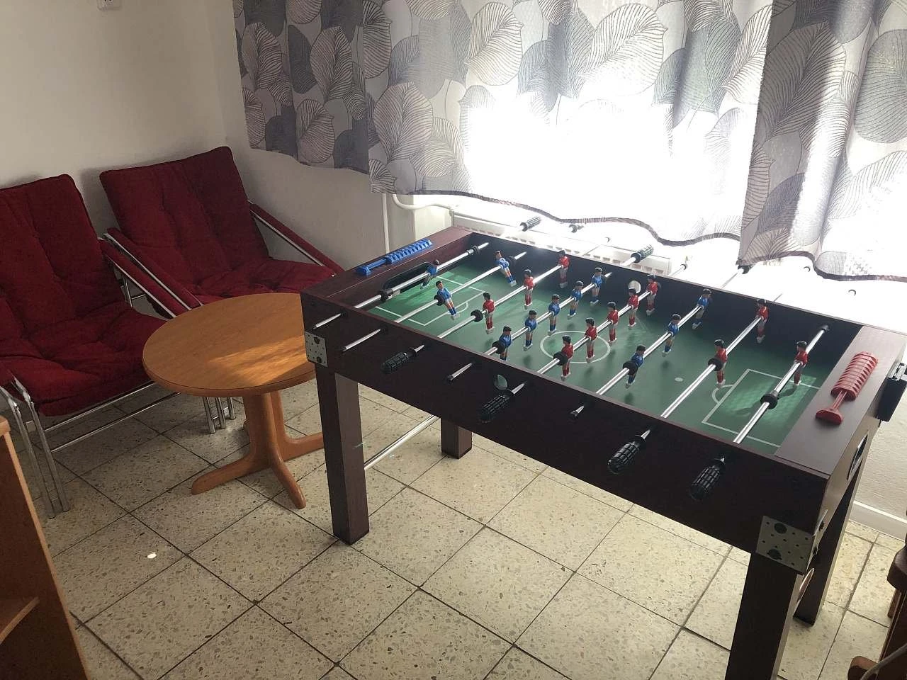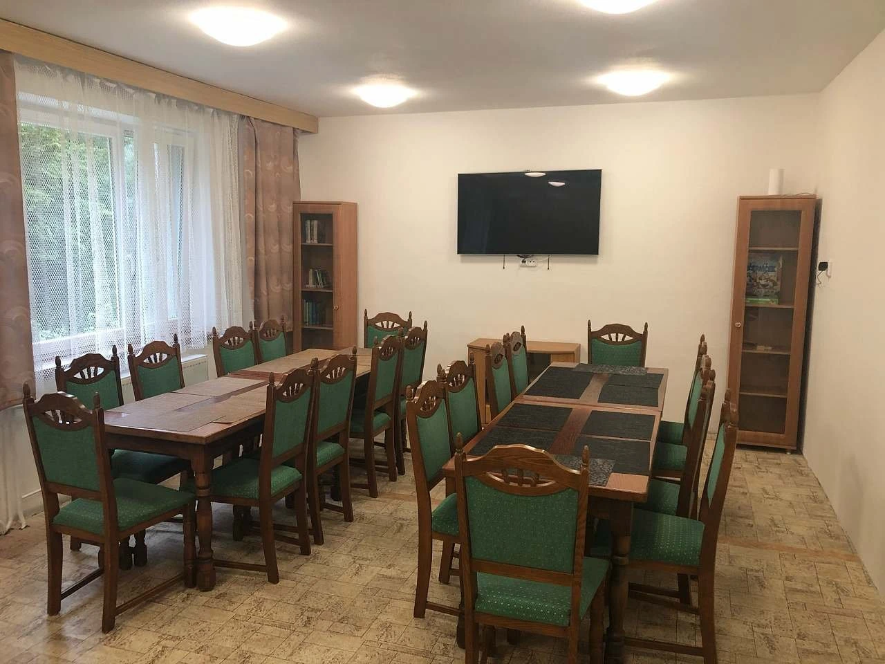 Součástí interiéru je prostorná společenská místnost vhodná pro společné aktivity. Venkovní zázemí zahrnuje terasu s pergolou, zahradní nábytek, gril a venkovní ohniště. Pro relaxaci a volnočasové využití je k dispozici venkovní bazén a koupací sud.