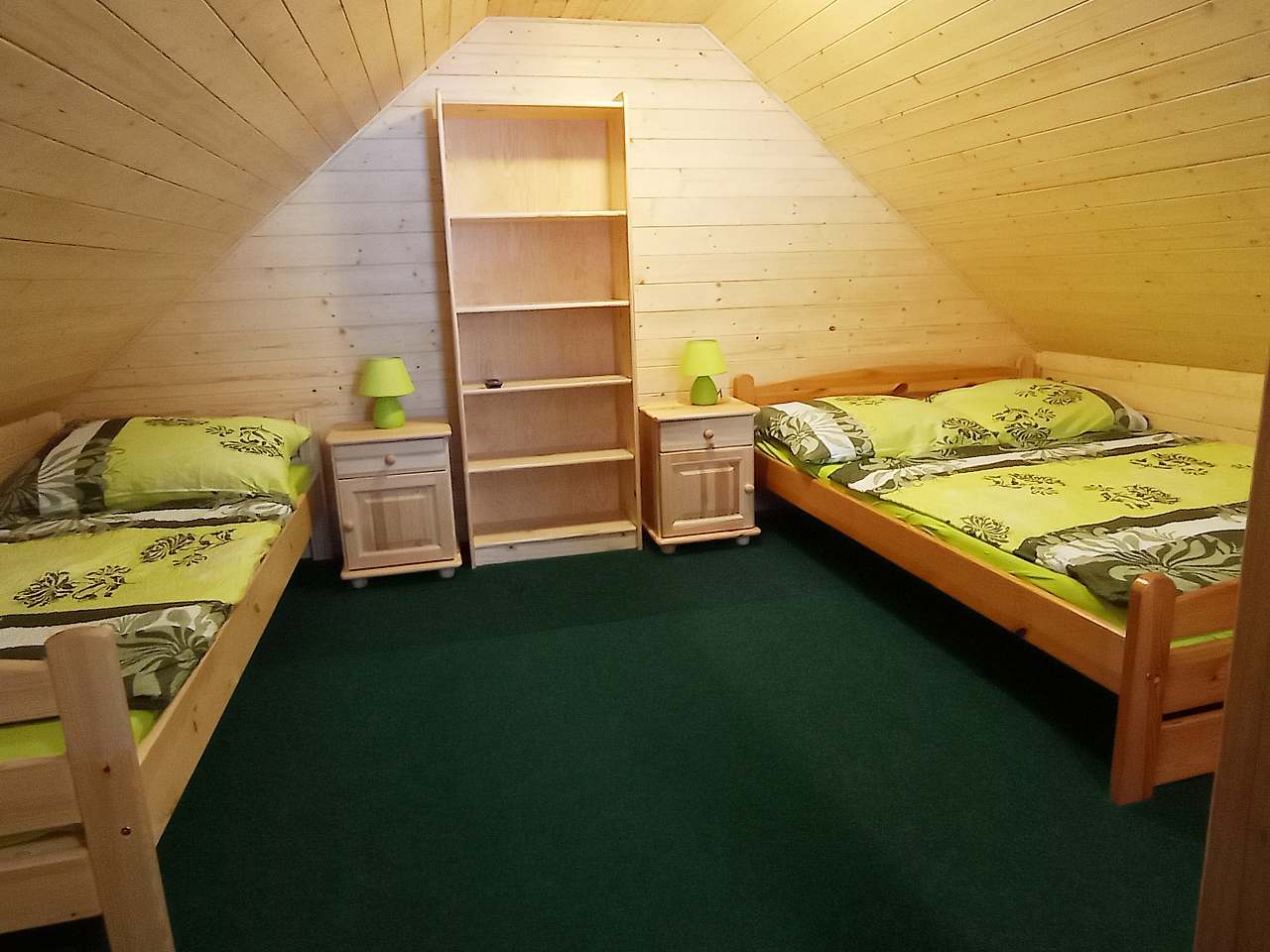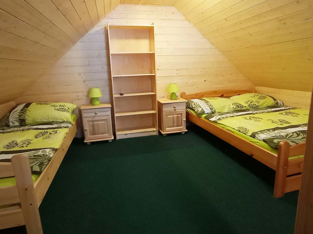 Mezonetový Apartmán Zelený nabízí ubytování se dvěma ložnicemi pro šest osob s možností dvou přistýlek. První ložnice obsahuje manželskou postel a dvě přistýlky ve formě pohovky, zatímco druhá ložnice má dvě jednolůžkové postele a jednu manželskou postel.