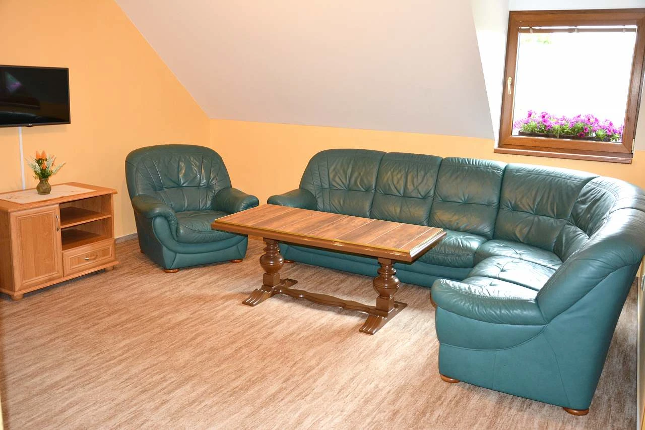 Mezonetový Apartmán Zelený nabízí ubytování se dvěma ložnicemi pro šest osob s možností dvou přistýlek. První ložnice obsahuje manželskou postel a dvě přistýlky ve formě pohovky, zatímco druhá ložnice má dvě jednolůžkové postele a jednu manželskou postel.Vybavení zahrnuje WiFi připojení k internetu a televizi. Koupelna je vybavena toaletou, sprchou a umyvadlem. Kuchyňský kout je vybaven mikrovlnnou troubou, rychlovarnou konvicí, ledničkou, jídelním posezením a elektrickým vařičem.Dětská postýlka za 100 Kč za noc.Děti ve věku od 0 do 1,99 let mají cenu 200 Kč za noc na dítě.Cena přistýlky je 300 Kč osoba/noc, Silvestrovský pobyt 400 osoba/noc