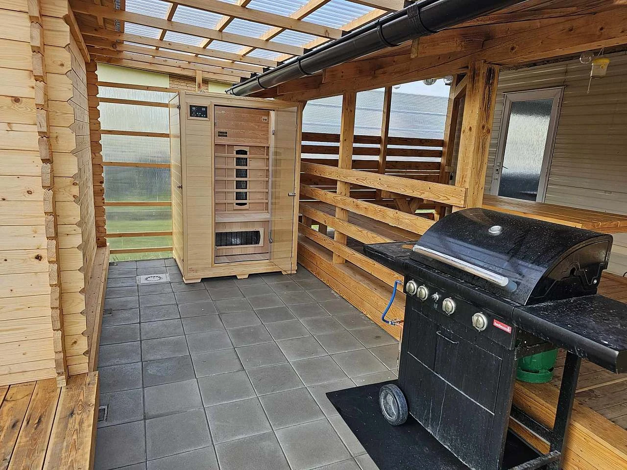 - Plynový gril a zastřešená terasa s posezením.
