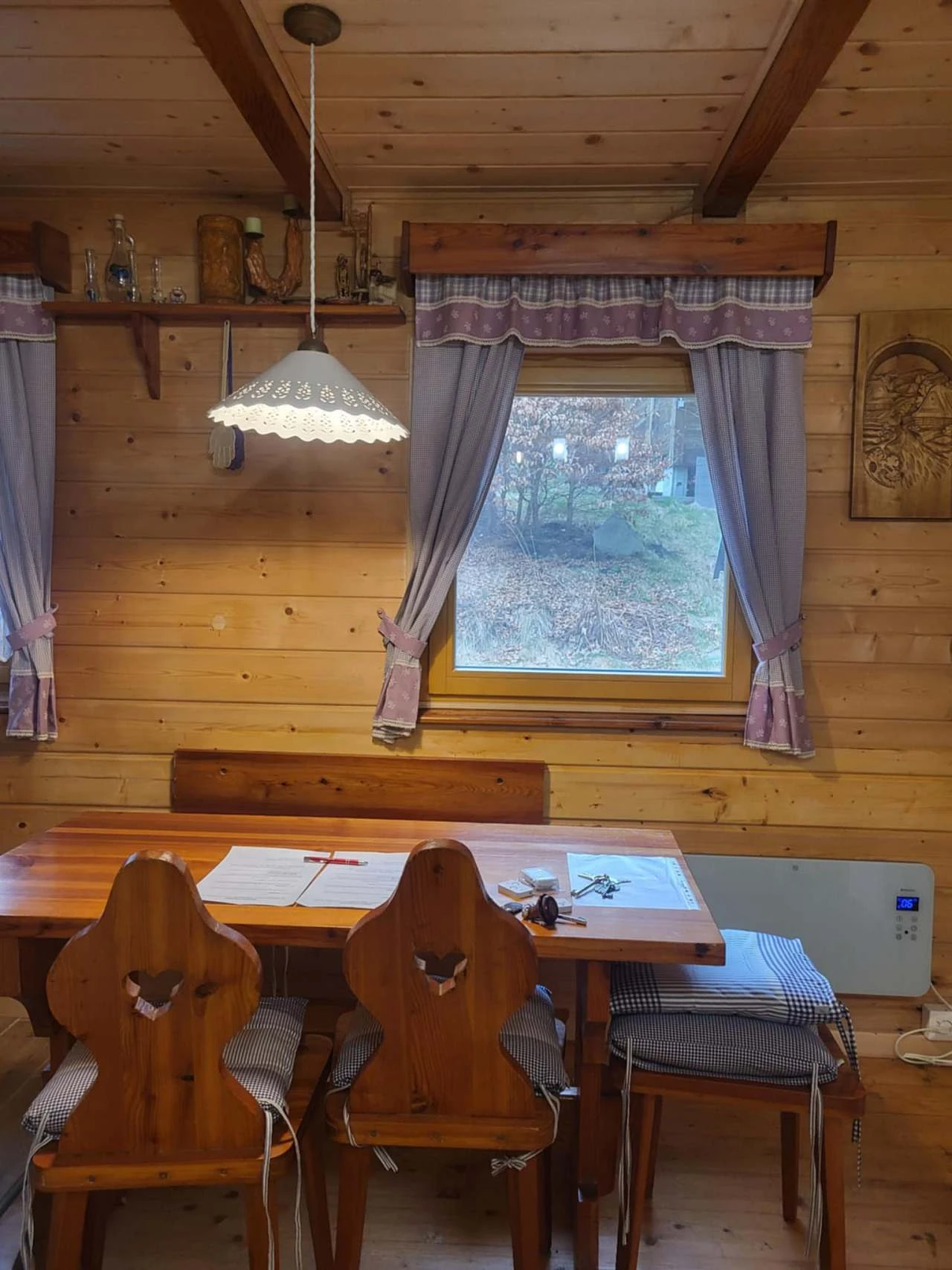 - Vytápění: Elektrické topení a vnitřní krb.
