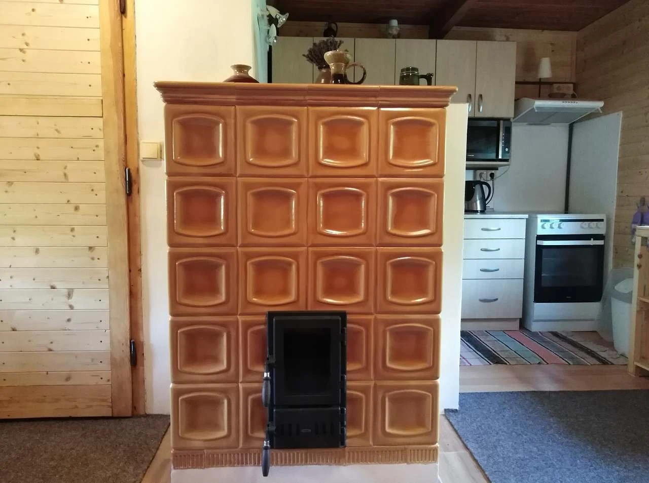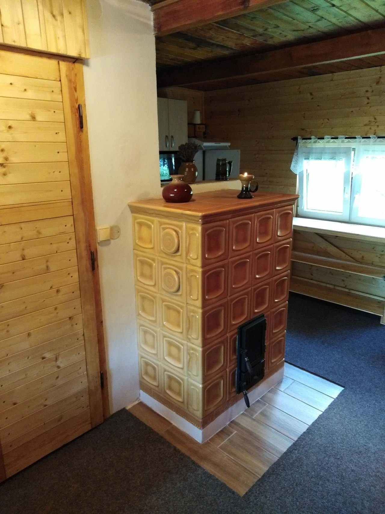 Chata je vytápěna kachlovými kamny a elektřinou.