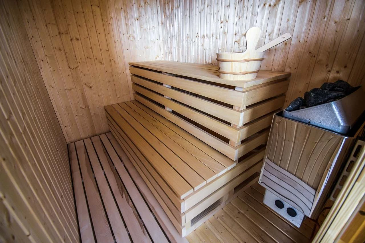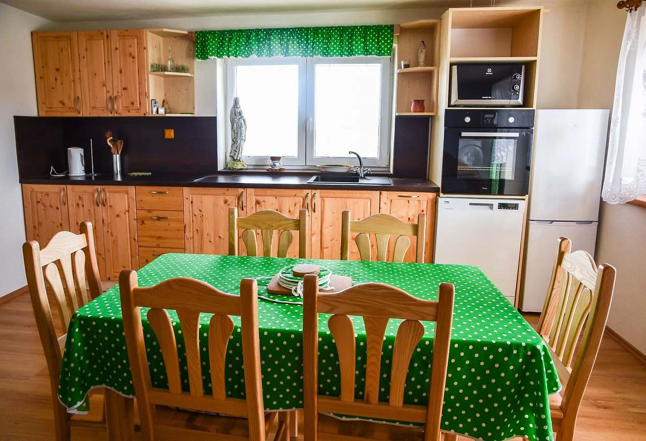 Kuchyň je vybavena elektrickým sporákem, myčkou, rychlovarnou konvicí, mikrovlnnou troubou, troubou, lednicí a jídelním stolem se židlemi. Společenská místnost nabízí sedací soupravu, konferenční stolek, komodu a televizi. Pro relaxaci je k dispozici venkovní vířivka a sauna s kapacitou pro pět osob. Stravování je řešeno formou vlastního vaření.