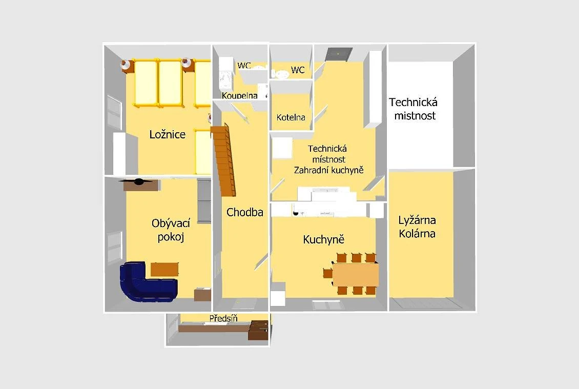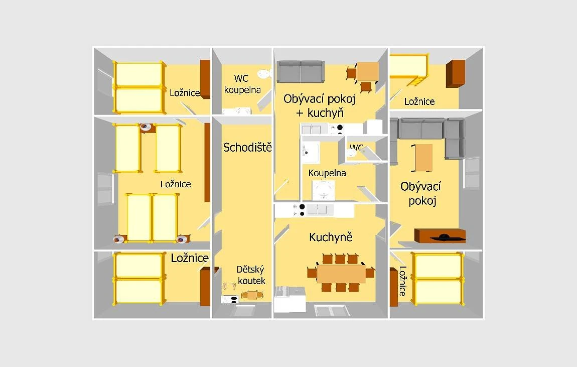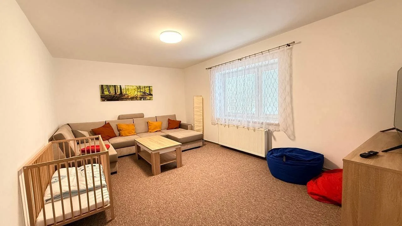 Chata nabízí celkem 6 ložnic a je vhodná pro více rodin nebo větší skupiny. V objektu je k dispozici také dětský koutek a vybavení pro děti včetně jídelních židliček.