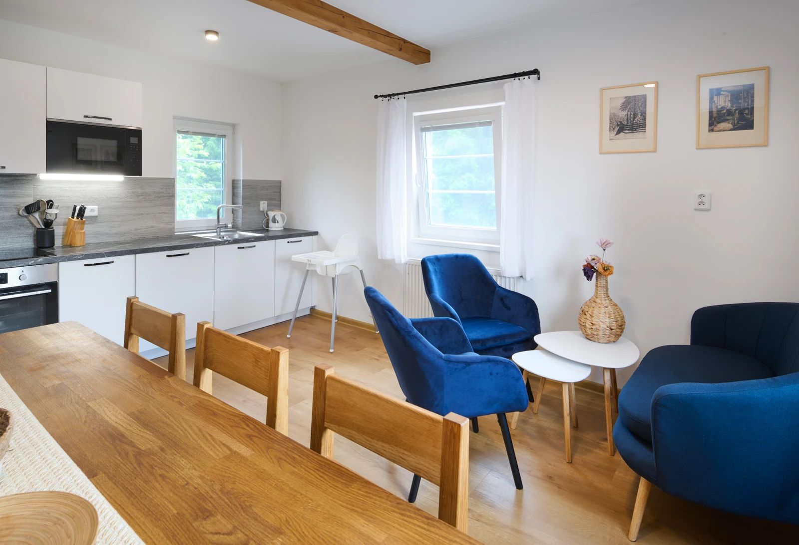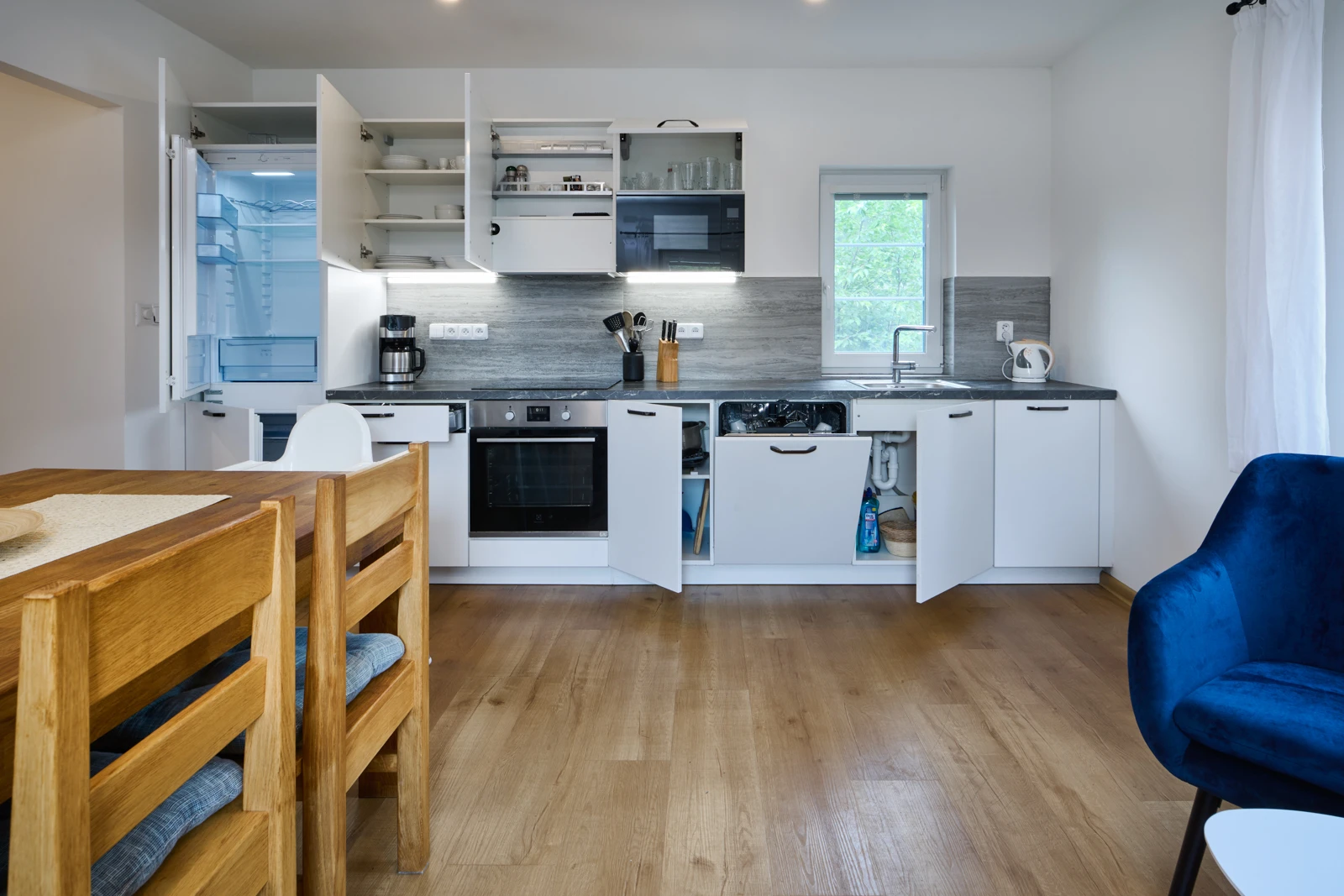 - Plně vybavená kuchyň: lednice, mikrovlnná trouba, překapávací kávovar, myčka, sporák