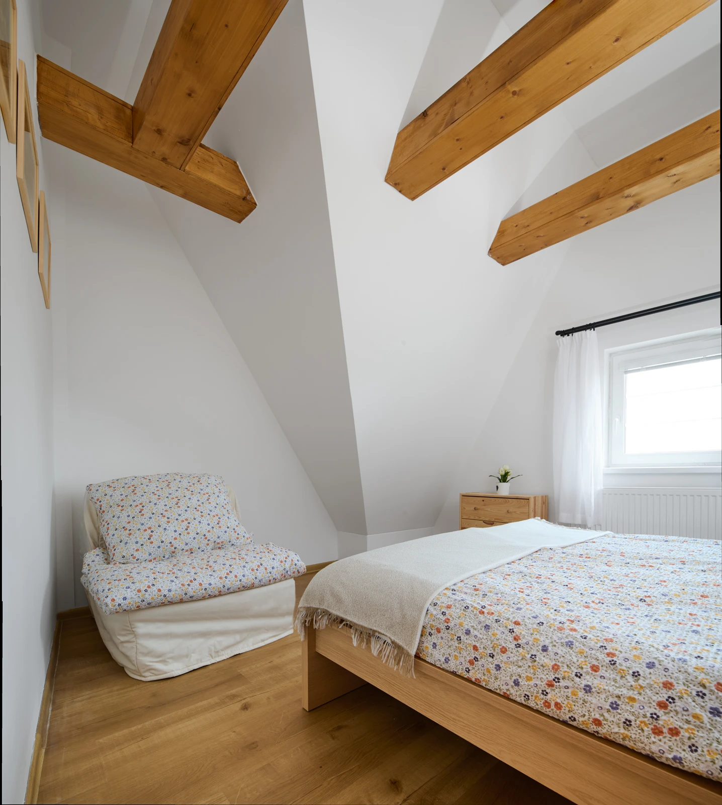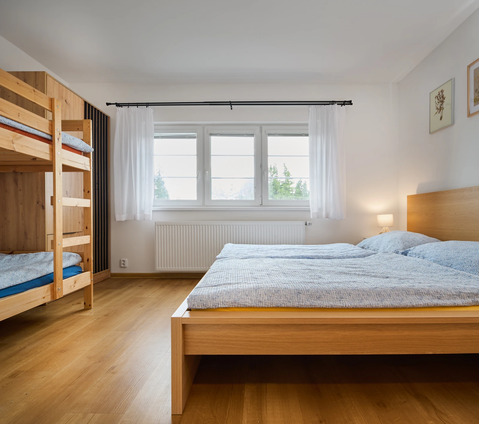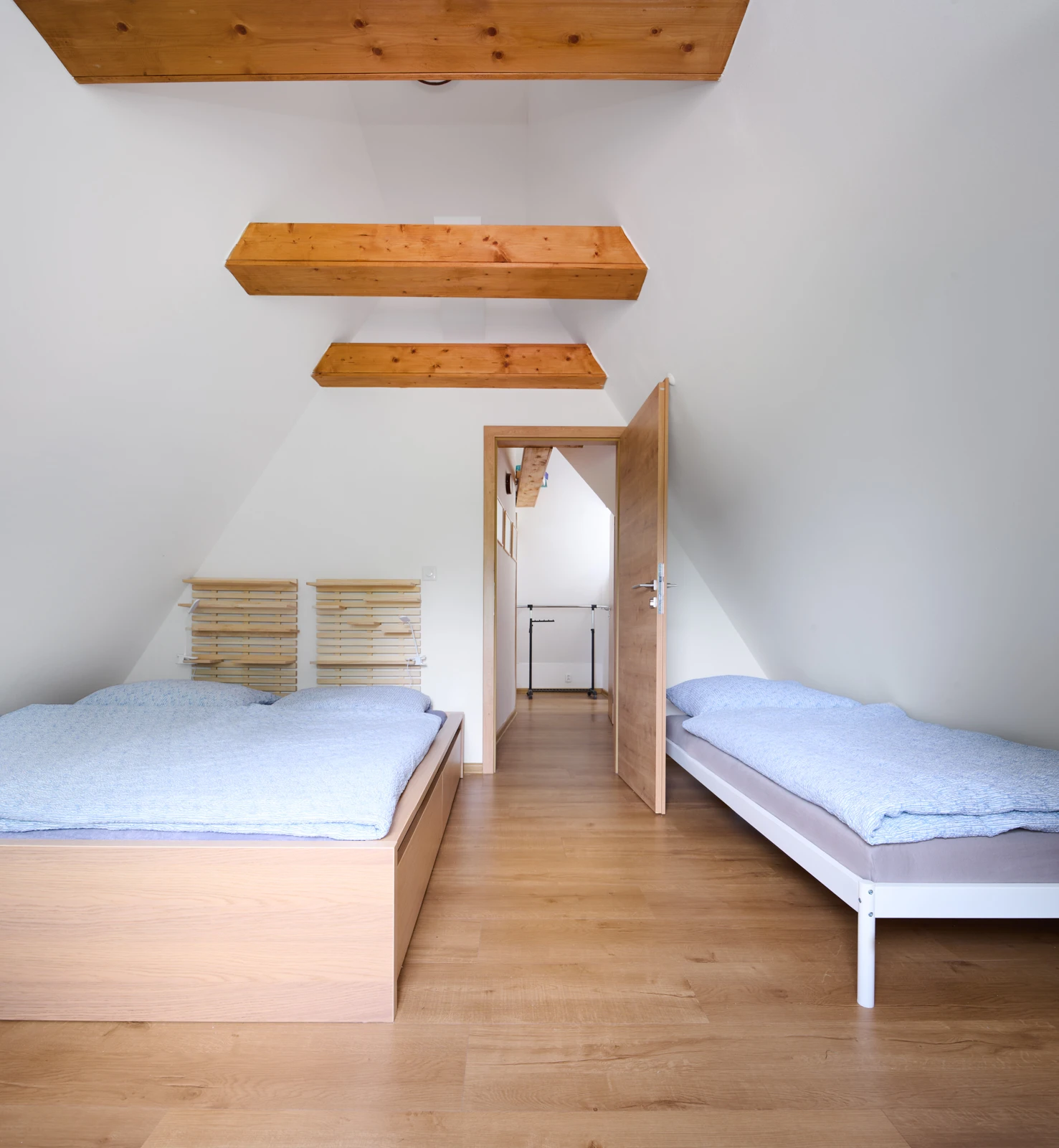 - Pokoj č. 2 (1. patro): manželské dvoulůžko + přistýlka