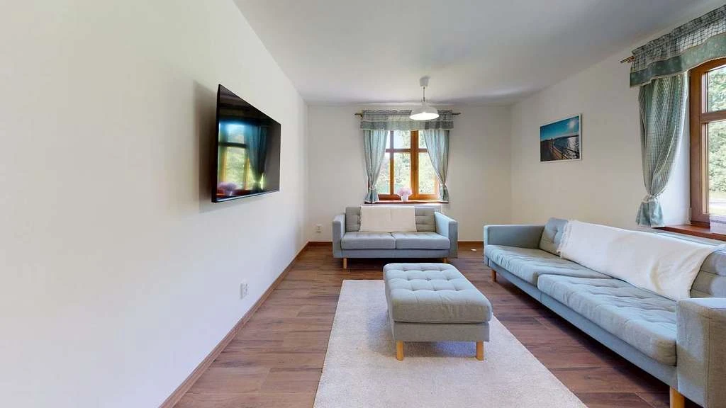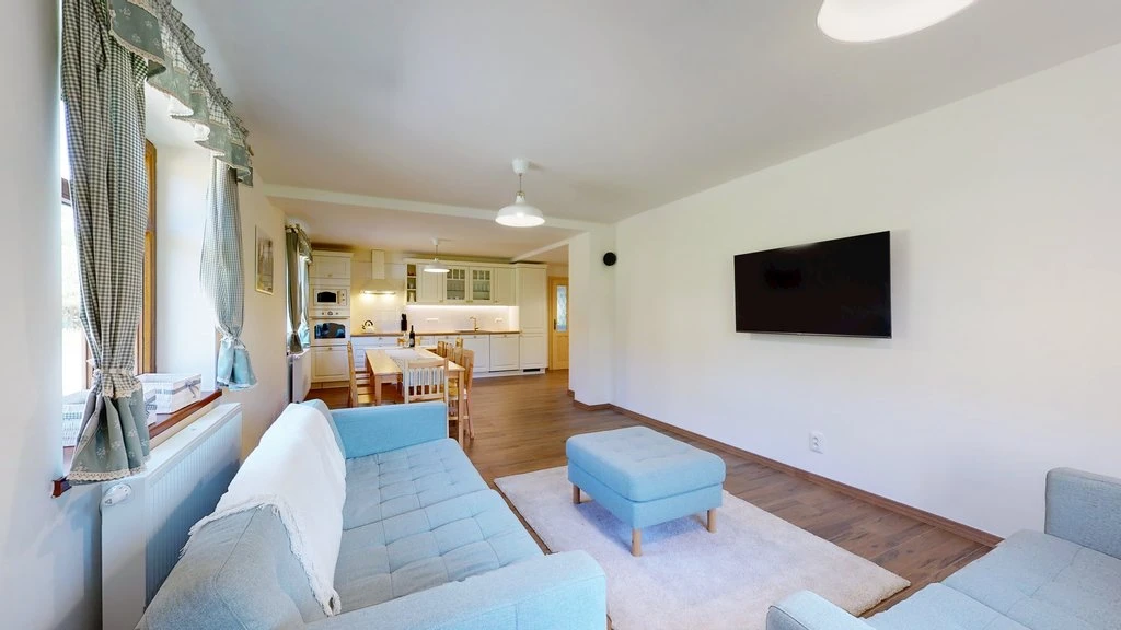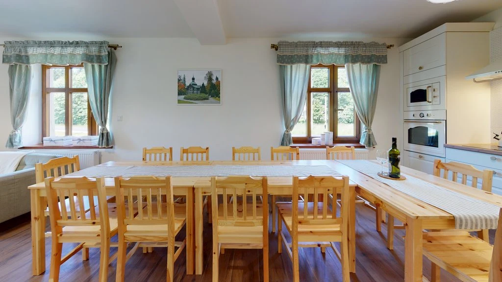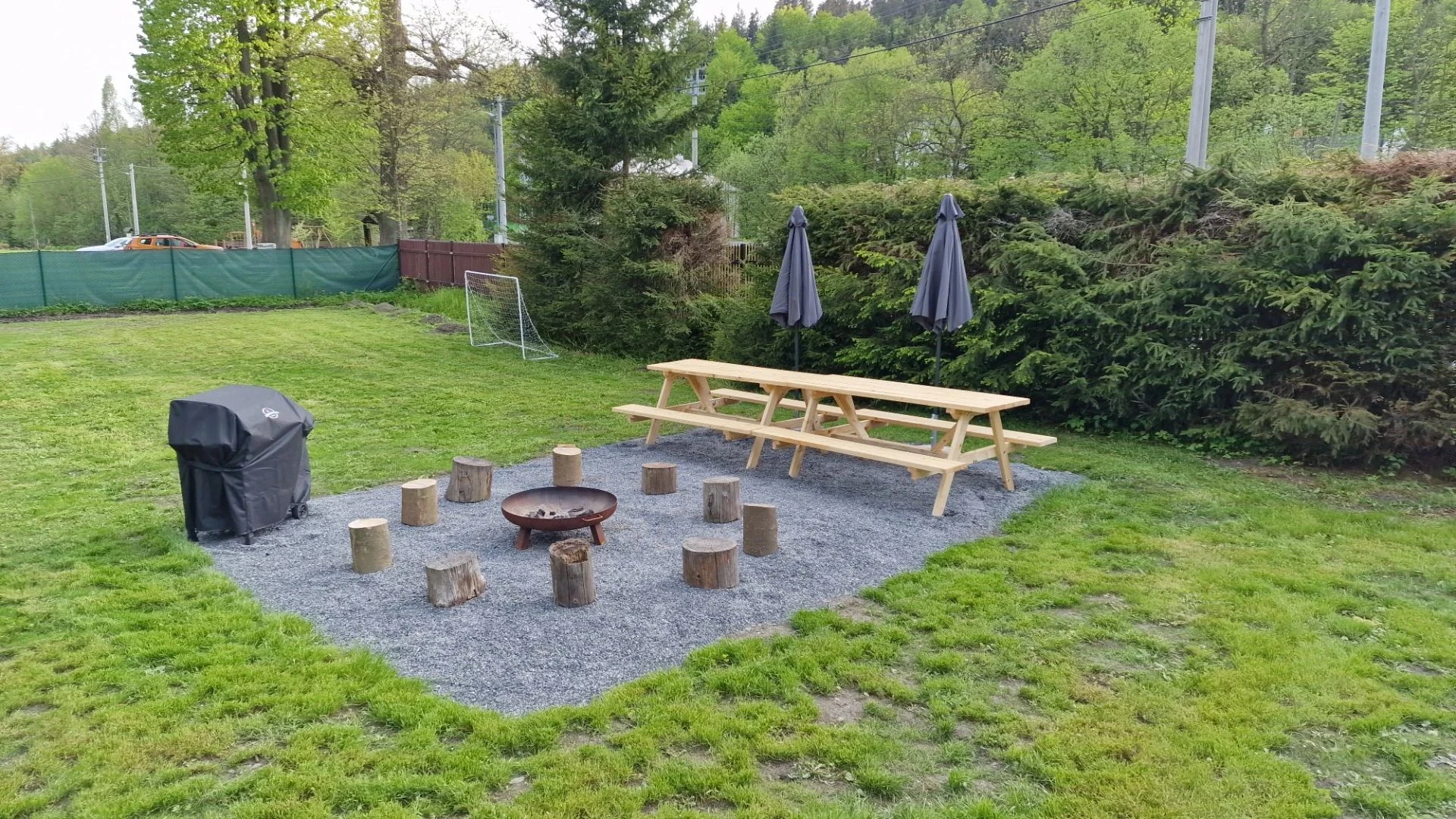 Společenská místnost propojená s plně vybavenou kuchyní umožňuje pohodlné posezení u jídla i večerní relaxaci. Chata je vybavena WiFi připojením a moderní televizí. Na venkovním oploceném pozemku o rozloze 2 000 m² je k dispozici ohniště, gril, dětské hřiště, trampolína a relaxační zóna.