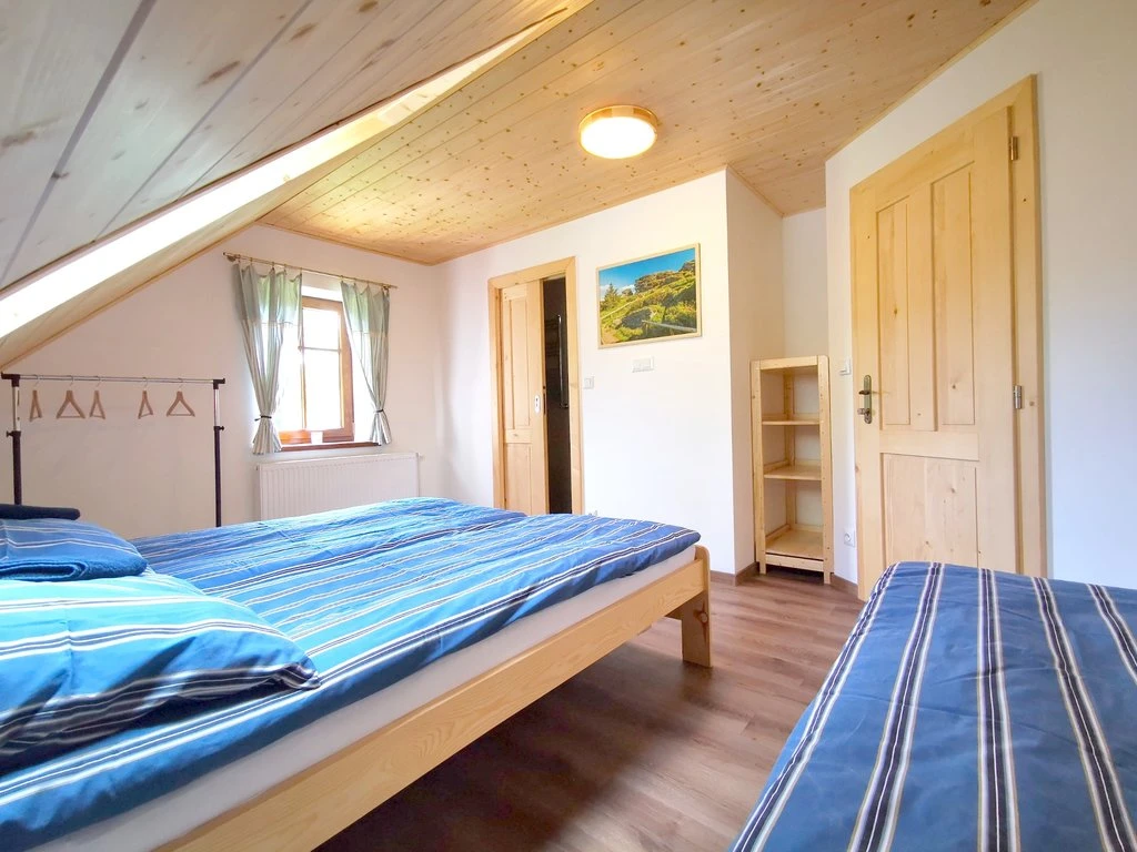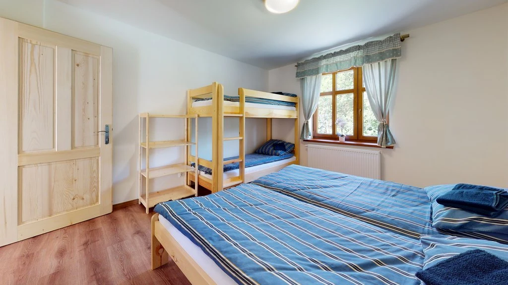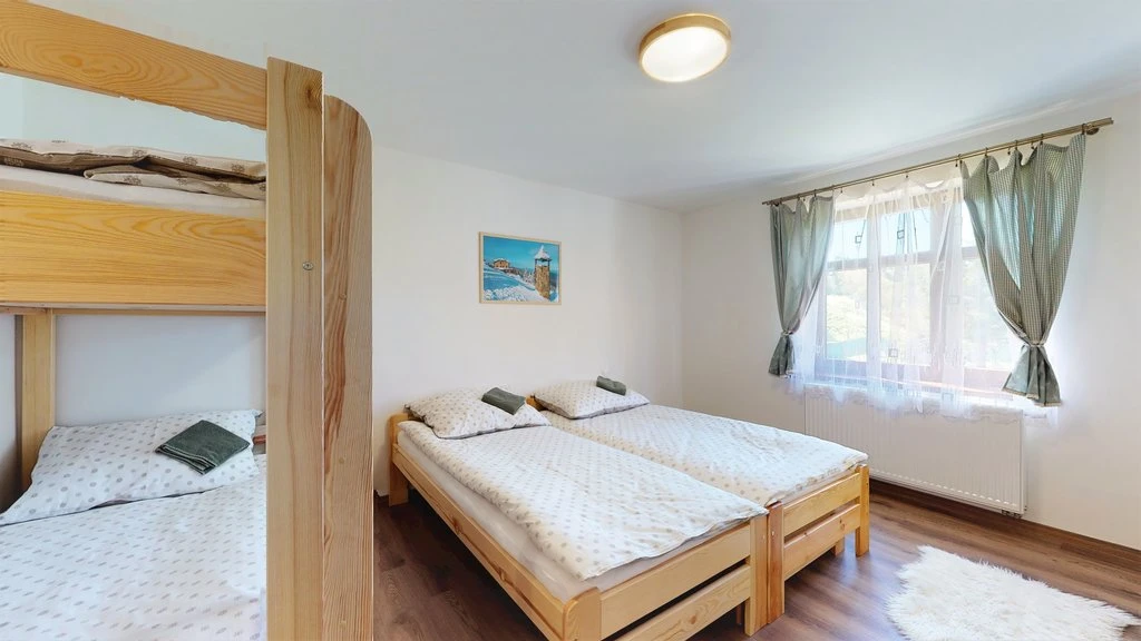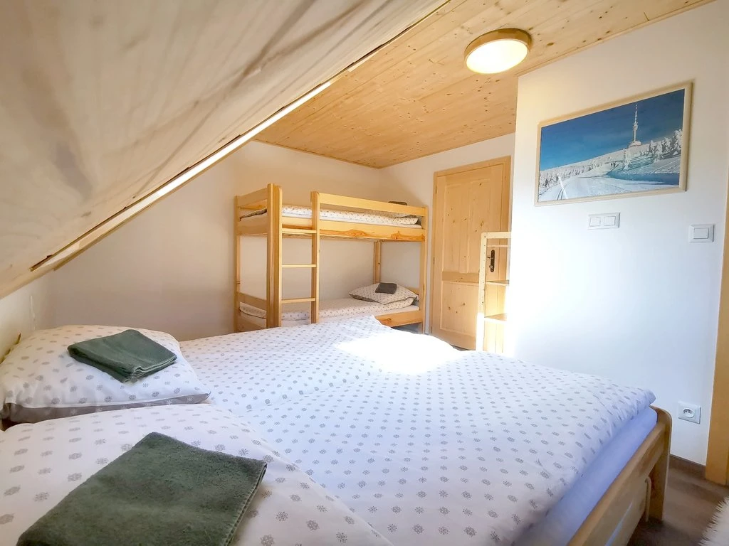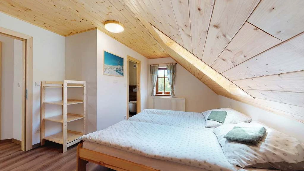 Chata4hory Malá Morávka - Karlov pod Pradědem nabízí komfortní ubytování pro až 18 osob ve 4 prostorných ložnicích. Každá ložnice je vybavena samostatnými lůžky, které lze spojit do manželských postelí, a také patrovými postelemi. Hostům je k dispozici 5 koupelen se sprchovým koutem a toaletou, což zajišťuje dostatek soukromí i pro větší skupiny.