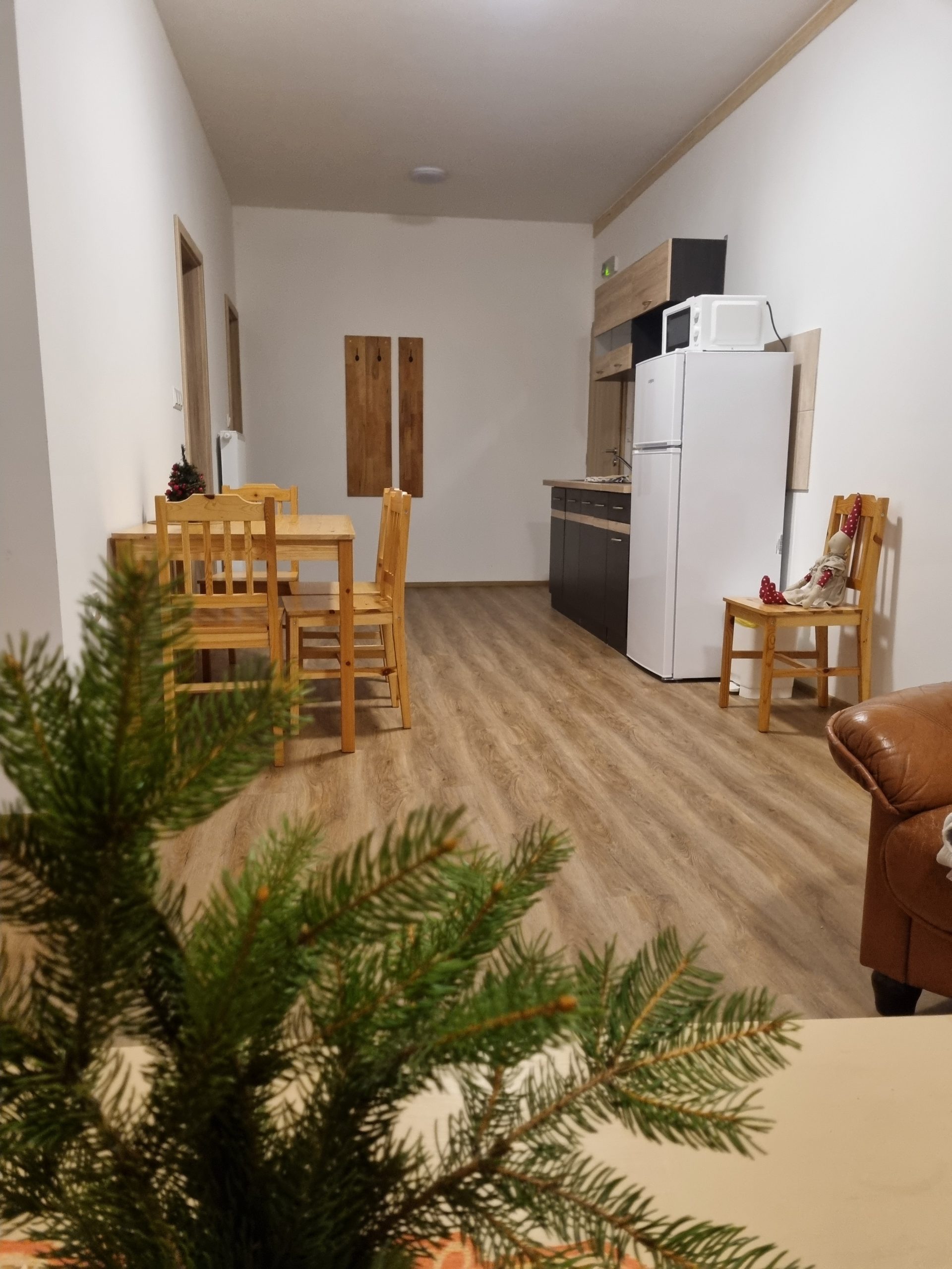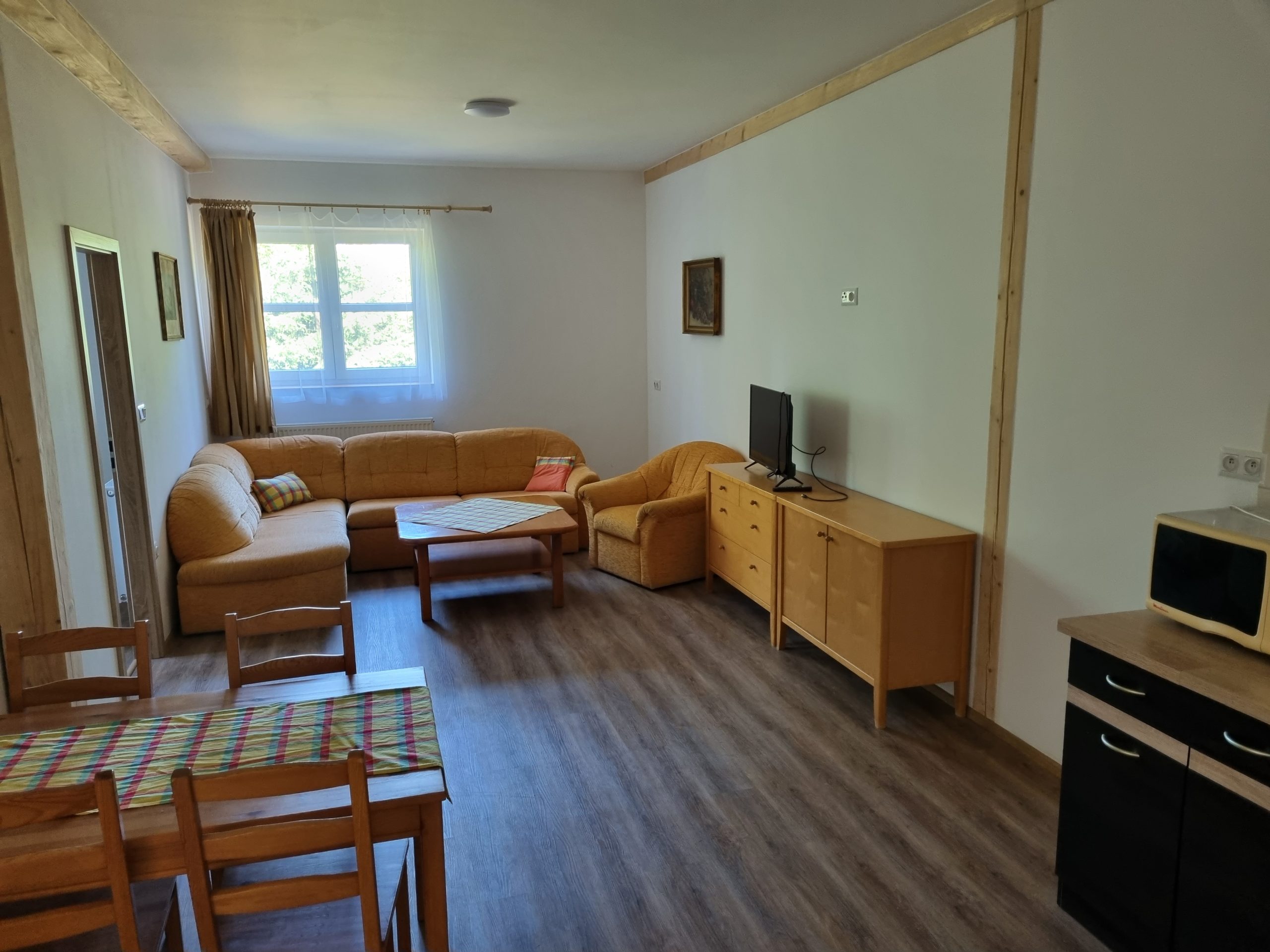 Apartmán se nachází v 1. patře hlavní budovy, cca 50 m od chat.Je vhodný pro 5 osob (bez uvedené možnosti přistýlky).Dispozice a vybavení:2 samostatné ložniceložnice s manželskou postelí (2 lůžka)ložnice s manželskou postelí a jednolůžkem (3 lůžka)Obývací pokoj propojený s kuchyníTVjídelní stůlKoupelnaPlně vybavená kuchyňlednice s mrazákemmikrovlnná troubavarná konvicesklokeramická varná deskazákladní kuchyňské nádobíDalší informace:Wi-Fi připojení k dispoziciPosezení a ohniště před budovou (společné)