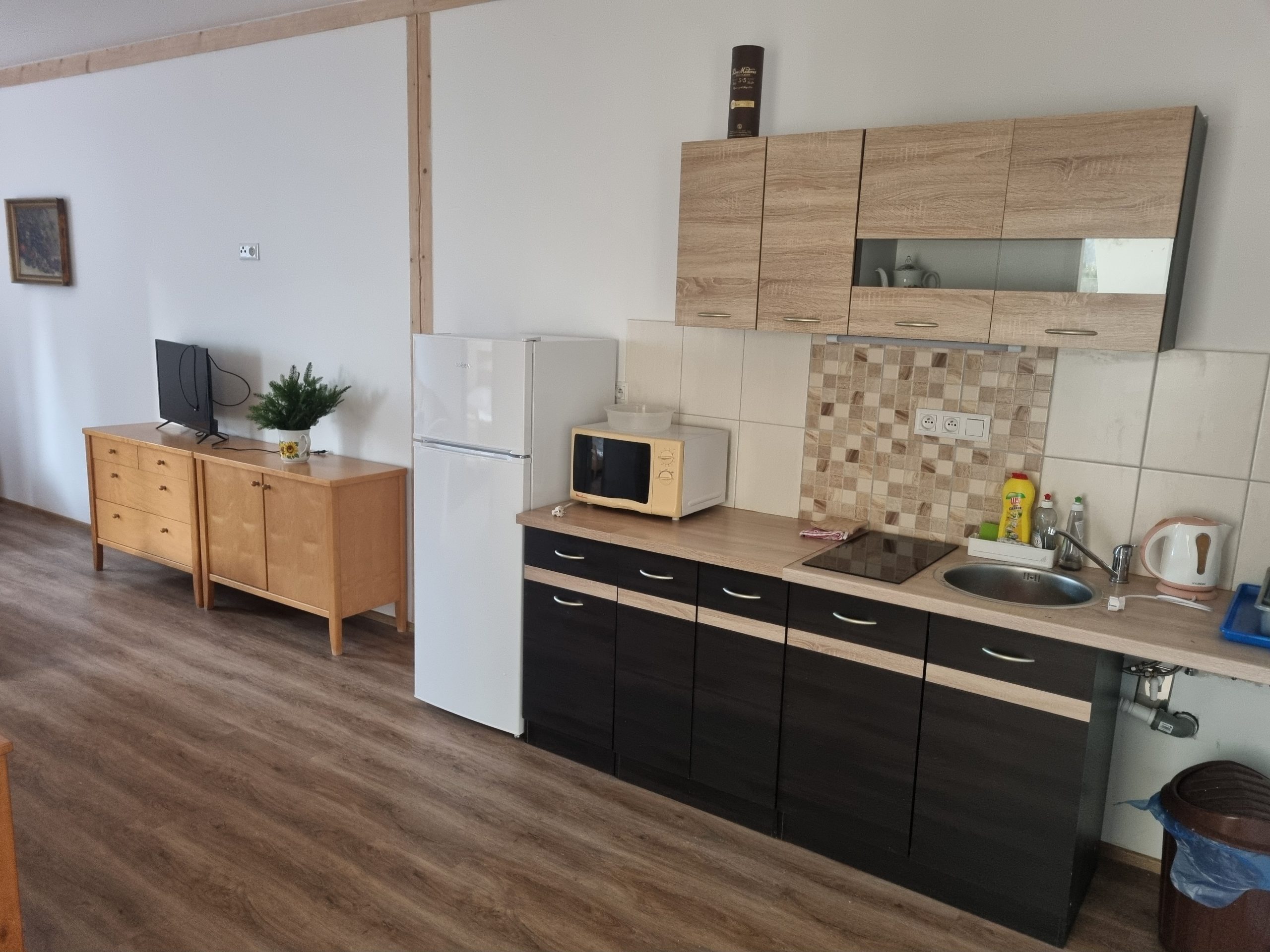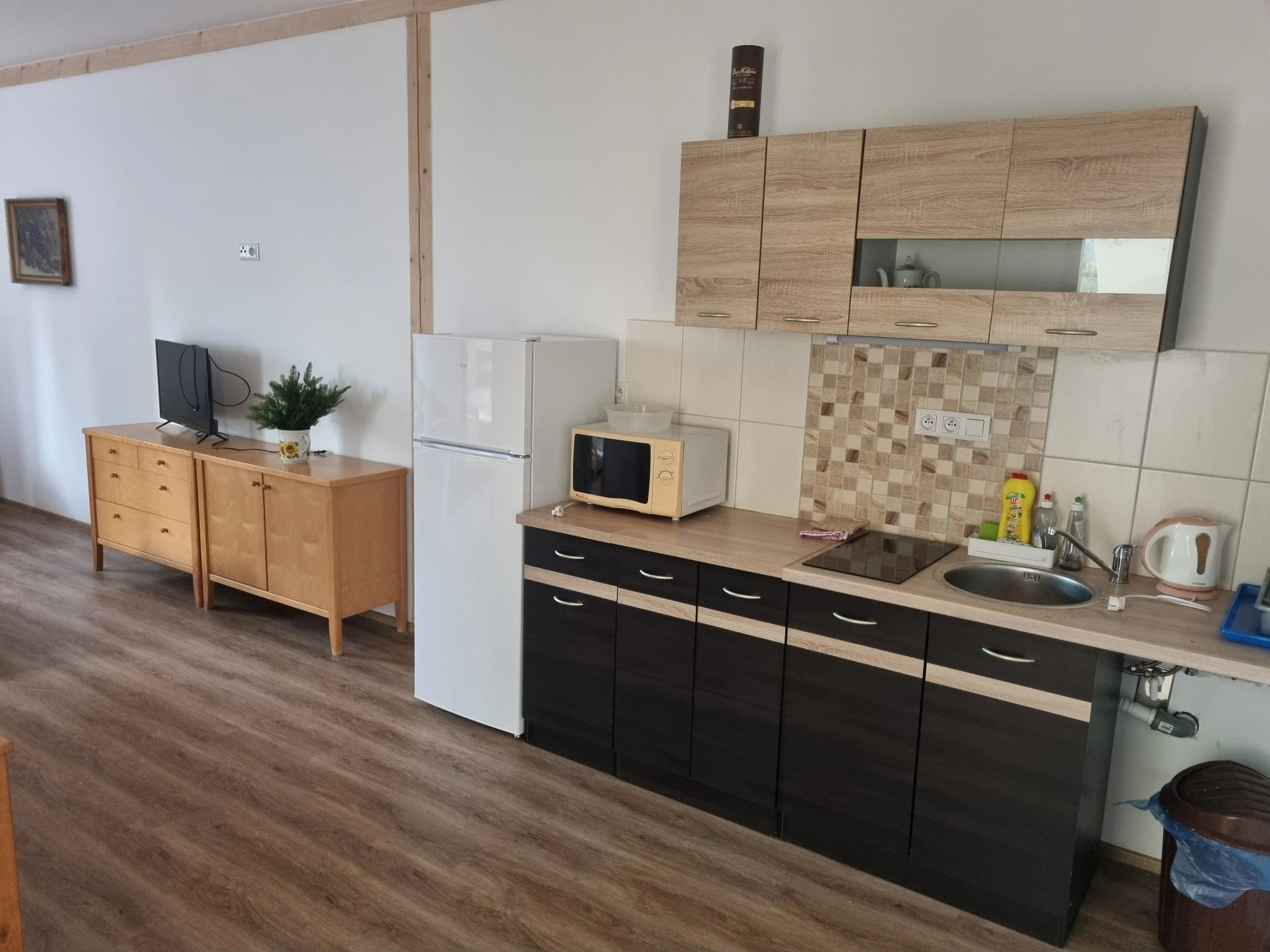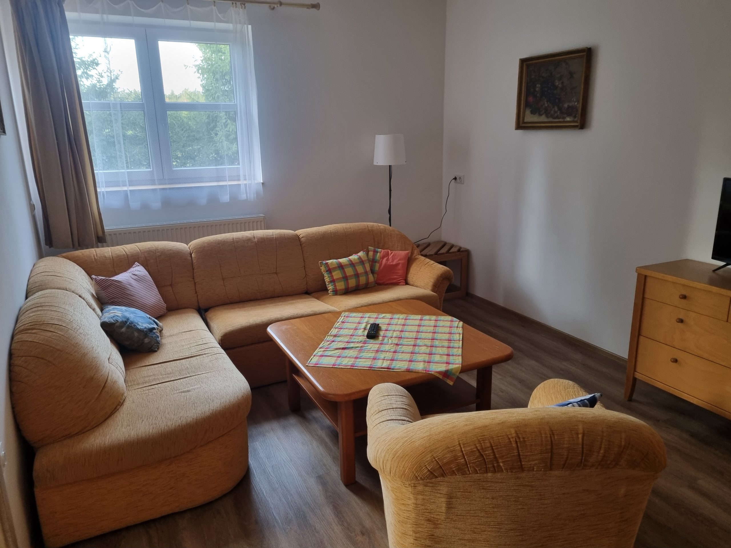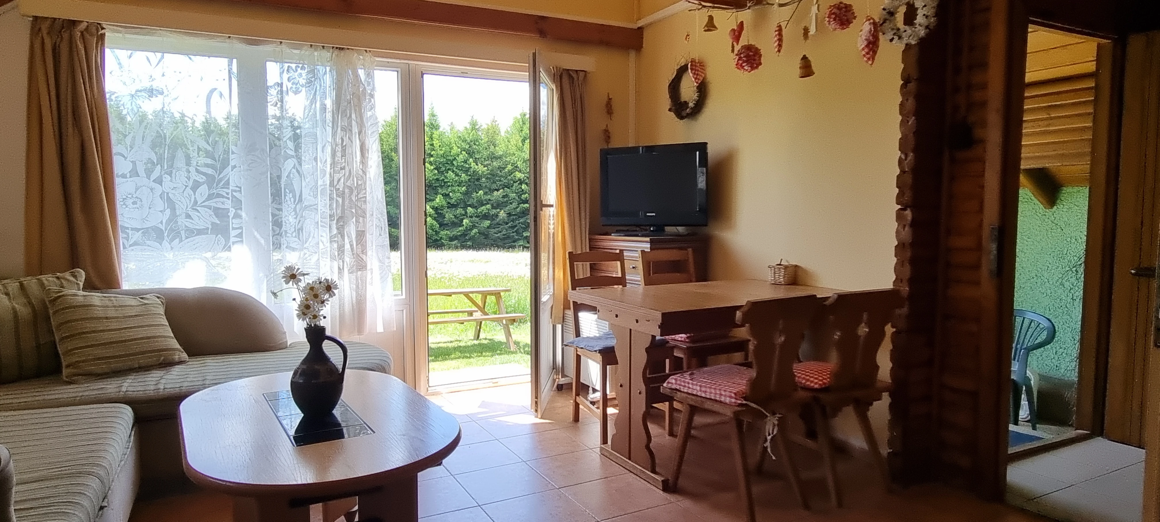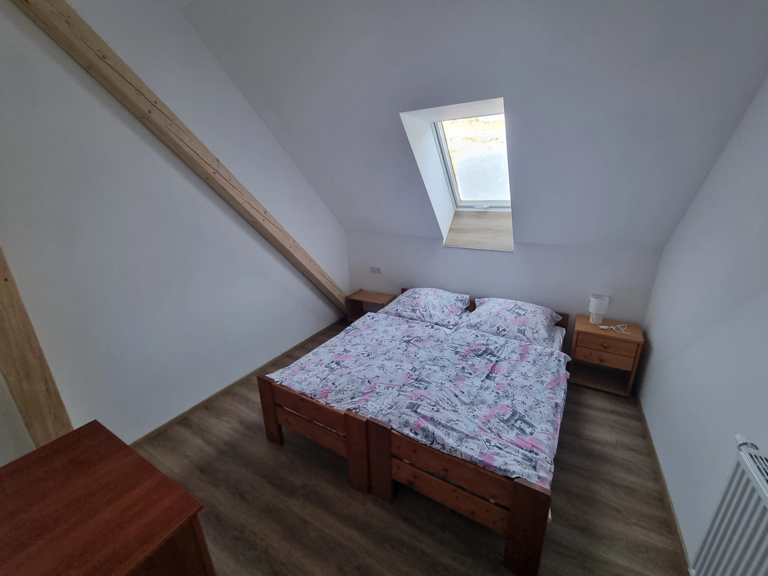 Apartmán se nachází v 1. patře hlavní budovy, cca 50 m od chat.Je vhodný pro 5 osob s možností 2 přistýlek na rozkládací sedačce.Dispozice a vybavení:2 samostatné ložniceložnice s manželskou postelí (2 lůžka)ložnice s manželskou postelí a jednolůžkem (3 lůžka)Obývací pokoj propojený s kuchynírozkládací sedačka (přistýlka pro 2 osoby)TVjídelní stůlKoupelnaPlně vybavená kuchyňlednice s mrazákemmikrovlnná troubavarná konvicesklokeramická varná deskazákladní kuchyňské nádobíDalší informace:Wi-Fi připojení k dispoziciPosezení a ohniště před budovou (společné)