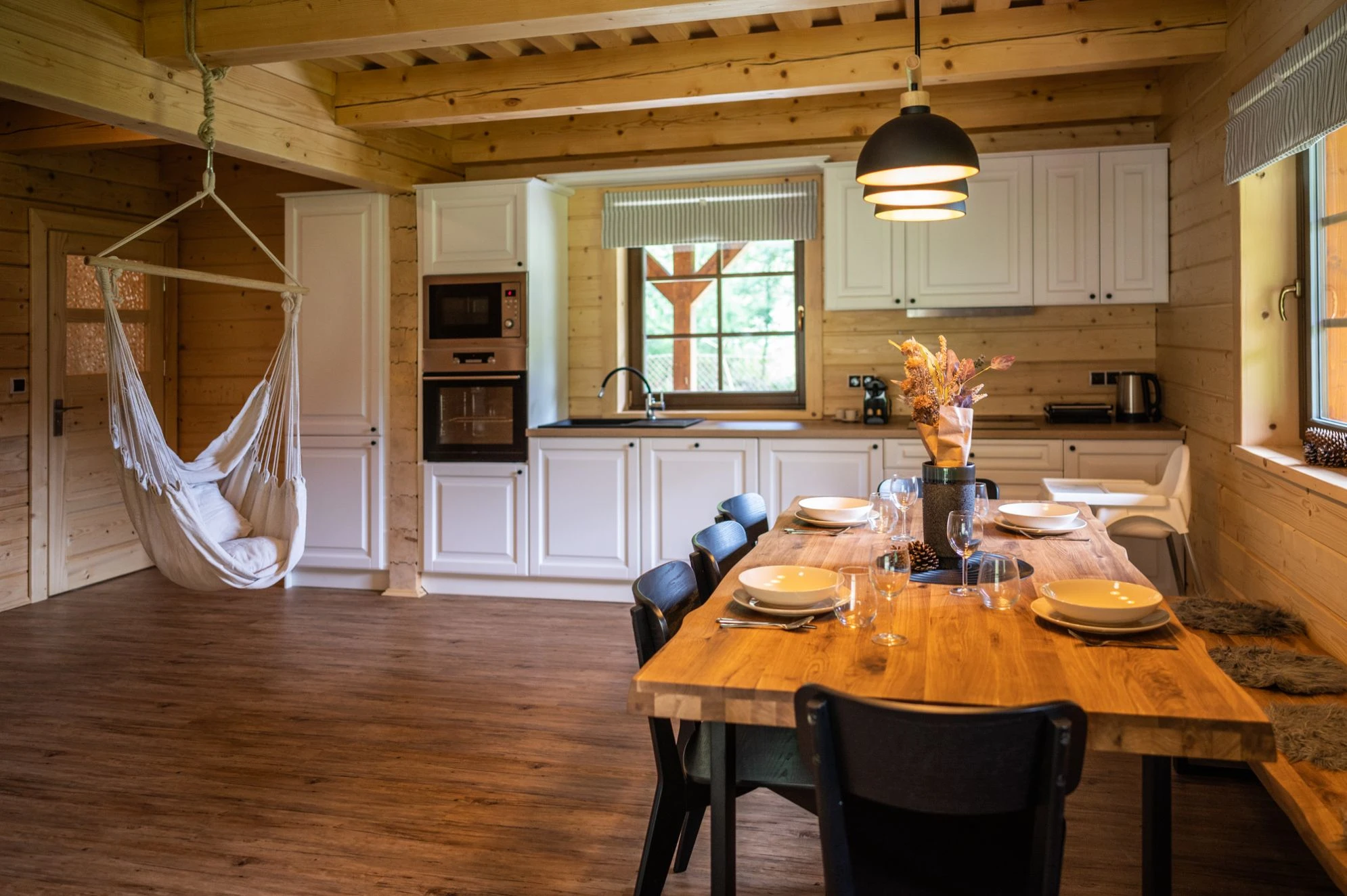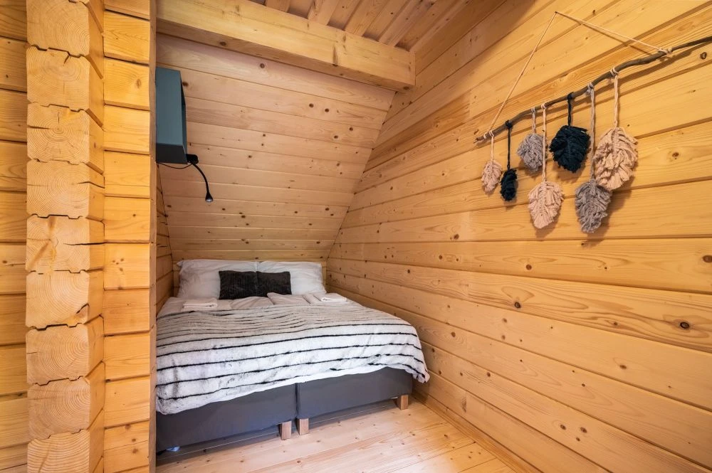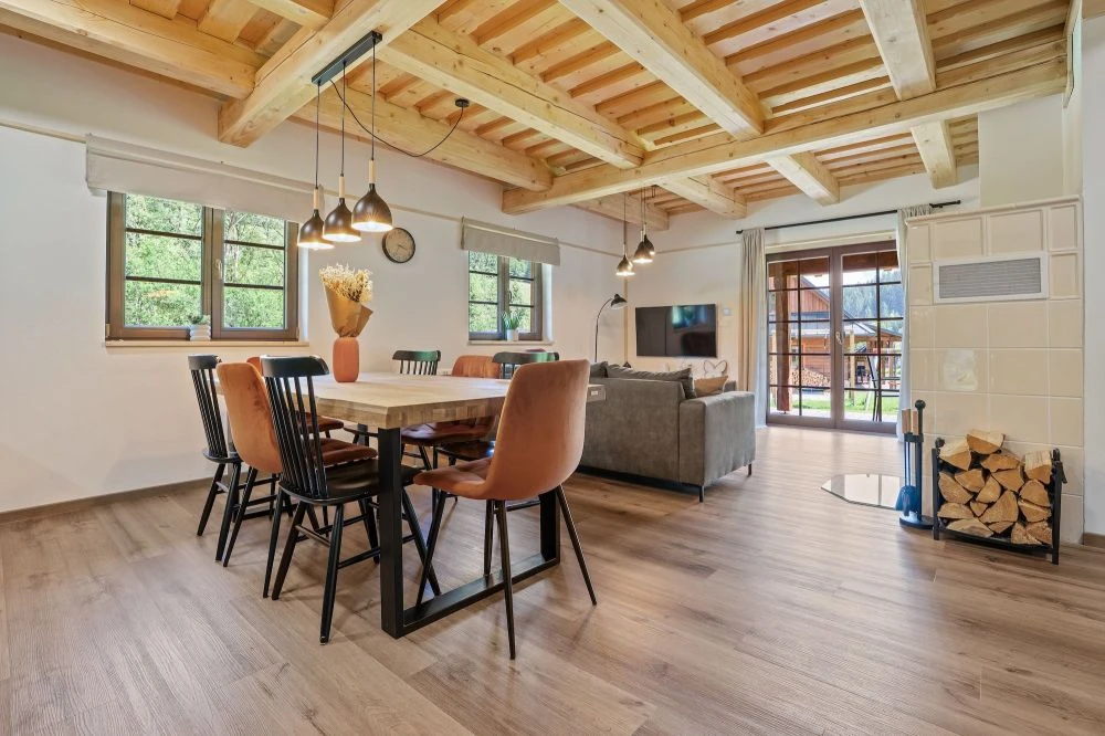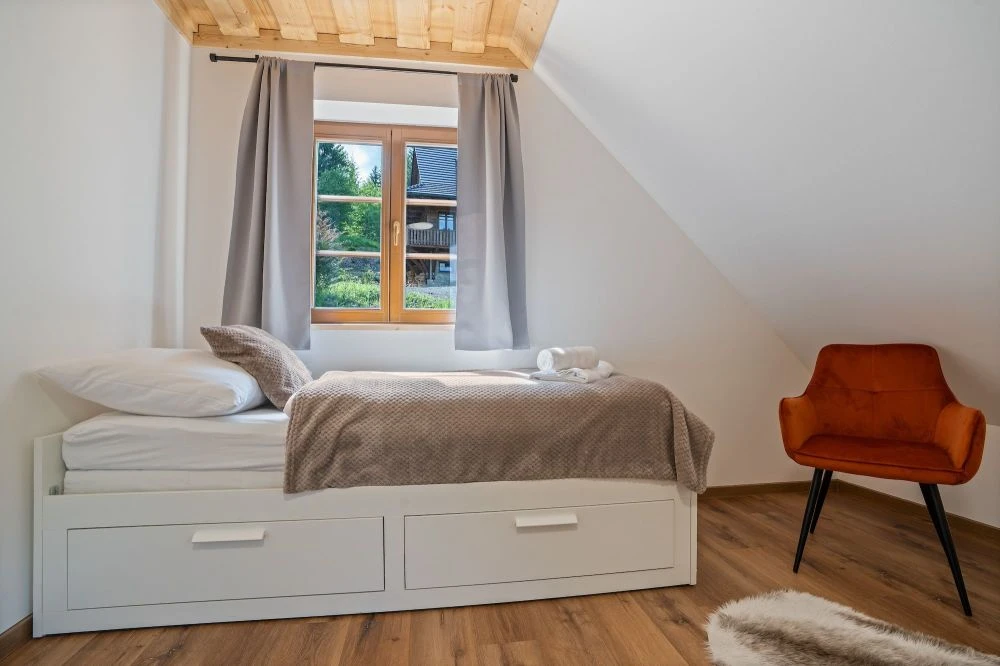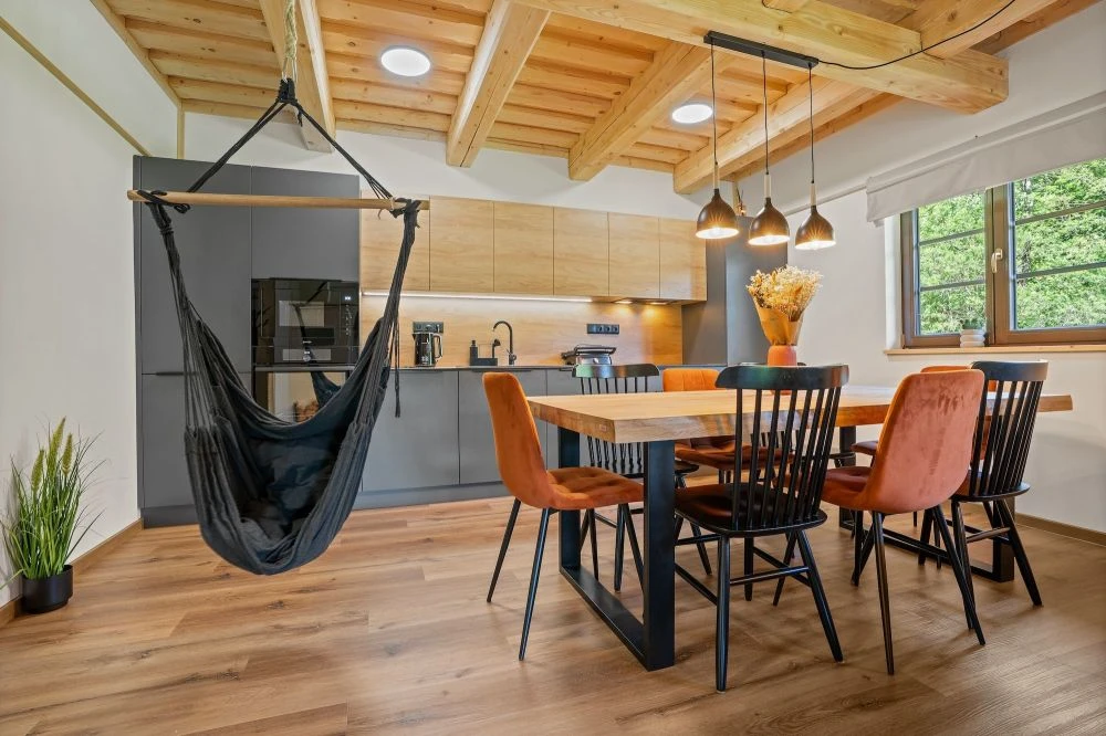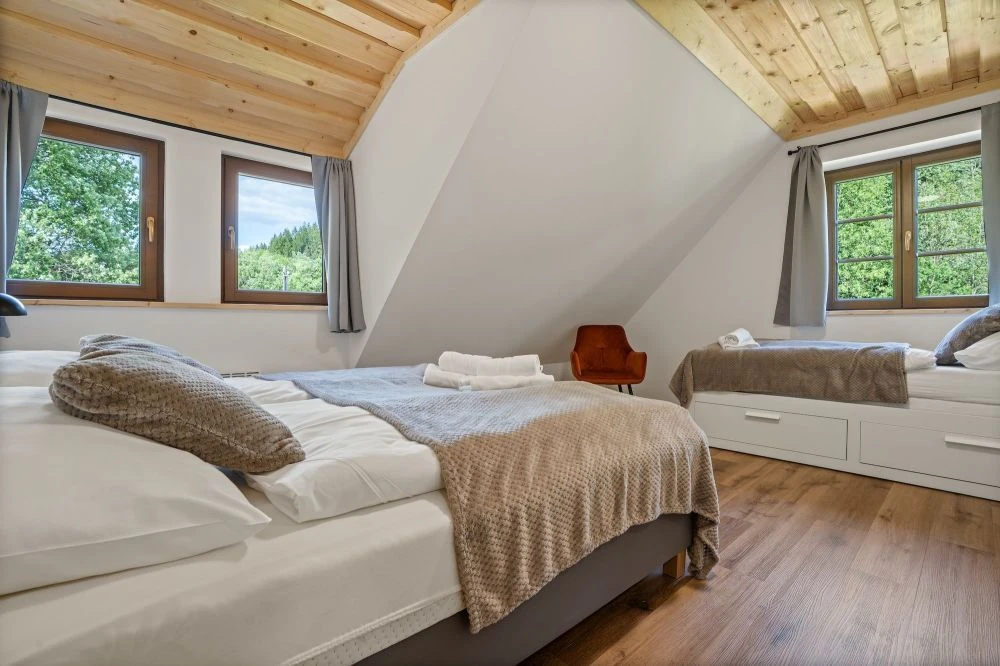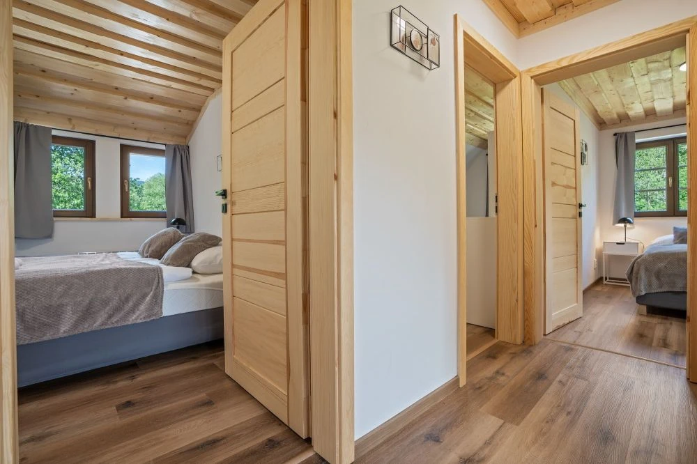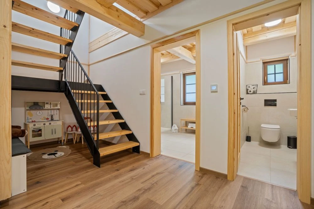 Samostatná chalupa je určena pro až 10 hostů a má samostatný vstup. Chalupa je dvoupodlažní.V přízemí se nachází prostorná předsíň, hlavní obytný prostor s kuchyní a obývacím pokojem, koupelna a samostatné WC.V patře jsou tři ložnice s kapacitou 4, 4 a 2 hosté a koupelna s WC. Chalupa má vlastní krytou terasu s posezením a venkovní ohniště.Vybavení chalupy:Plně vybavená kuchyně: myčka, lednice, trouba, mikrovlnka, varná deska, varná konvice, toustovač, kávovar NespressoKachlová kamnaWi-Fi připojeníO2 TVDeskové hryDětská jídelní židličkaDětský koutek pod schodyHoupačkaFén, ručníky, ložní prádlo, sprchaOhniště s grilem, krytá terasa s posezením, parkoviště, dětské hřiště