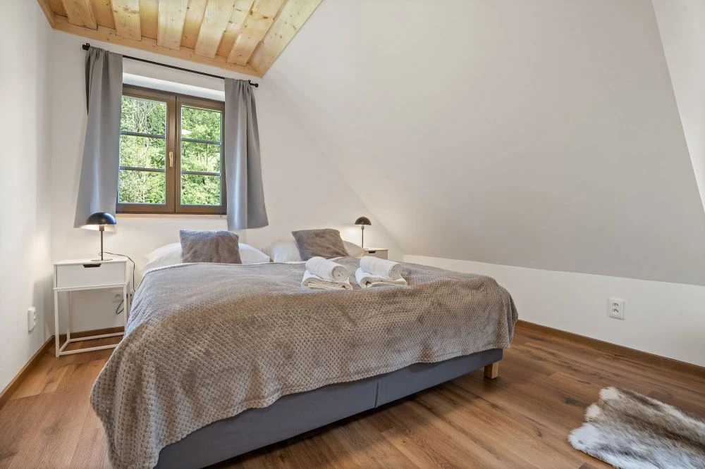 Apartmán je součástí Dvojchalupy a je určen pro 8–10 hostů. Apartmán má samostatný vstup a je řešen ve dvou podlažích.V přízemí se nachází prostorná předsíň, hlavní obytný prostor s kuchyní a obývacím pokojem, koupelna a samostatné WC. V obytné části je rozkládací pohovka pro 2 osoby.V patře jsou tři ložnice – dva pokoje s manželskými postelemi a jeden pokoj se dva jednolůžky a menší manželskou postelí. Součástí patra je také samostatné WC. Kapacita lůžek v patře je 8 osob.Apartmán má vlastní krytou terasu s posezením a venkovní ohniště.Vybavení apartmánu:Plně vybavená kuchyně: myčka, pračka, lednice, trouba, mikrovlnka, varná deska, varná konvice, toustovač, kávovar NespressoKachlová kamnaWi-Fi připojeníO2 TVDeskové hryDětská jídelní židličkaHoupačkaFén, ručníky, ložní prádlo, sprchaOhniště s grilem, krytá terasa s posezením, parkoviště, dětské hřiště