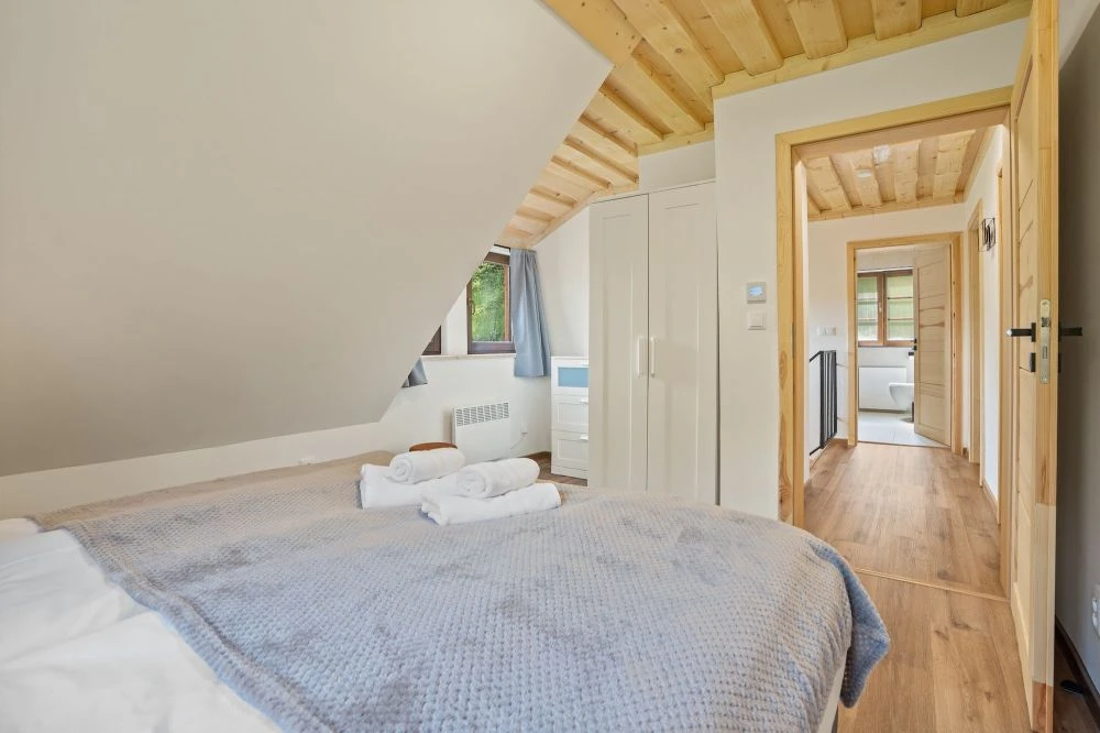 V patře jsou tři ložnice – dva pokoje s manželskými postelemi a jeden pokoj se dva jednolůžky a menší manželskou postelí. Součástí patra je také samostatné WC. Kapacita lůžek v patře je 8 osob.