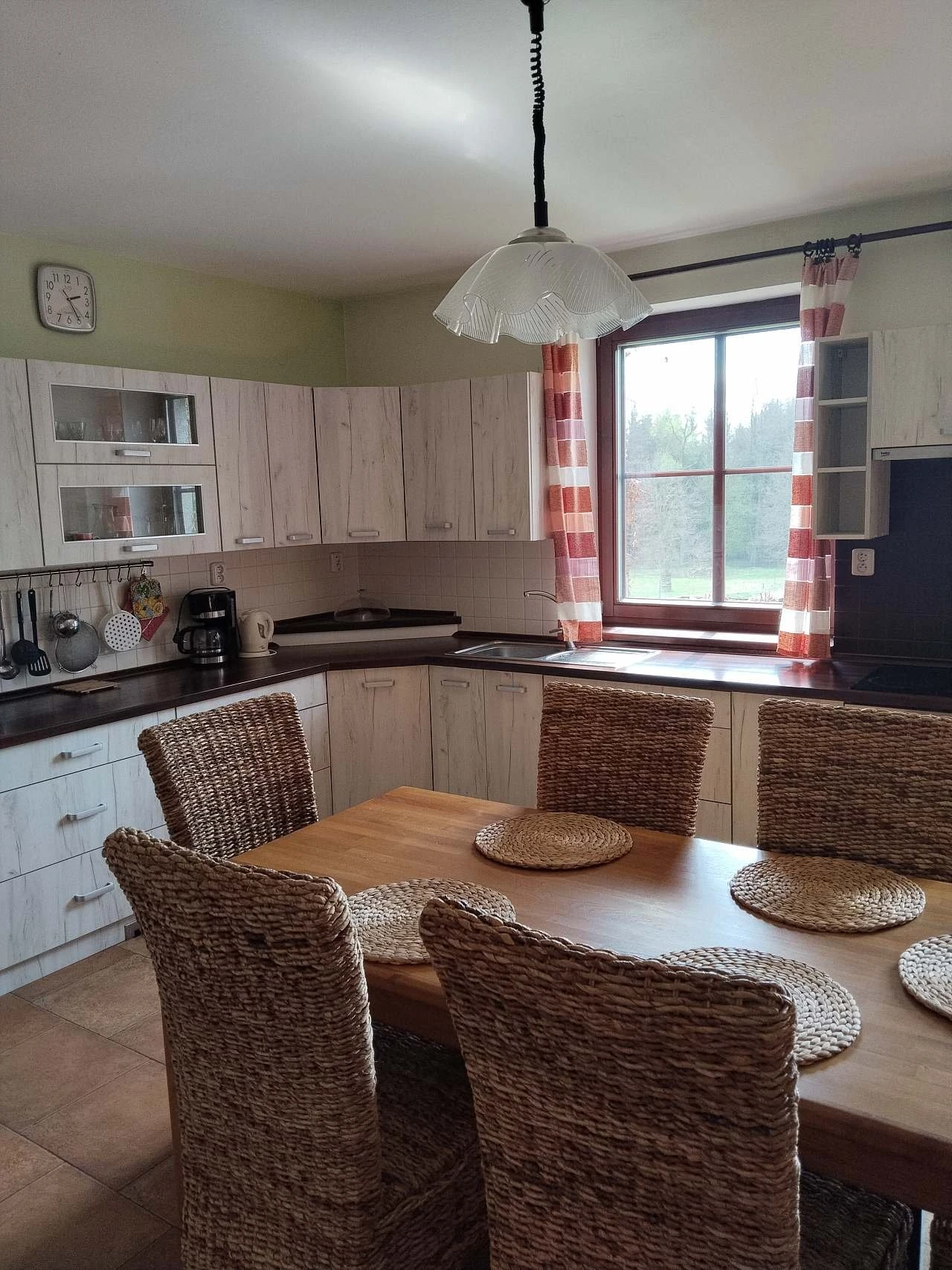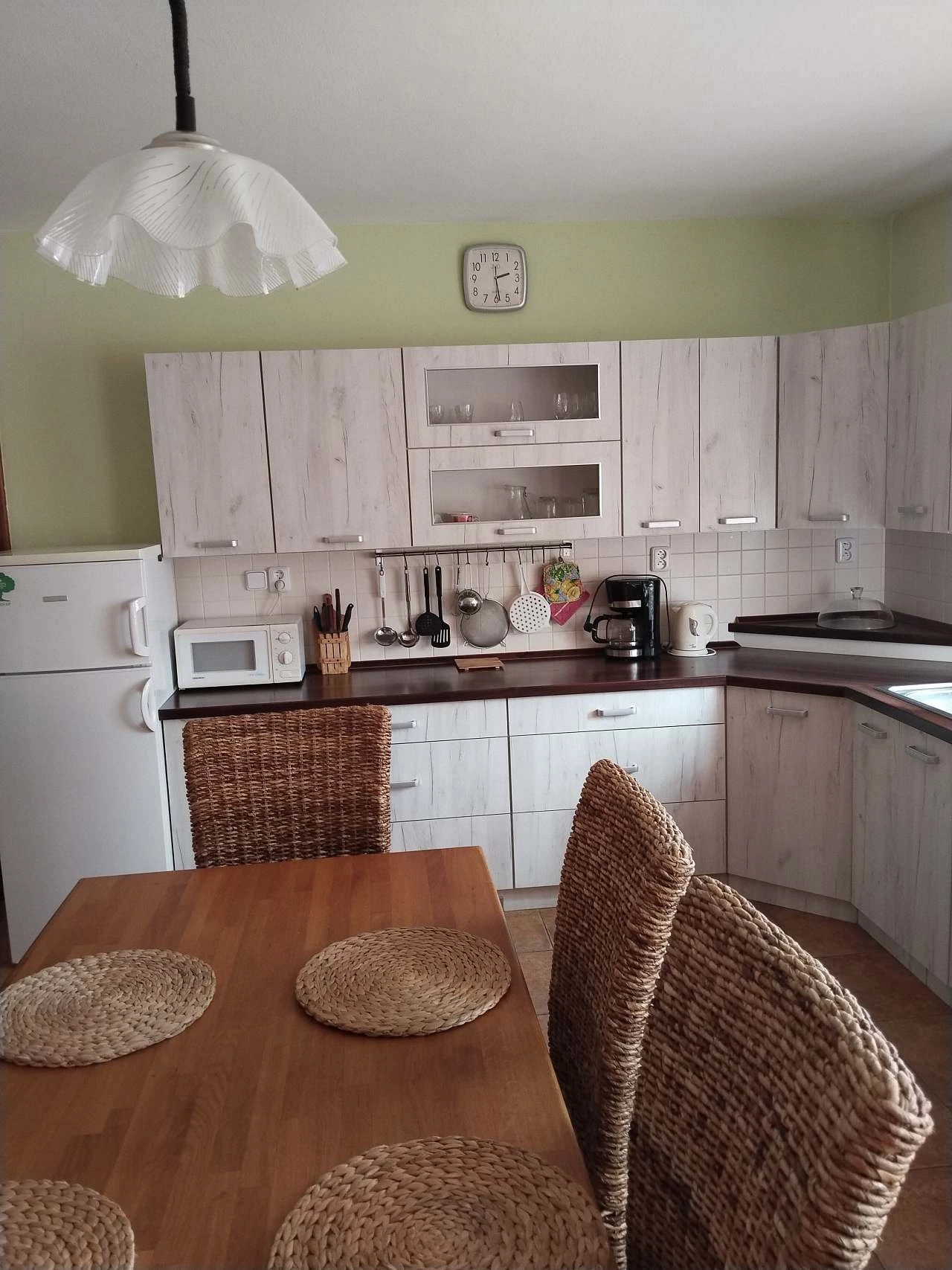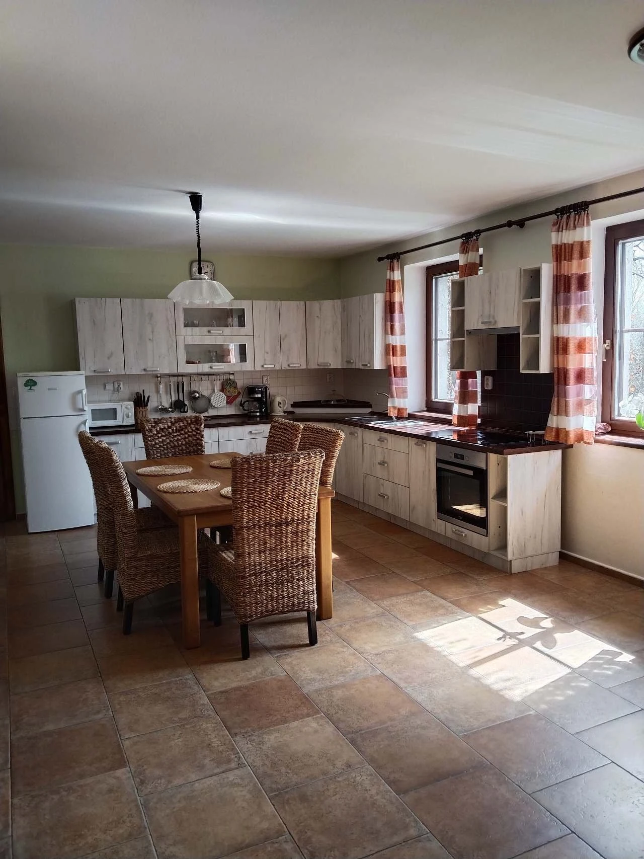 - Kuchyňská linka: lednice s mrazákem, mikrovlnná trouba, varná deska s troubou, rychlovarná konvice, kávovar