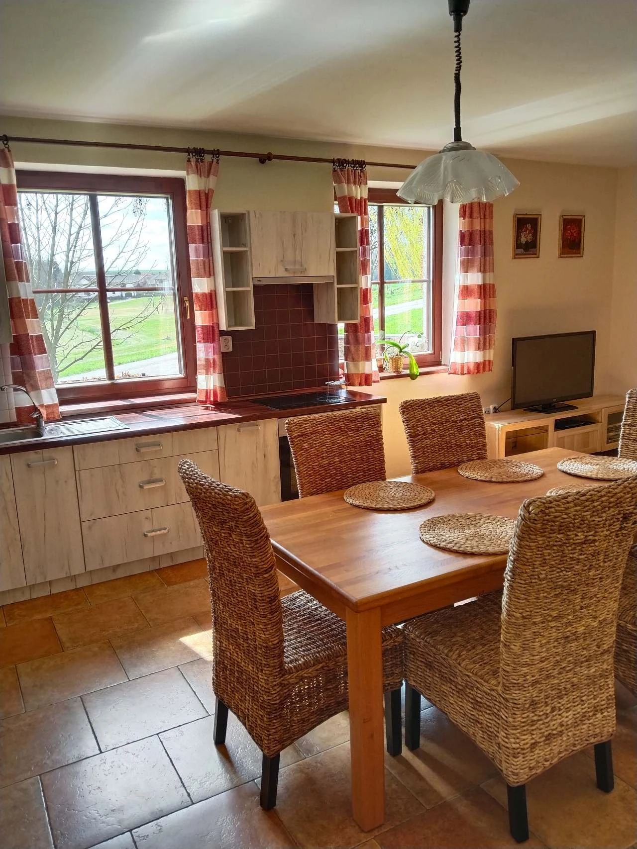 Farma Dolík v Havlíčkově Brodu nabízí apartmán pro 2 až 4 osoby. Do apartmánu se vstupuje přes zastřešenou terasu s posezením a společnou halu. Celý apartmán má přibližně 100 m² a je bezbariérový, zahrnuje velkou obytnou kuchyň, ložnici a prostornou koupelnu. Okna směřují na západ, s výhledem na louky, lesy a sousední statek.