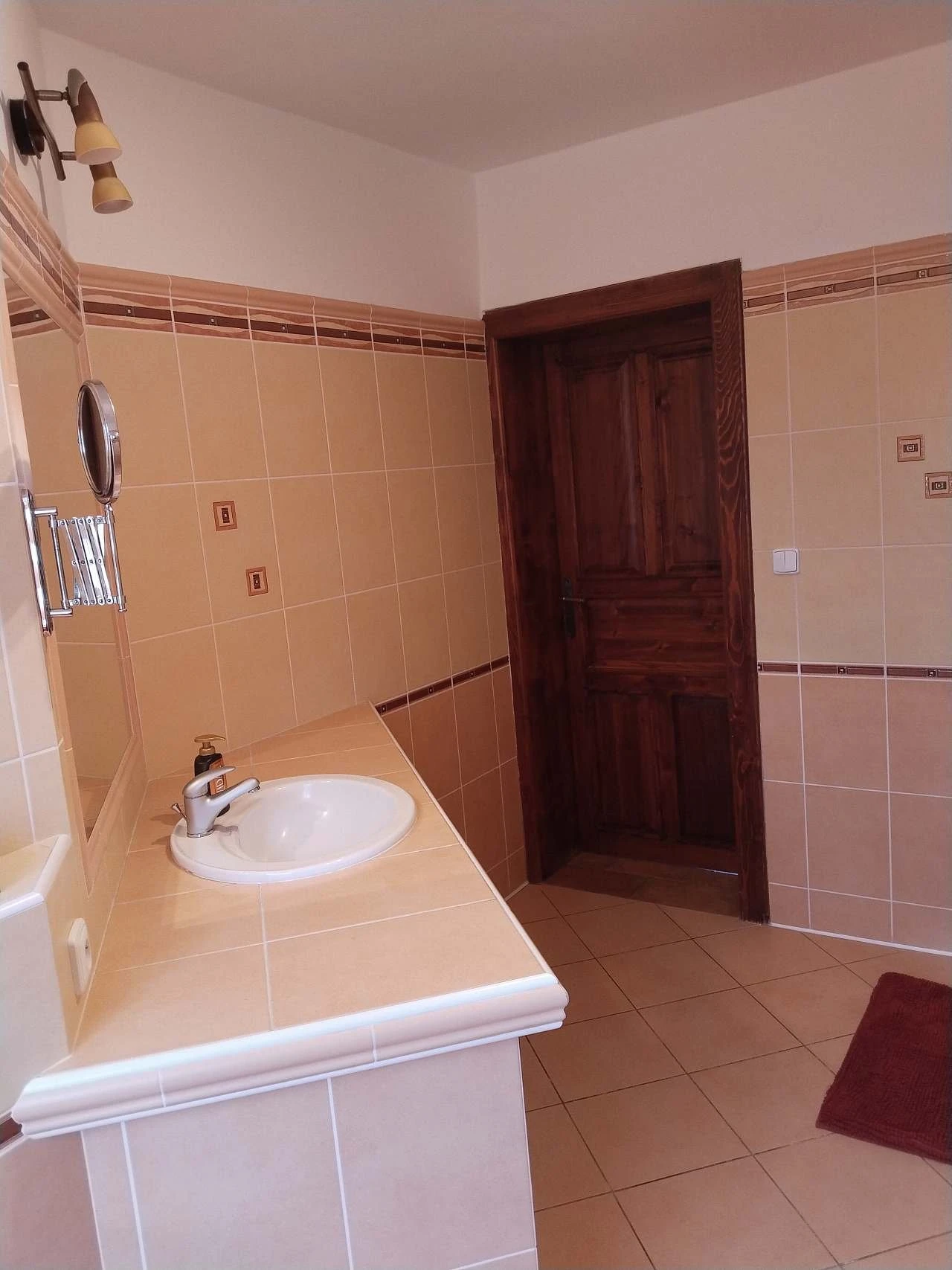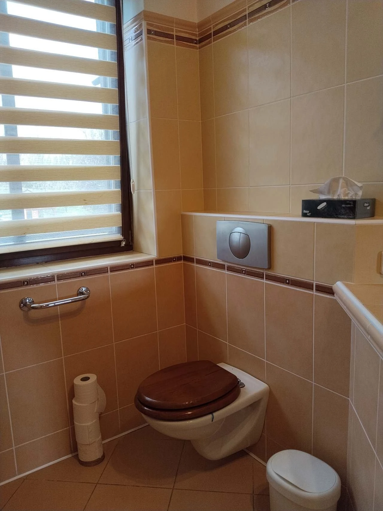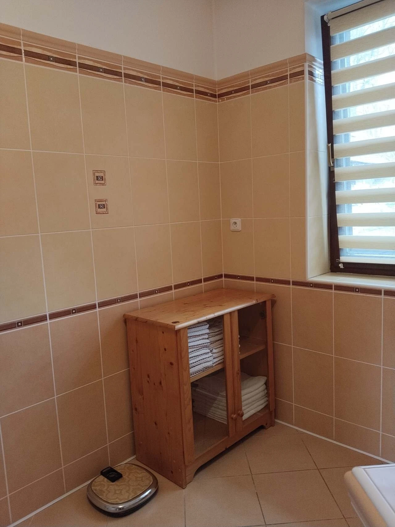 Prostorná koupelna je vybavená sprchovým koutem širokým 1 m, umyvadlem a WC, k dispozici je také fén. V celém objektu, včetně koupelny, je podlahové vytápění s regulací přes termostaty.