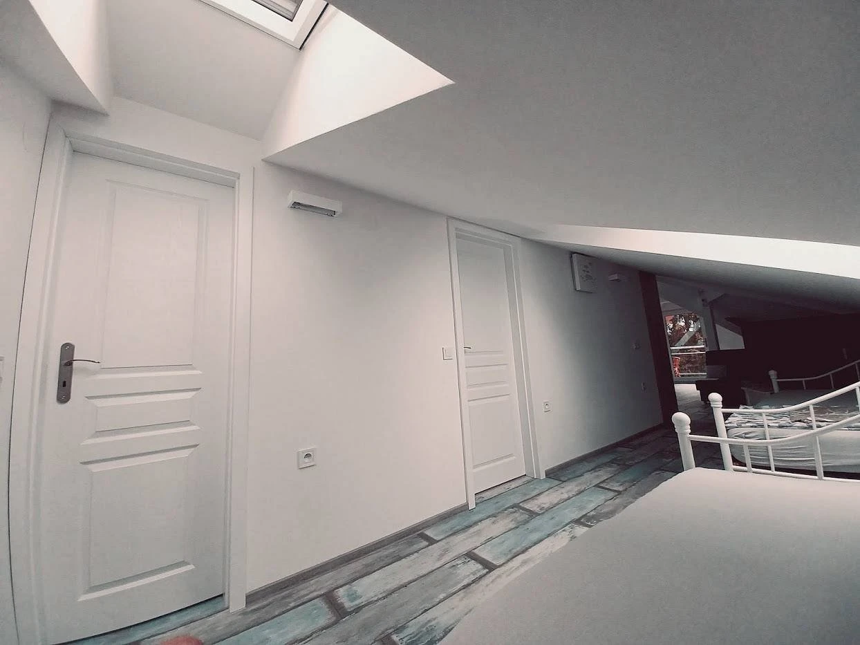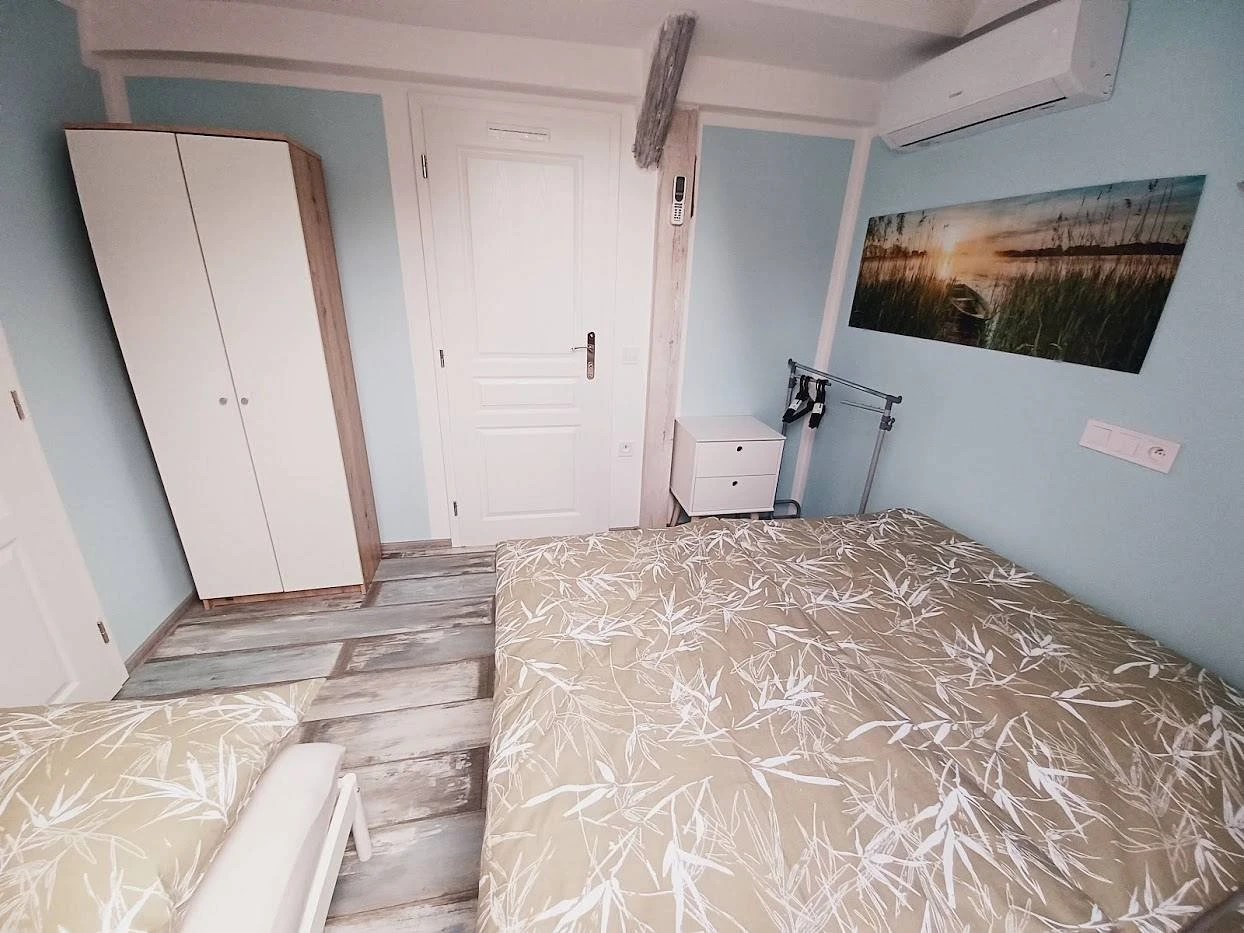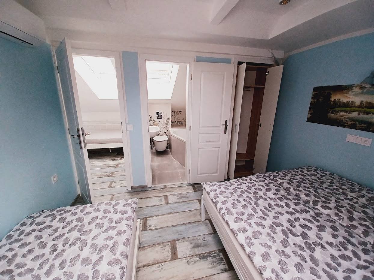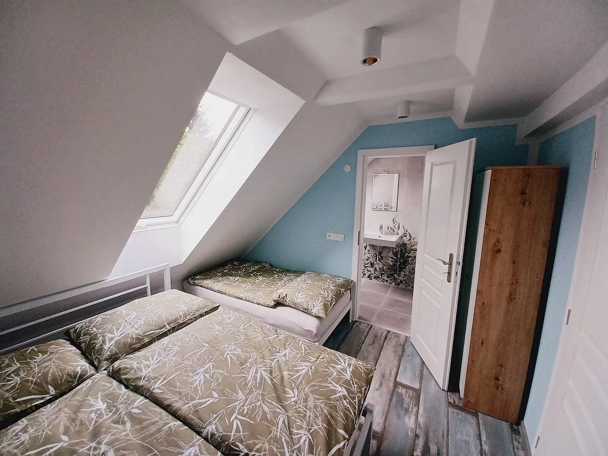 Dispozice: apartmán2 samostatné ložnice2× koupelna se sprchovým koutem a WC (každá ložnice má vlastní)průchozí pokoj s lůžkyspolečná kuchyňobývací pokojKapacita: 8 lůžek + 2 přistýlkyRozložení lůžek:Ložnice 1: 1× 180 × 200 cm + 1× 90 × 200 cmLožnice 2: 1× 180 × 200 cm + 1× 90 × 200 cmPrůchozí pokoj: 2× 90 × 200 cmObývací pokoj: rozkládací gauč (2× přistýlka)Vybavení:společná kuchyňobývací pokojklimatizace v každém pokojiApartmán je vhodný pro větší skupiny, maximální kapacita 10 osob včetně přistýlek.