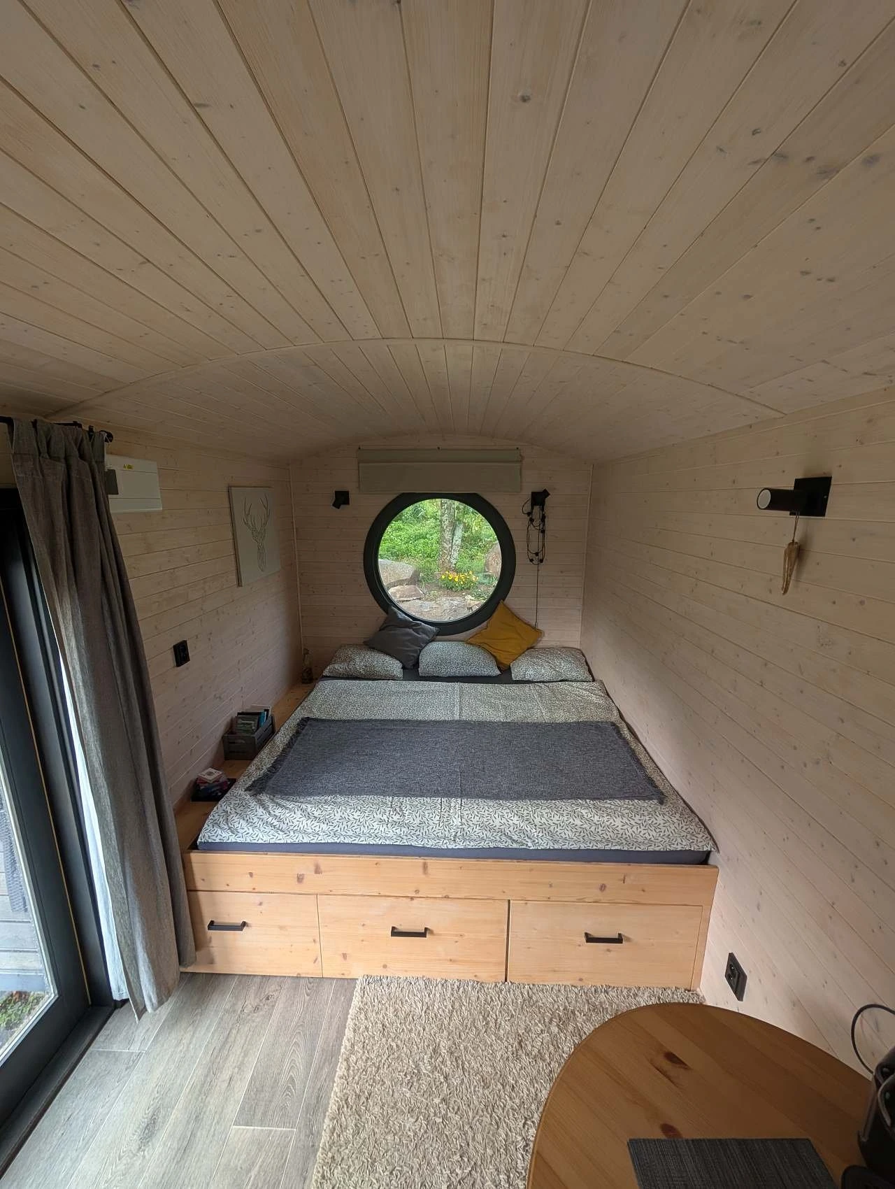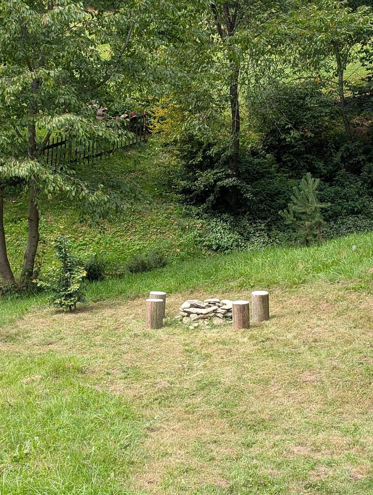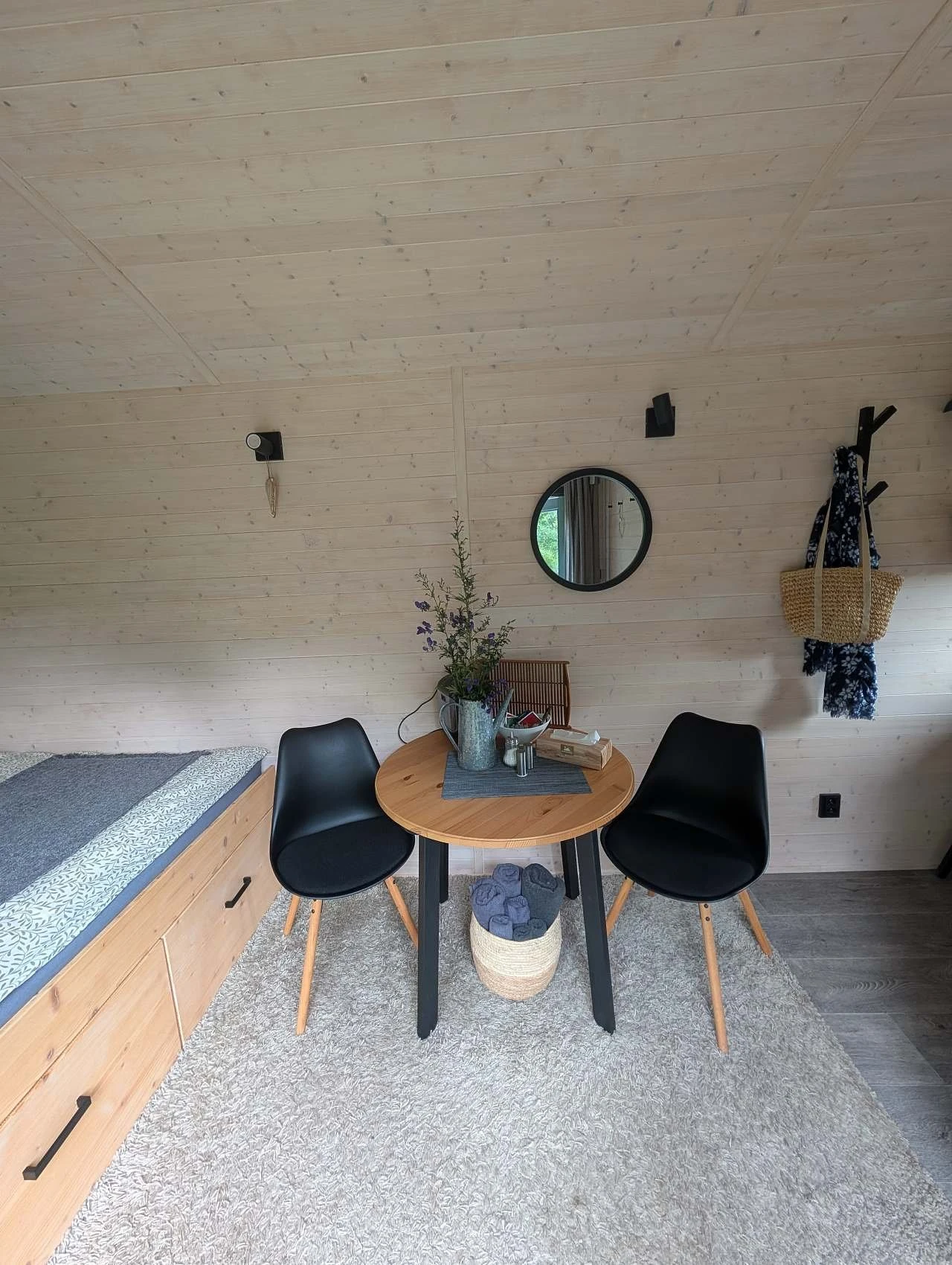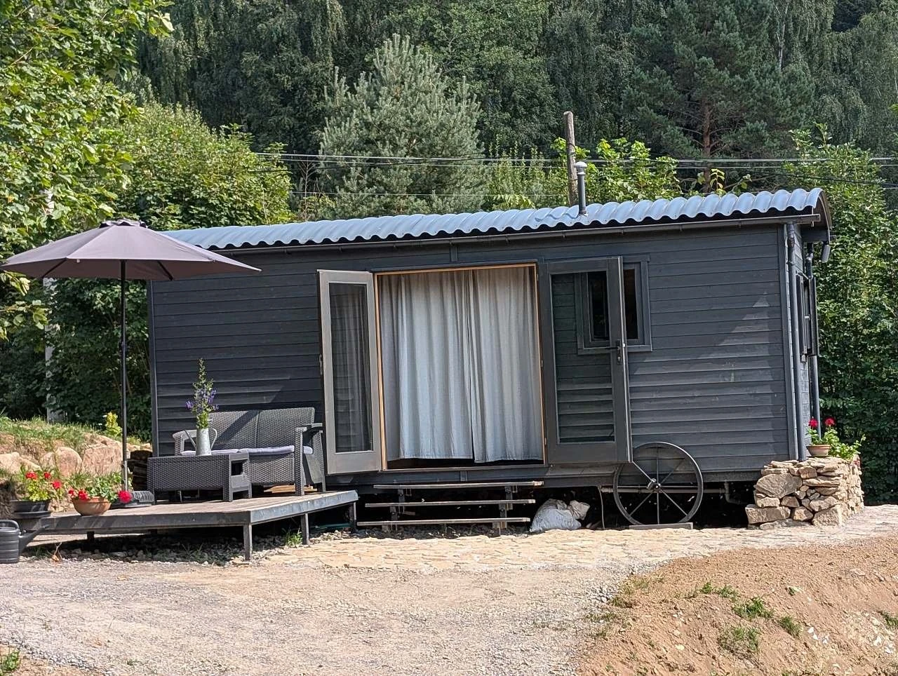 Součástí vnitřního vybavení je lednička a sprchový kout. K dispozici je také venkovní zázemí, které zahrnuje terasu, zahradní nábytek a ohniště pro běžné využití.