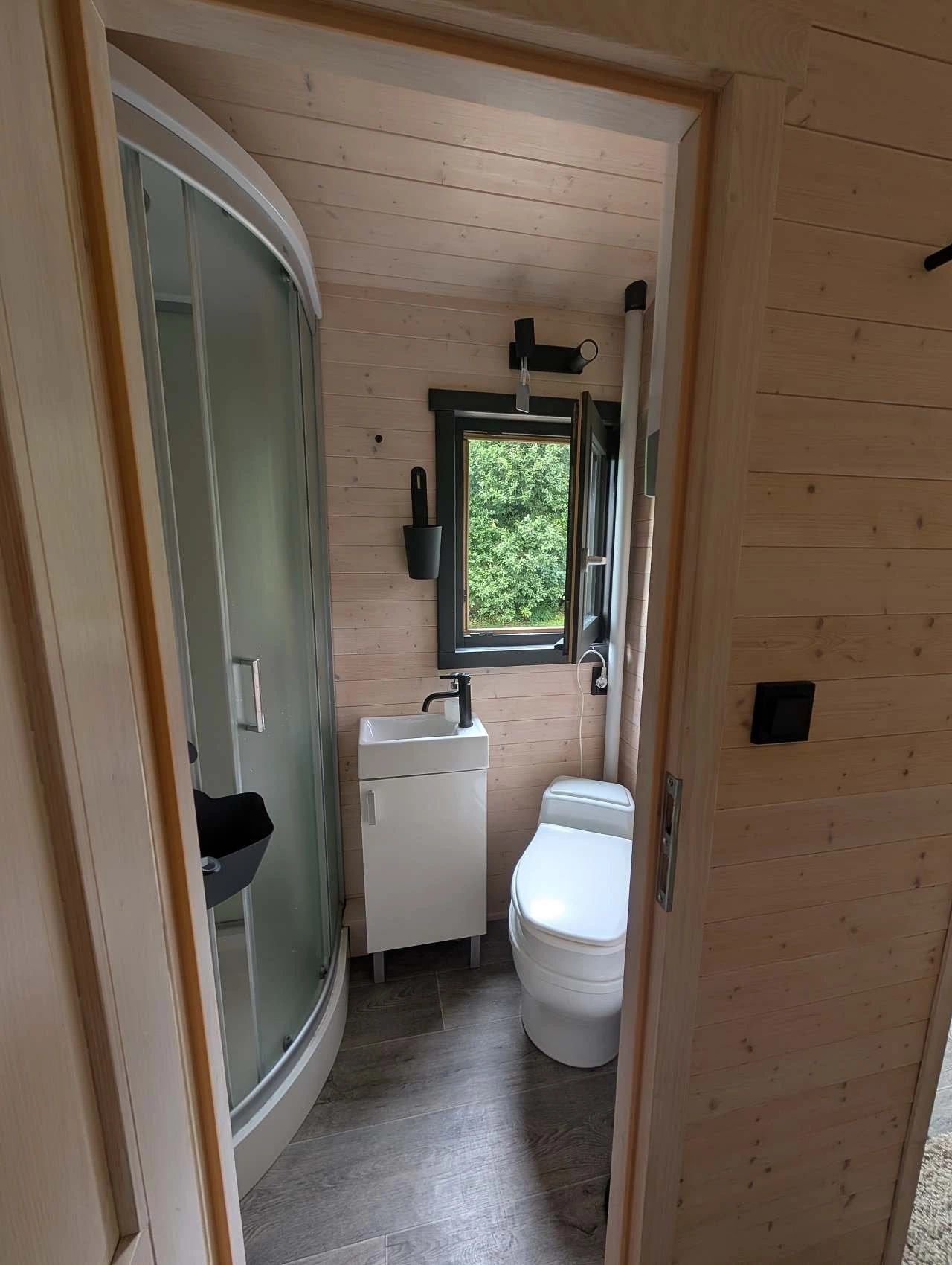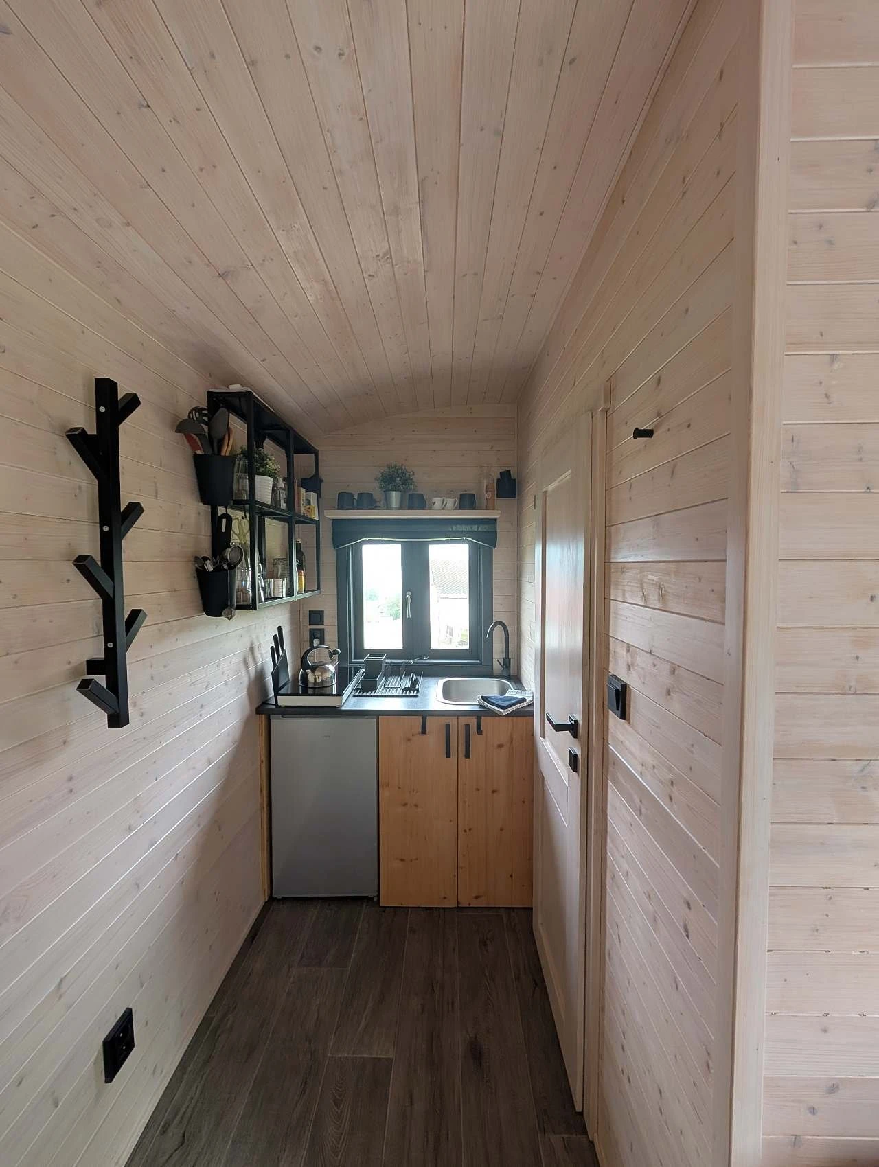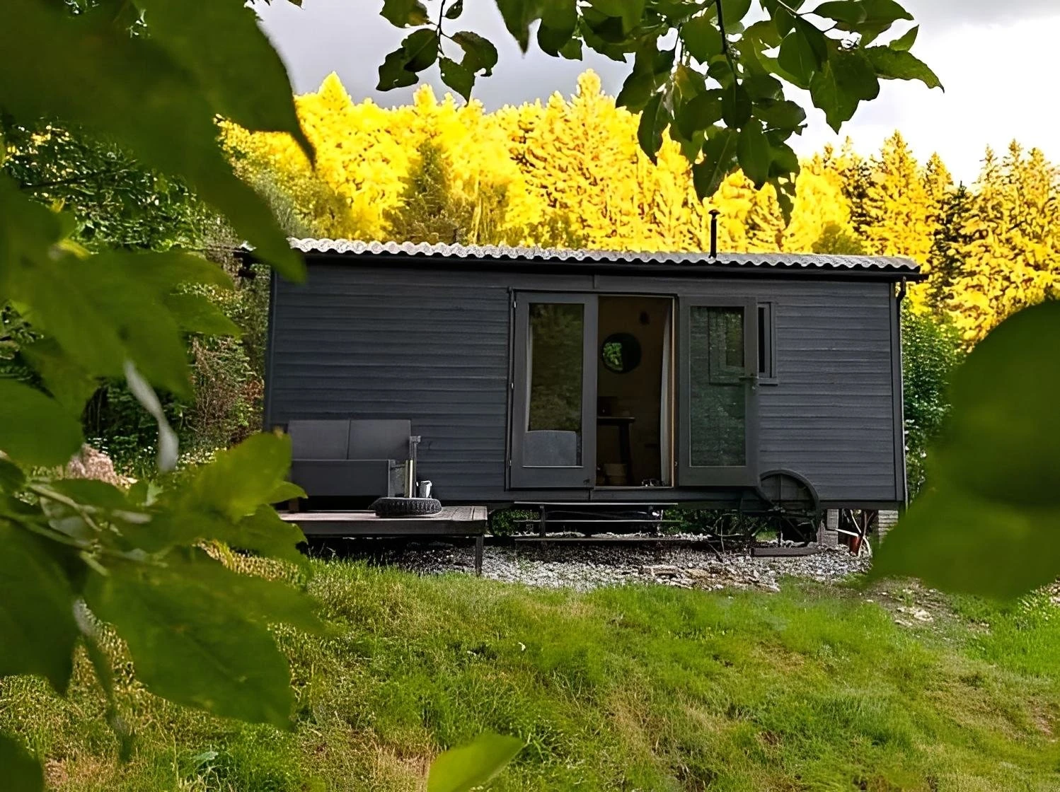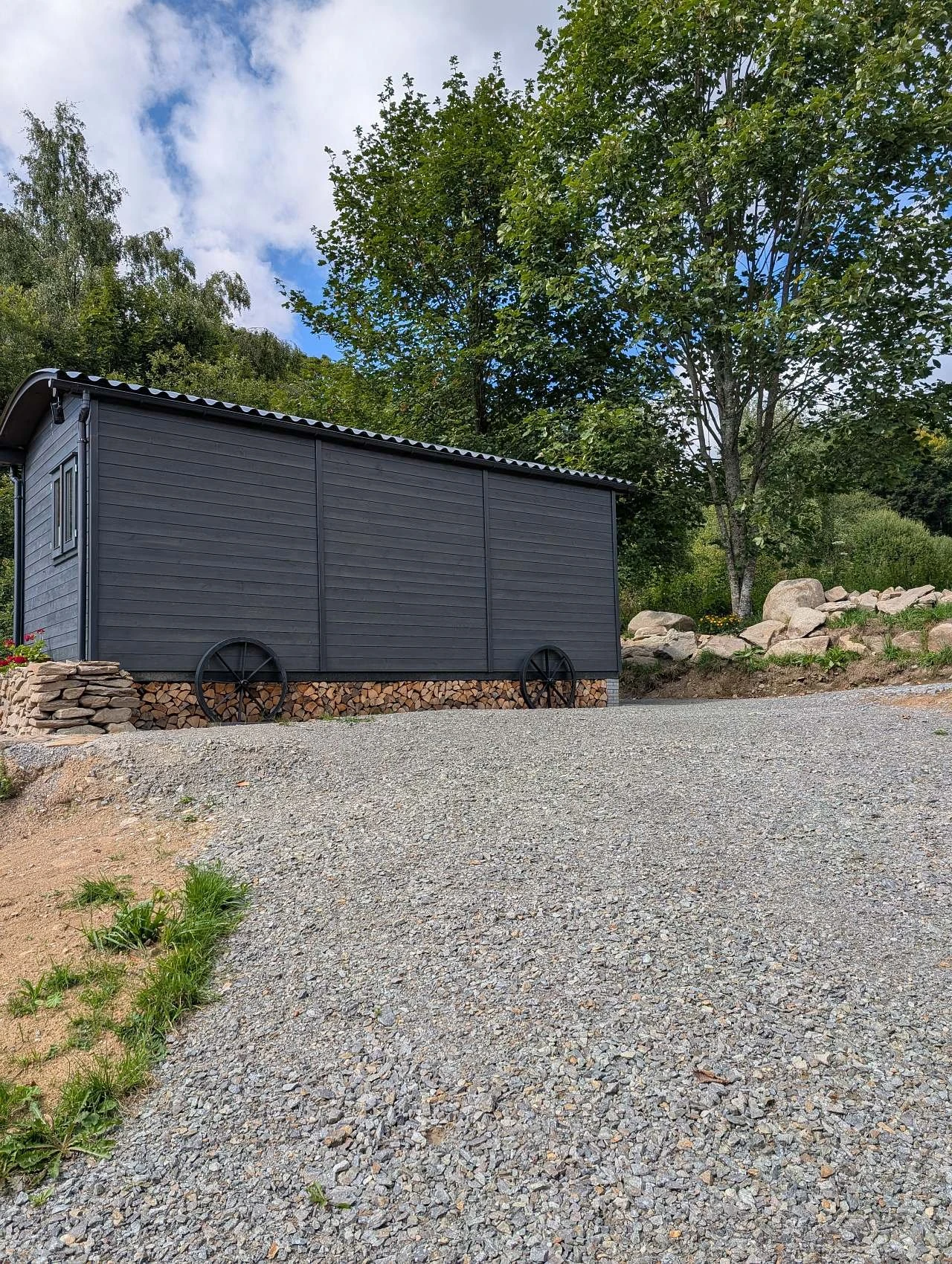 Součástí vnitřního vybavení je lednička a sprchový kout. K dispozici je také venkovní zázemí, které zahrnuje terasu, zahradní nábytek a ohniště pro běžné využití.