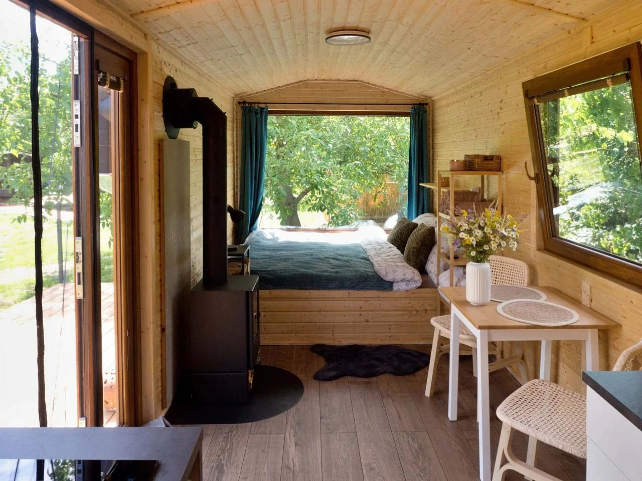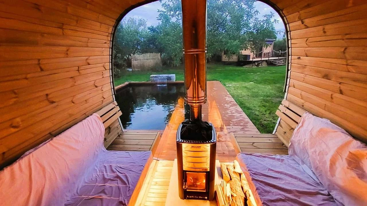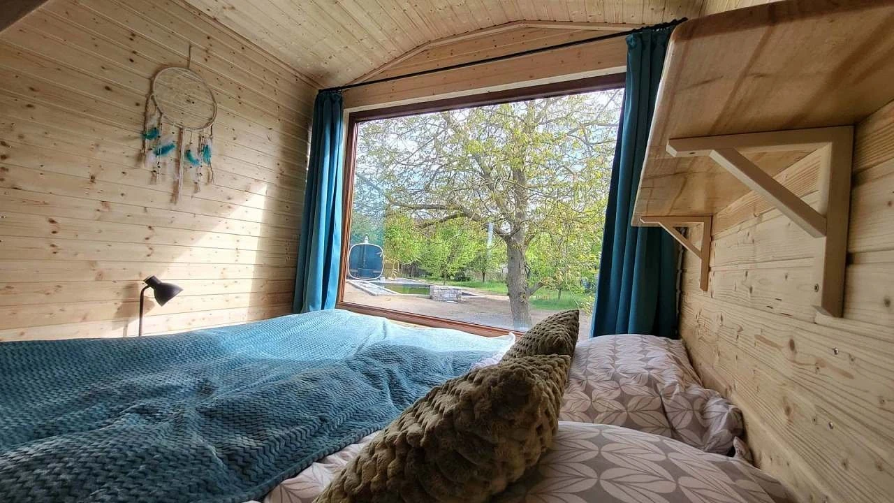 Součástí maringotky je manželská postel s kvalitní matrací, teplé peřiny a krbová kamna na dřevo, která slouží jako hlavní zdroj vytápění. K dispozici jsou také ručníky, ložní prádlo a župany do sauny.
