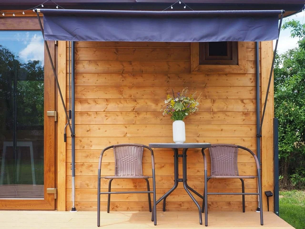 Ve venkovním prostoru mohou hosté využívat terasové posezení, ohniště s grilem a 5metrovou houpačku pro dvě osoby. K dispozici je také venkovní posezení vhodné pro relaxaci i stravování.
