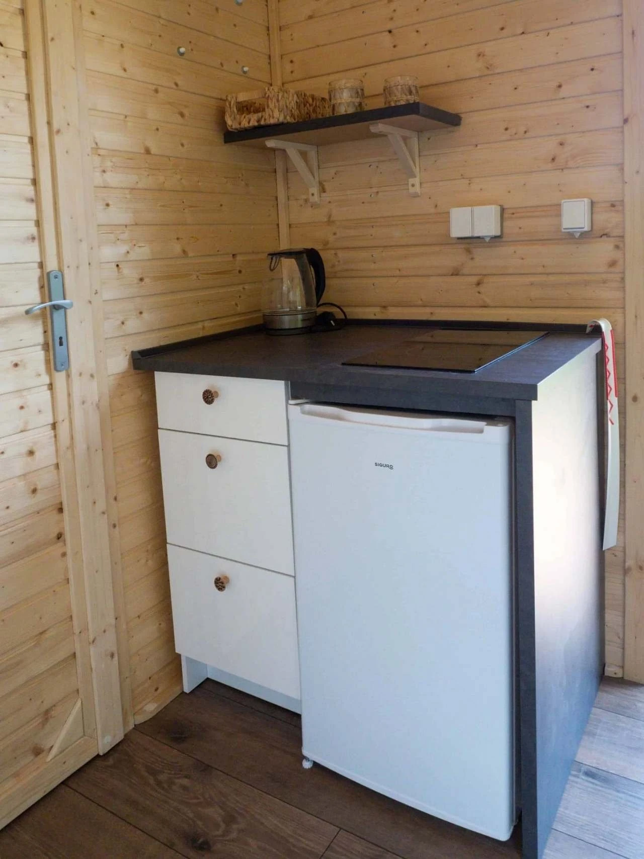 K dispozici je malá, ale plně vybavená kuchyňka, která umožňuje základní vaření i stolování. Kuchyňské vybavení zahrnuje sklokeramickou varnou desku se dvěma plotýnkami, malou lednici, rychlovarnou konvici, dřez, pánev, základní kuchyňské náčiní a základní pochutiny (čaj, káva, cukr, sůl, olej, ocet). Samozřejmostí jsou utěrky a mycí prostředky.