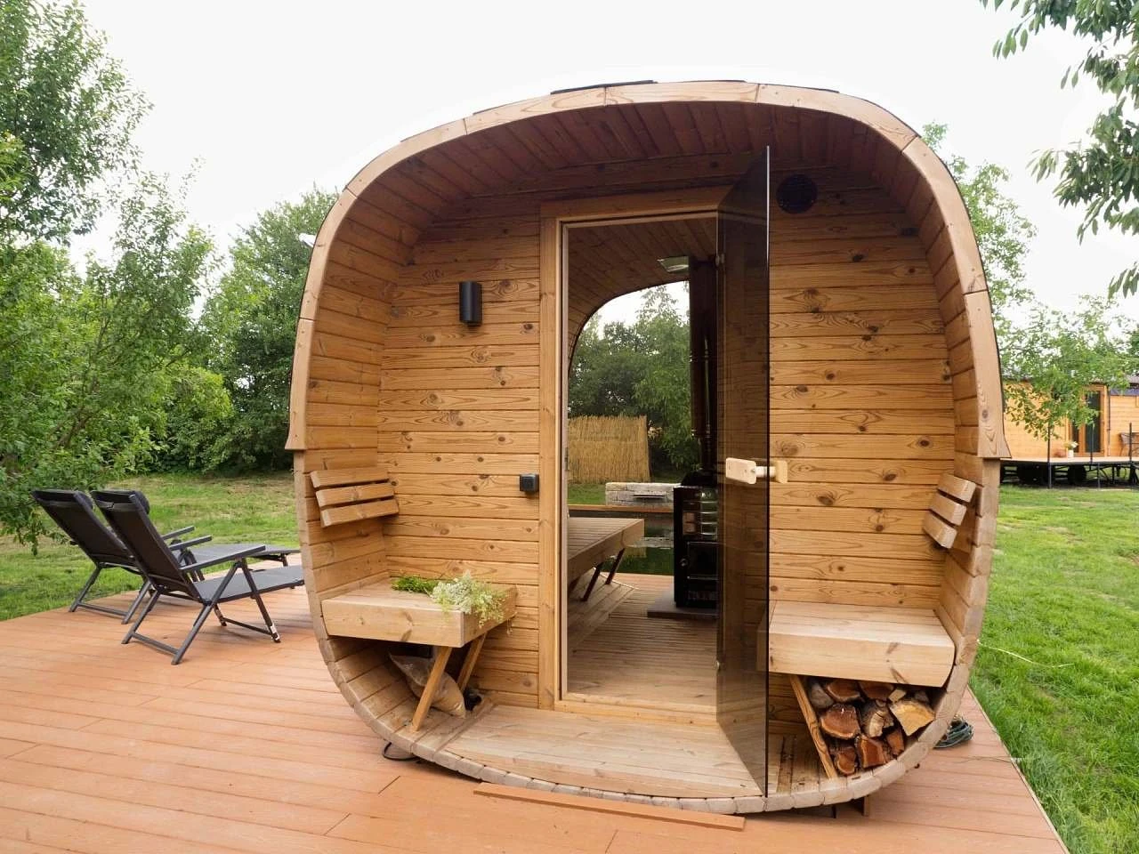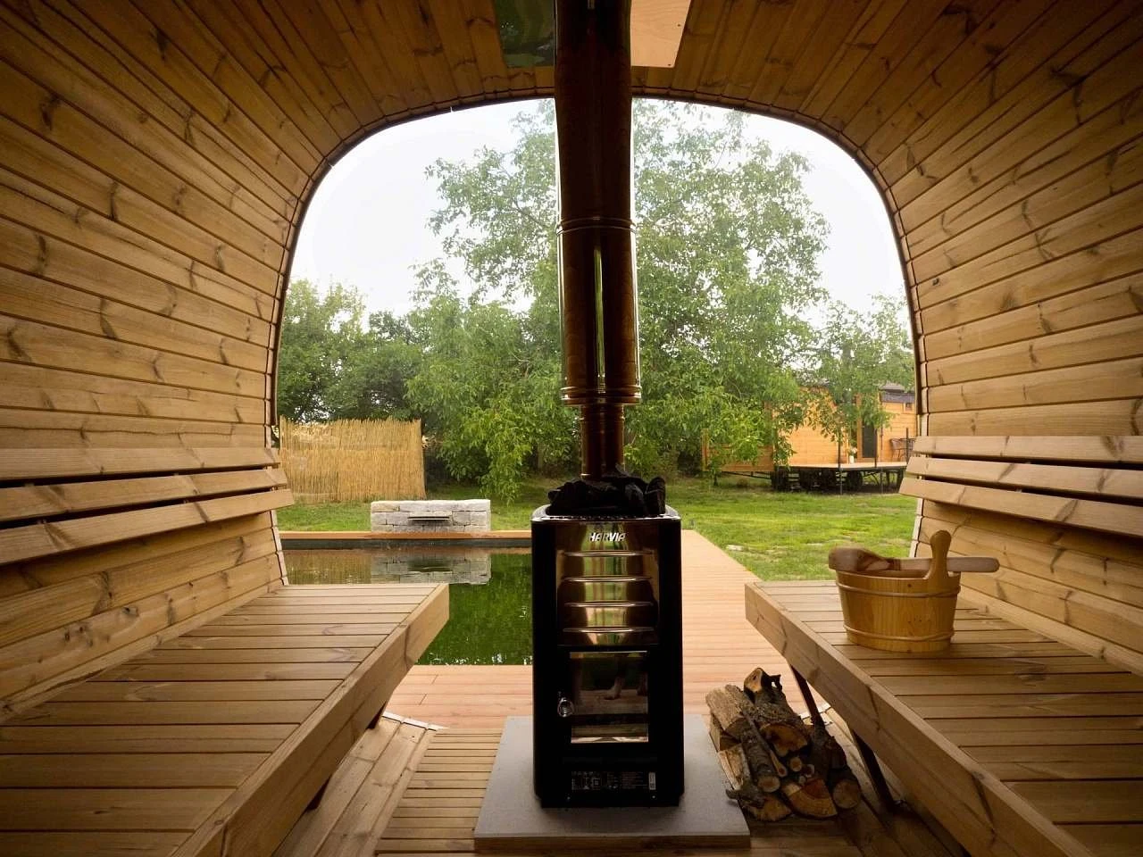 Součástí pobytu je privátní wellness, které zahrnuje panoramatickou finskou saunu, vyhřívaný koupací sud s vířivkou a zahradní koupací jezírko. Wellness je k dispozici neomezeně během pobytu.